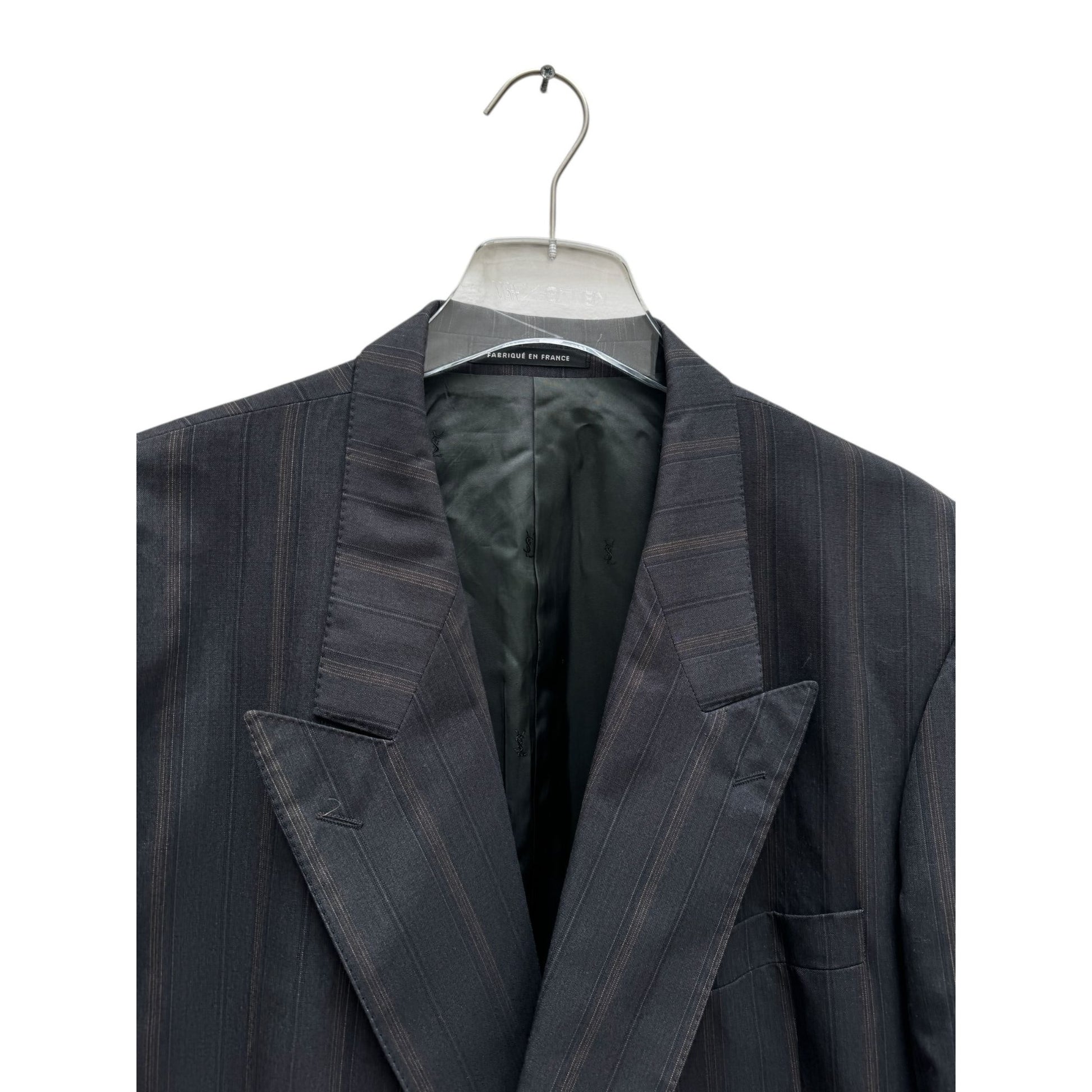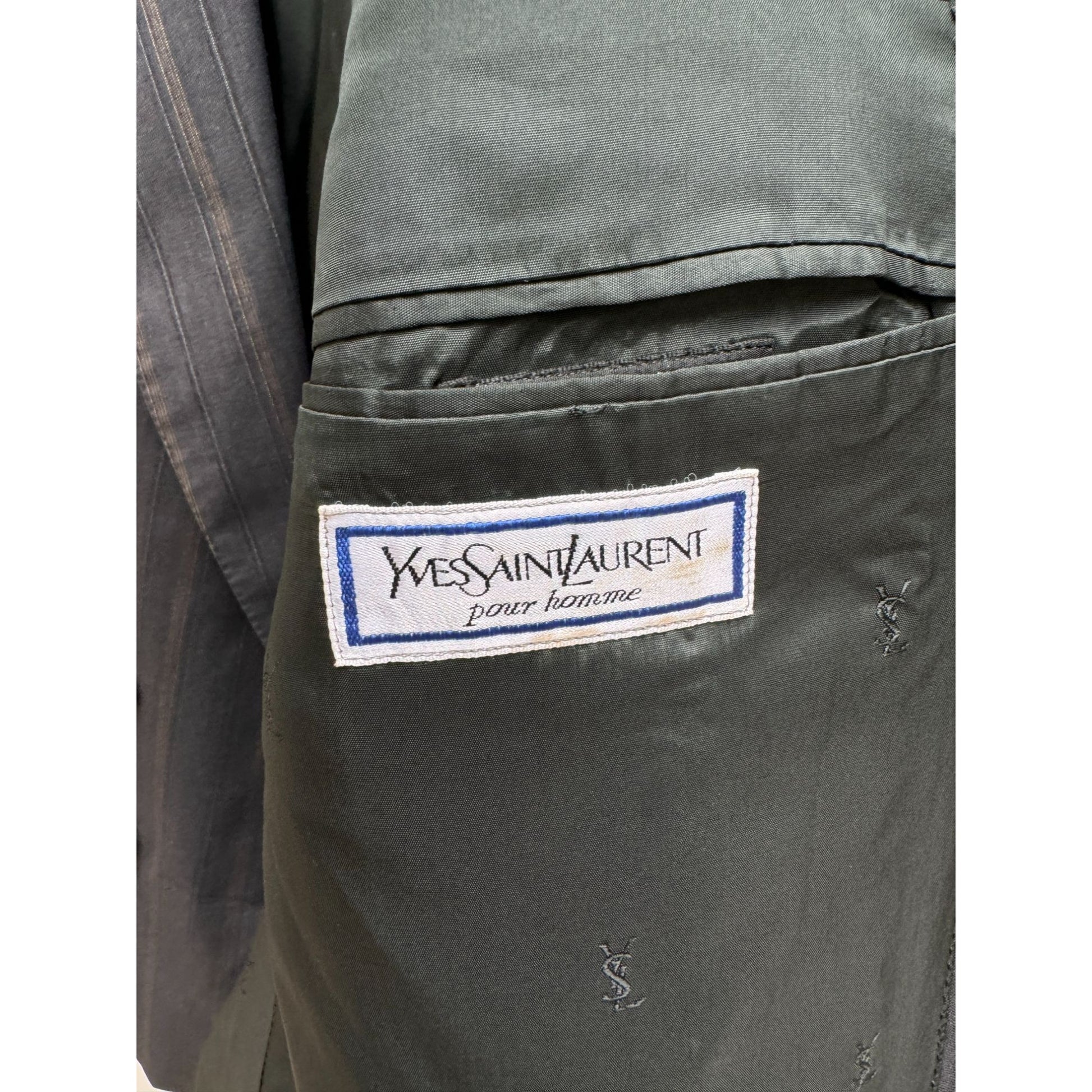 The double-breasted front and wide peak lapels evoke the power dressing era of the late 1980s and early 1990s, when Yves Saint Laurent reimagined classic tailoring with a modern Parisian edge. The piece is fully lined, with embroidered YSL monograms throughout the interior, showcasing meticulous attention to detail and craftsmanship.