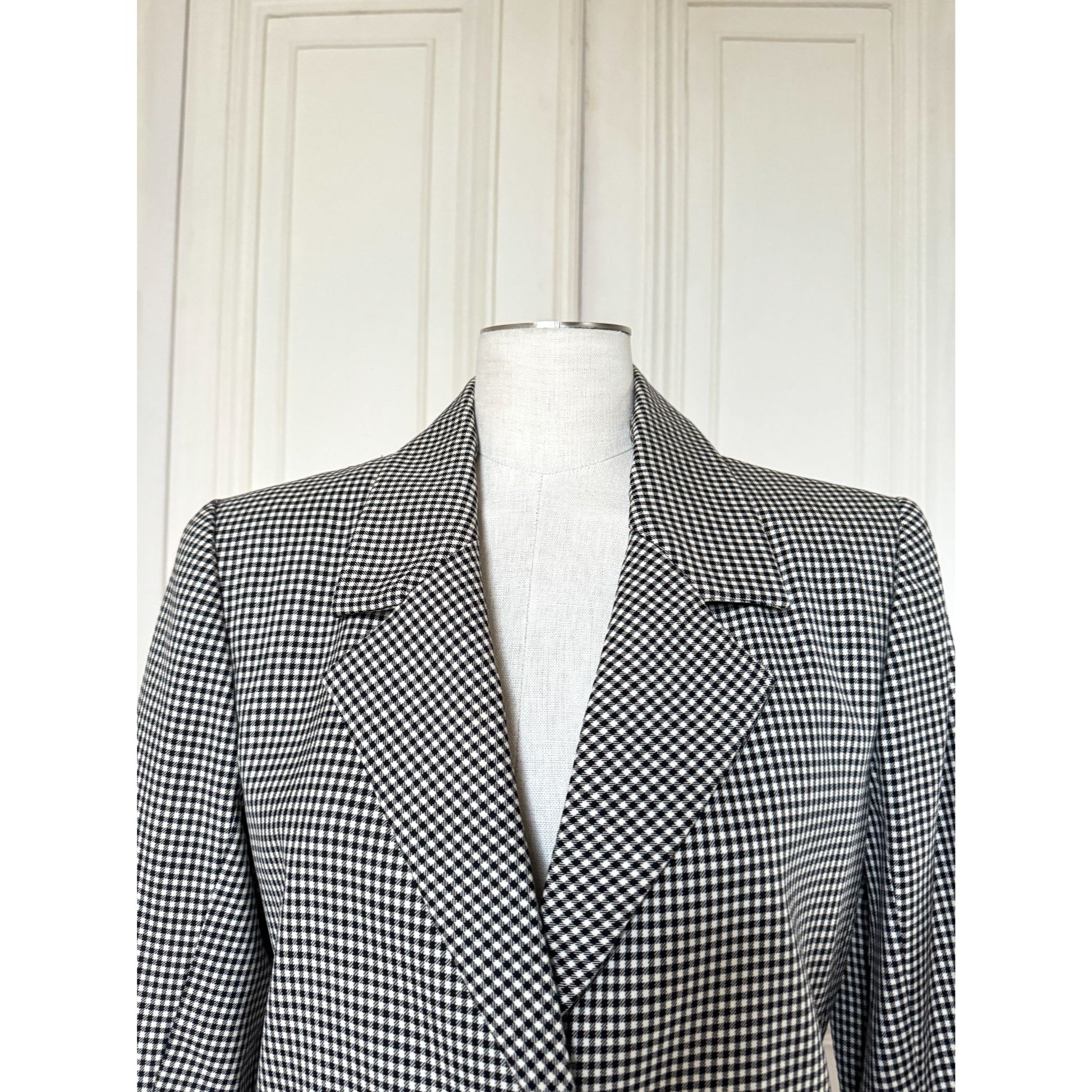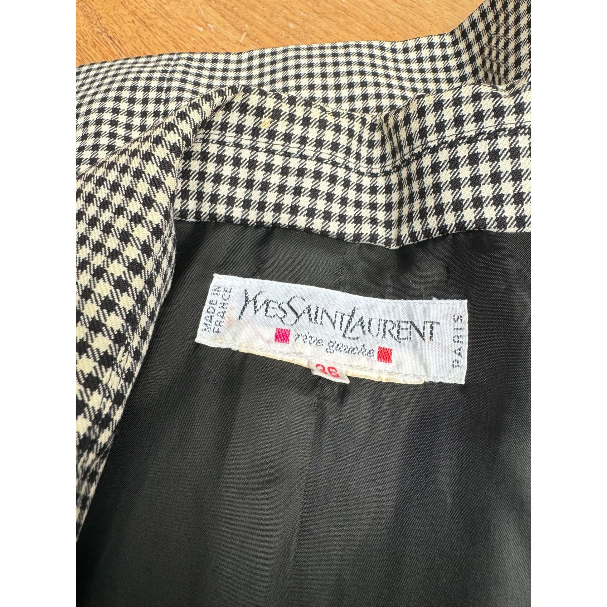 An elegant and timeless blazer from Yves Saint Laurent Rive Gauche, crafted in a classic black-and-white houndstooth wool.