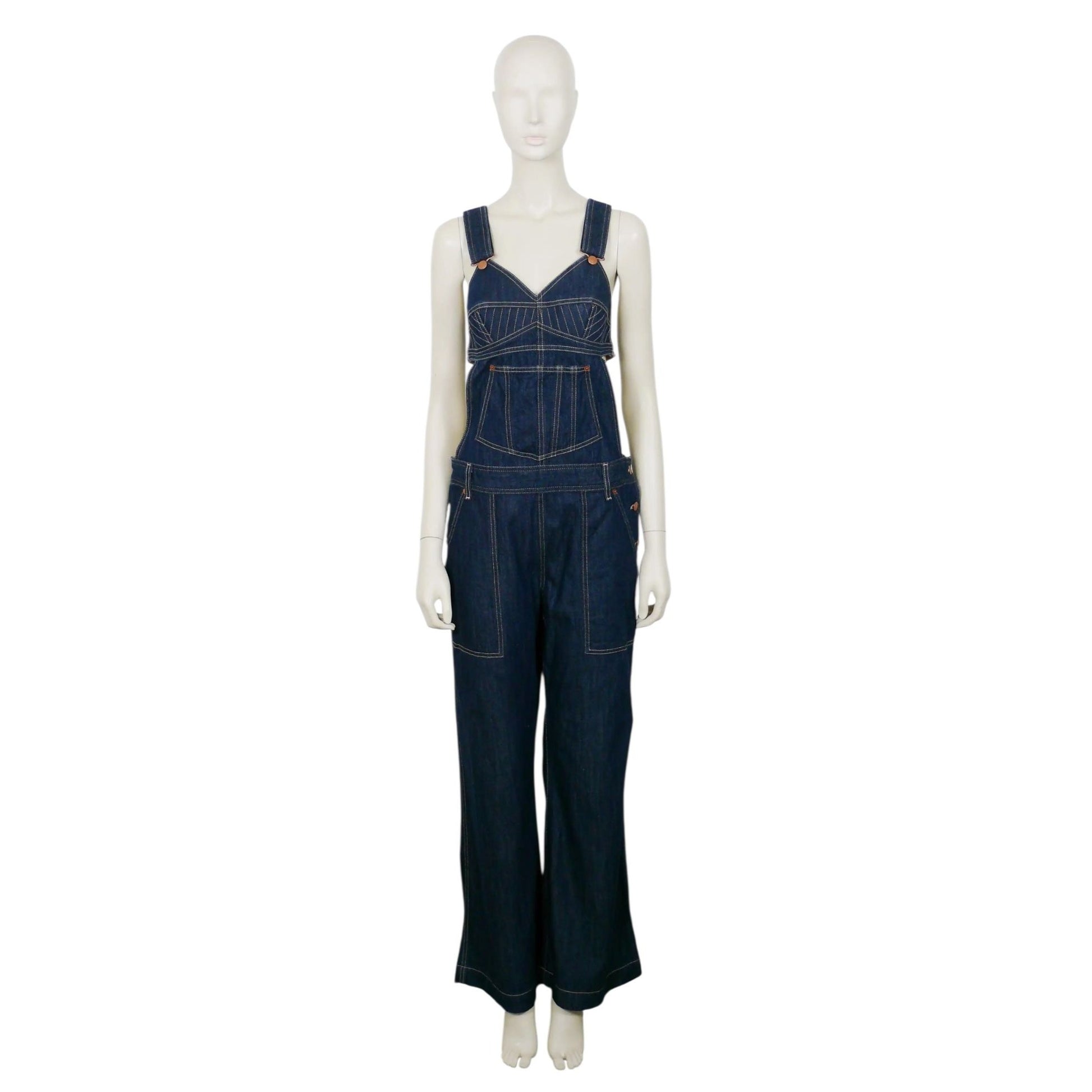 Crafted in structured raw cotton denim, this jumpsuit features a corset-inspired bustier top with contrast stitching that highlights the body’s natural lines. The thick denim straps cross at the back, fastening with copper rivets, while the waistline is sharply constructed with utility-style patch pockets.