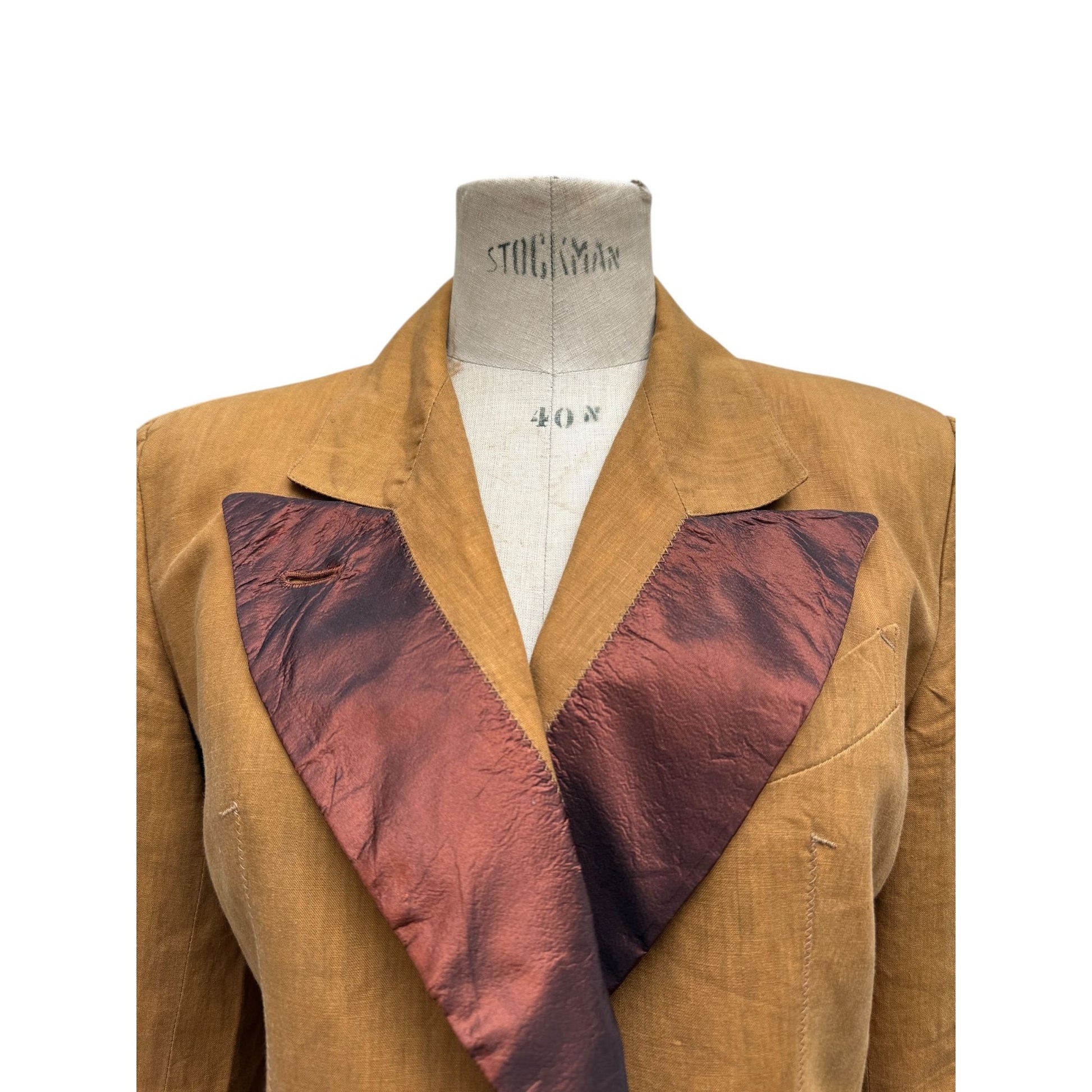 An exceptional Jean Paul Gaultier creation from the 1990s, this blazer showcases the designer’s mastery in blending sharp tailoring with unexpected contrasts. Crafted from 100% linen in a warm brown tone, it is elevated by dramatic silk lapels in a lustrous burgundy hue, adding both sophistication and a bold twist to a classic silhouette.