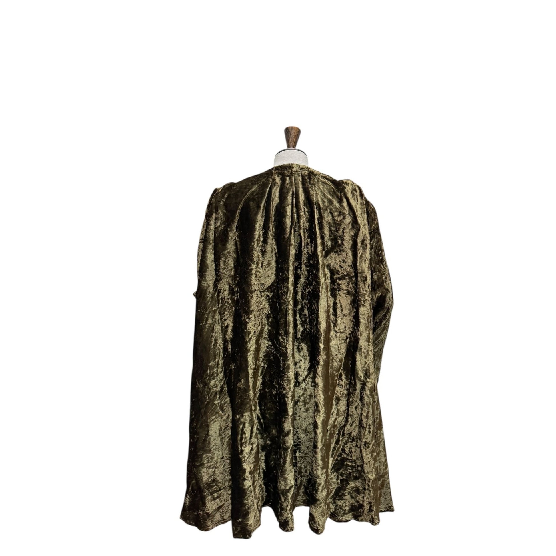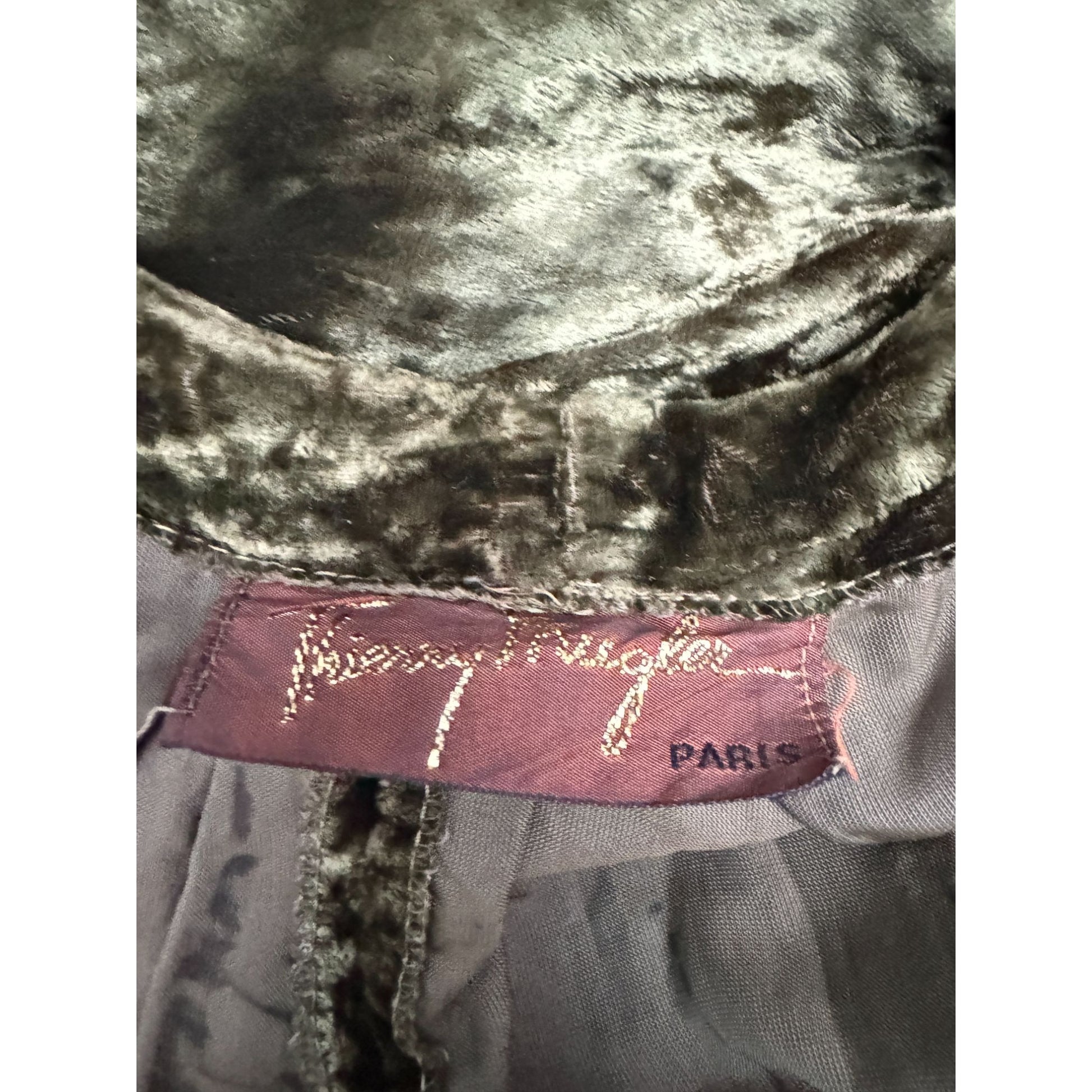 A stunning early Thierry Mugler piece that captures the drama and softness of his late-1970s work. Cut from a luminous crushed velvet that shifts beautifully between brown, champagne and deep gold, the dress falls in generous folds from the neckline, creating an elegant, fluid silhouette.