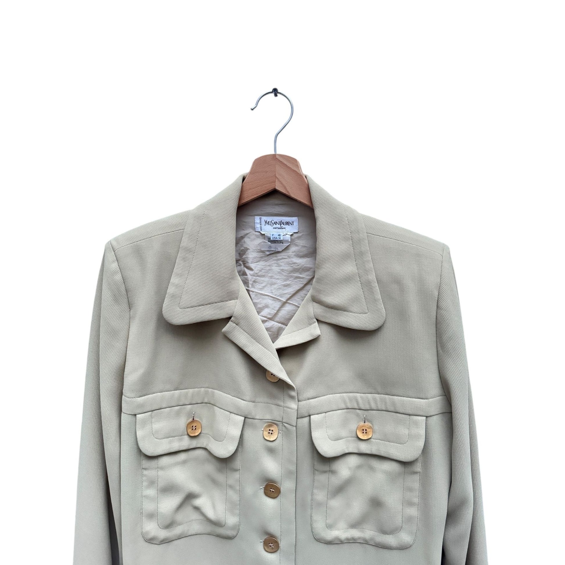 Beautiful vintage YSL Variation safari-style shirt in a light beige tone. Features 2 signature flap pockets with wooden-style buttons and soft shoulder pads for a structured silhouette.