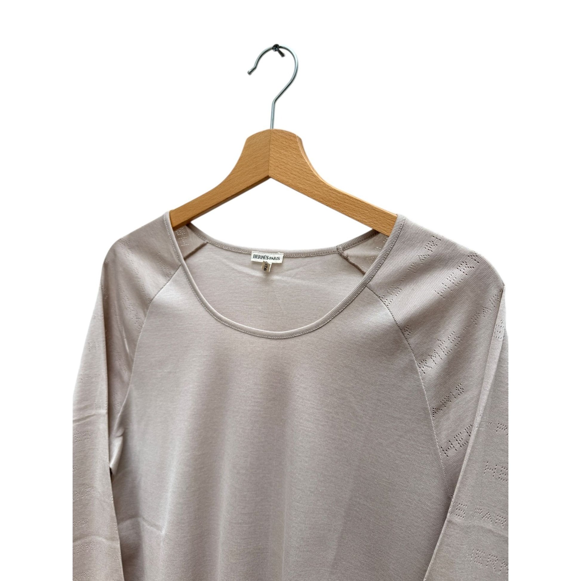 The knit itself reveals the magic: the Hermès name and subtle geometric motifs are woven directly into the fabric, creating texture and depth without visible logos. The result is a refined, timeless piece that works effortlessly with tailoring, denim, or layered under a blazer.