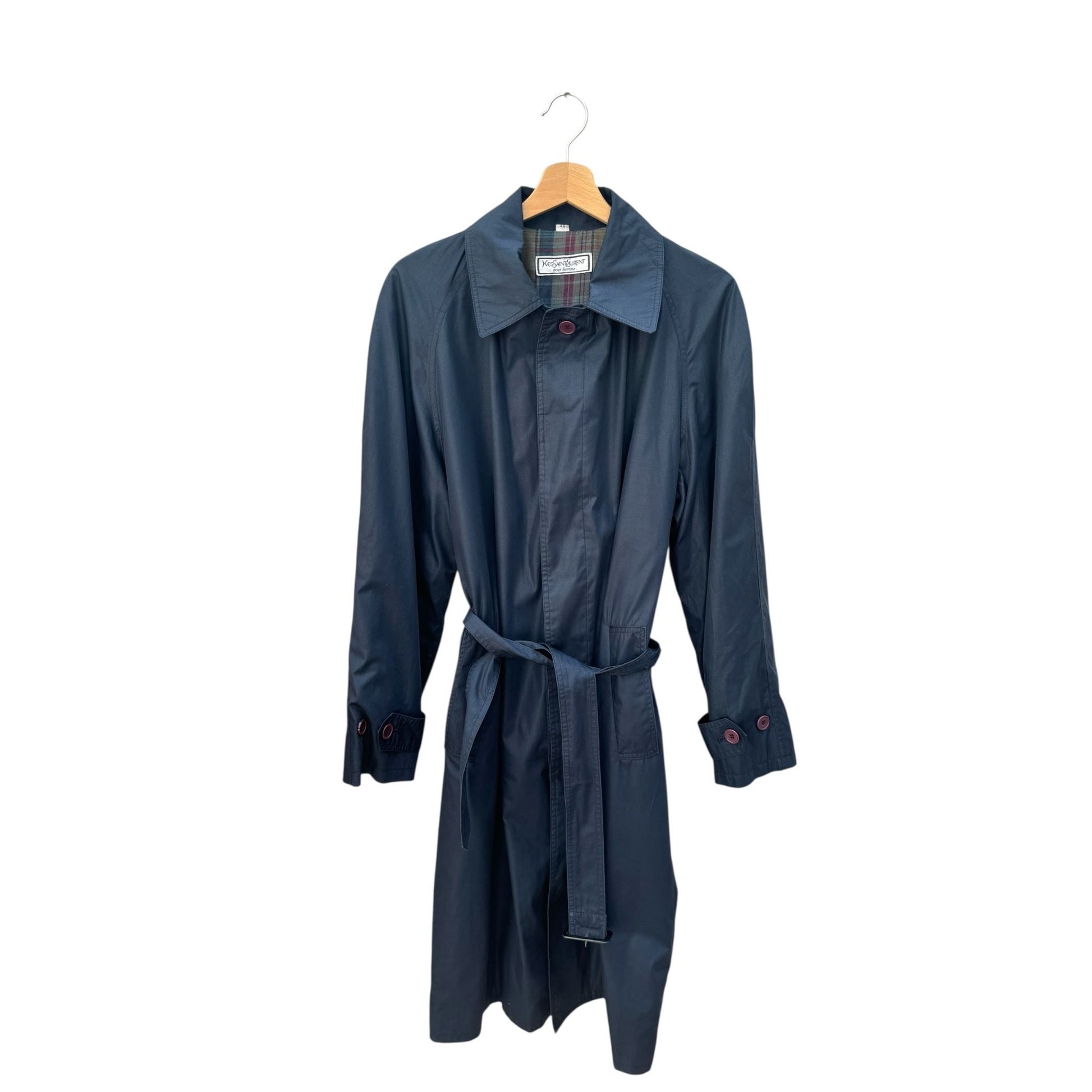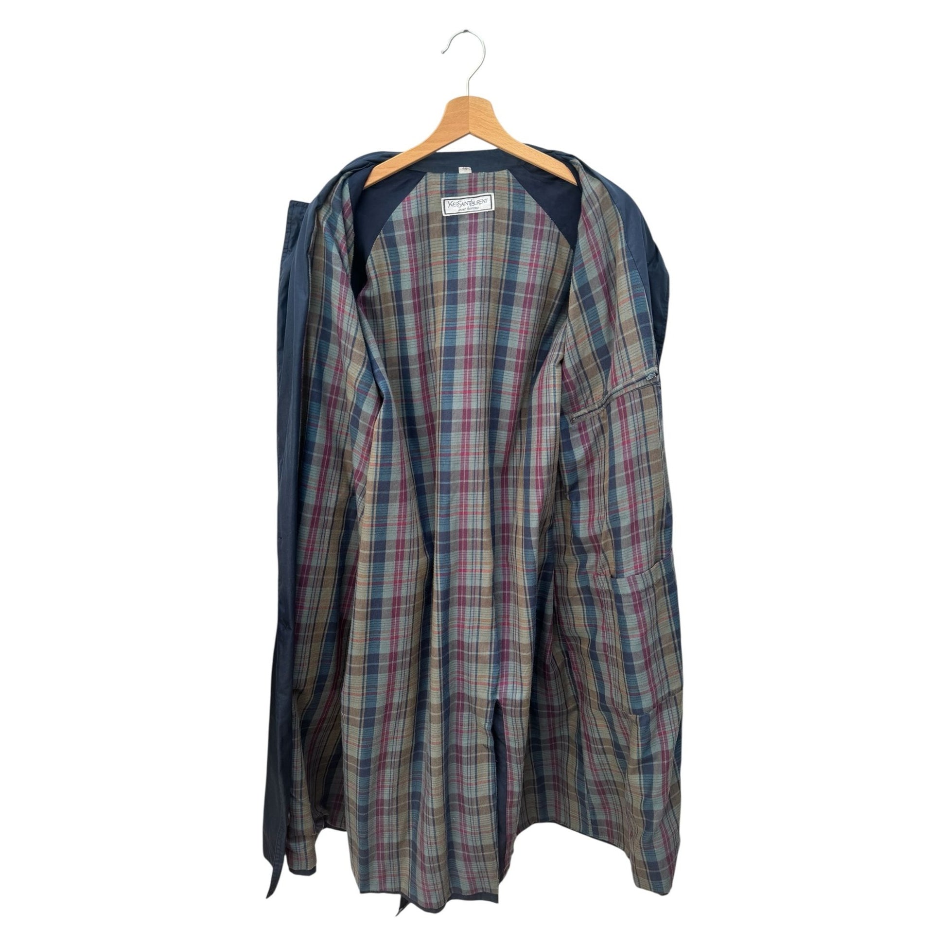 An iconic outerwear staple from Yves Saint Laurent, this vintage trench coat is a masterclass in Parisian tailoring. Cut from a lightweight cotton-blend shell in classic navy, it features a full plaid lining in earthy tones — a subtle but distinctive nod to traditional menswear.
