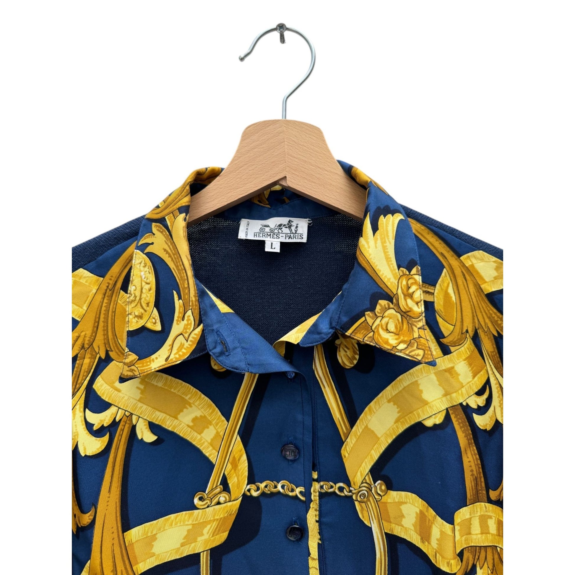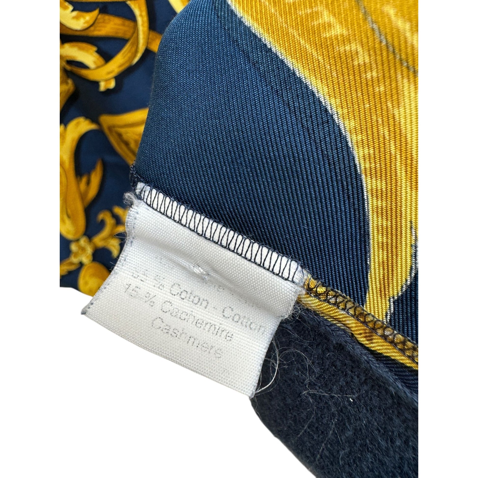 The piece features the brand’s signature equestrian-inspired baroque chain and ribbon motif printed in rich gold tones against a deep navy backdrop — a pattern emblematic of Hermès’ silk legacy. The front silk panel contrasts beautifully with the soft cotton-cashmere knit sleeves and back, creating a tactile play between texture and sheen.