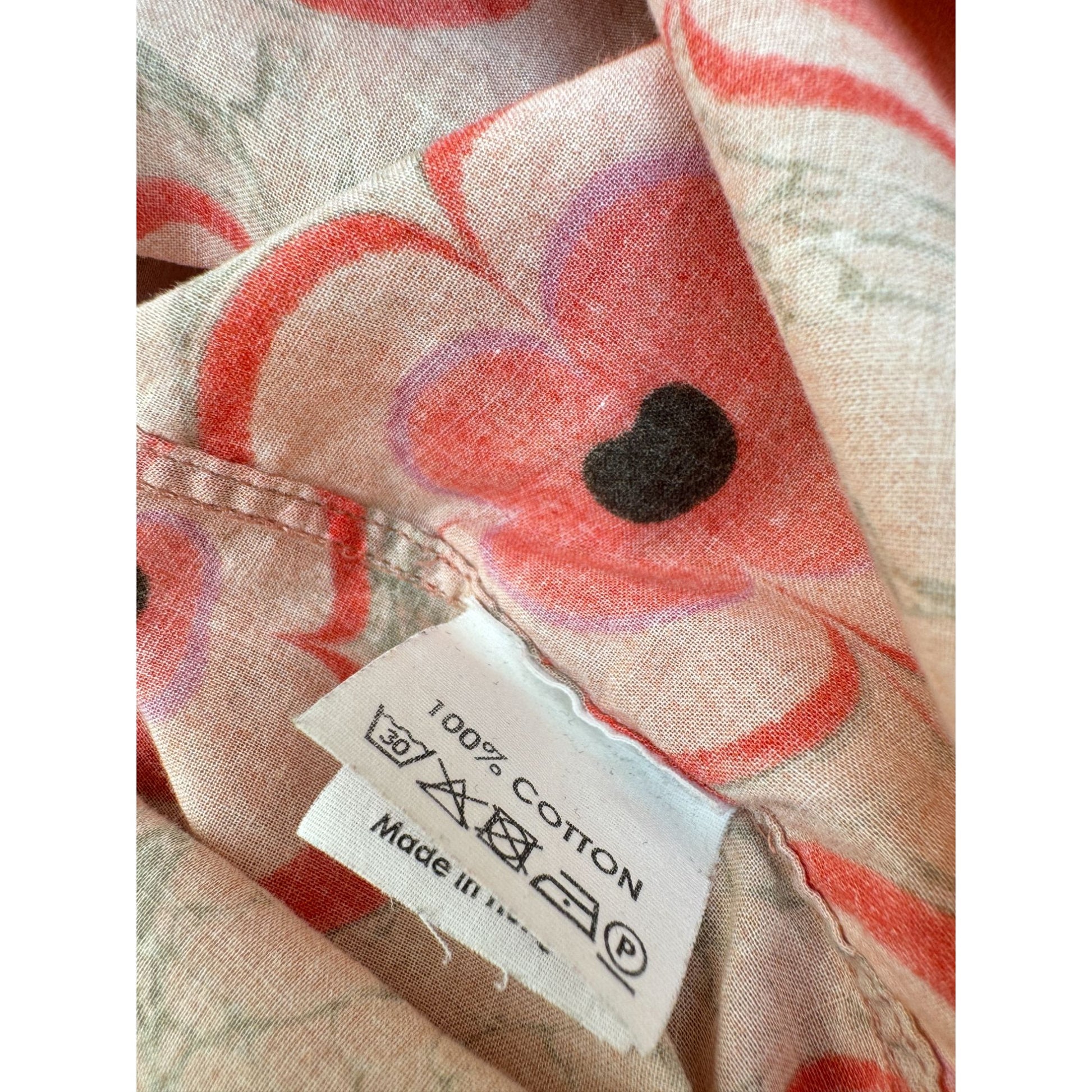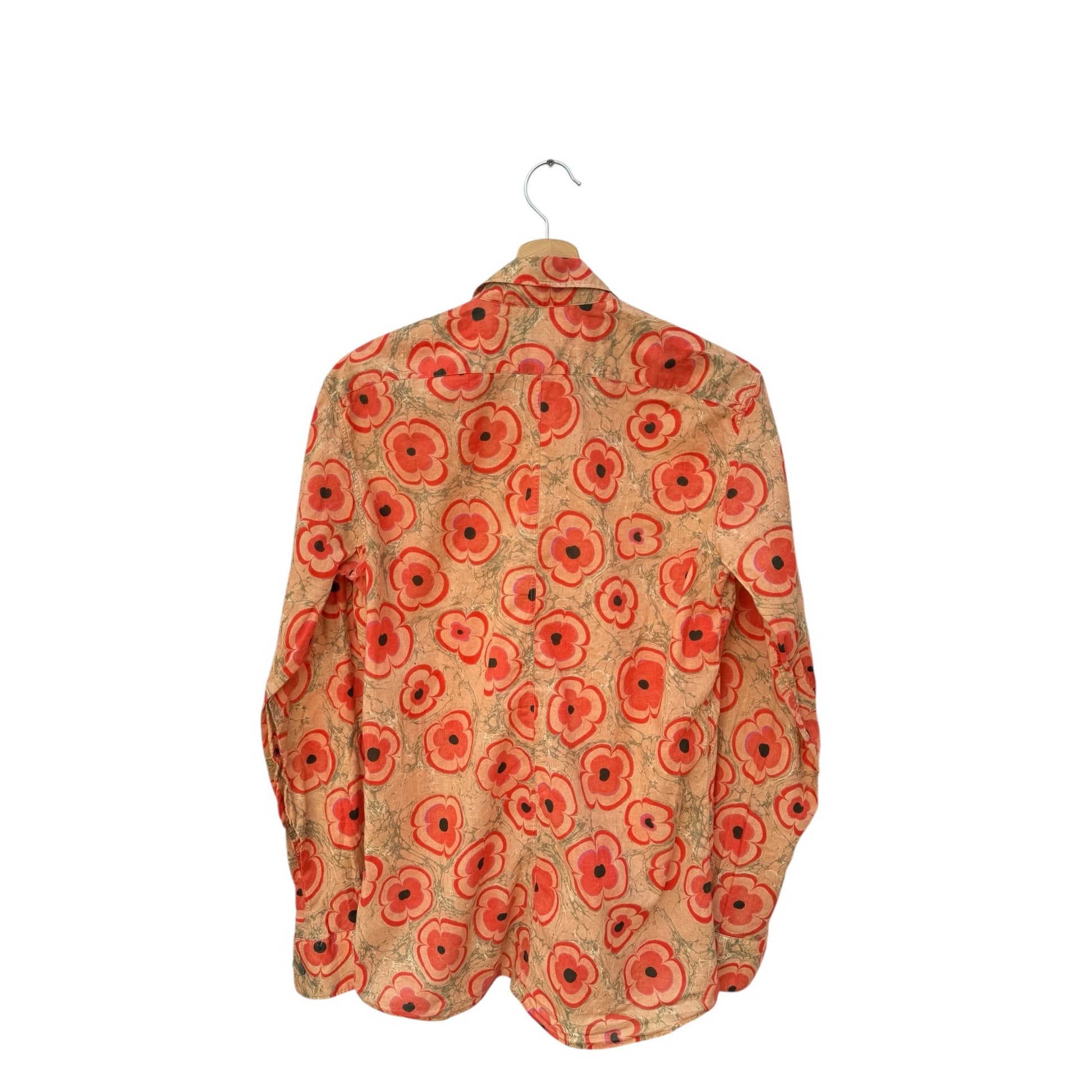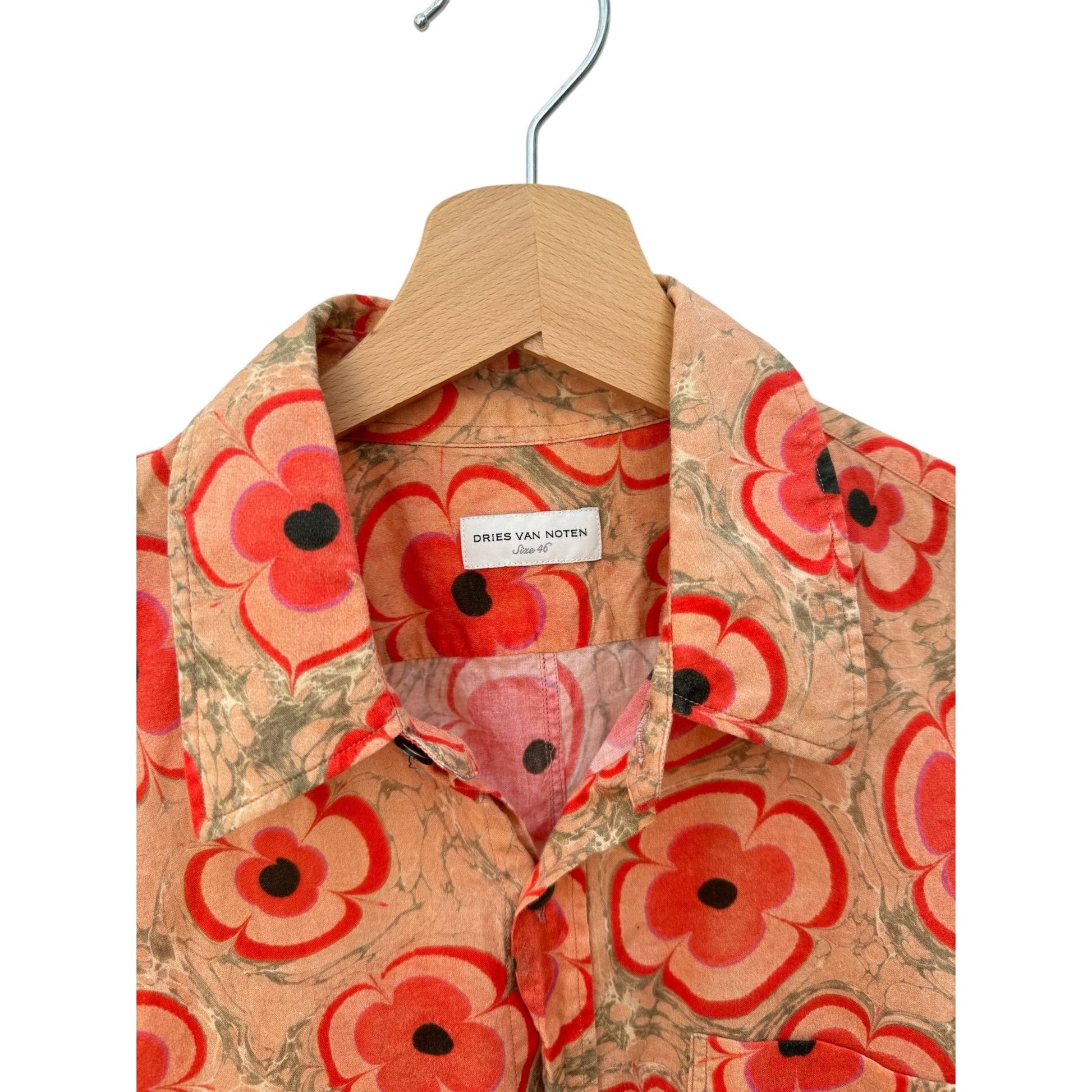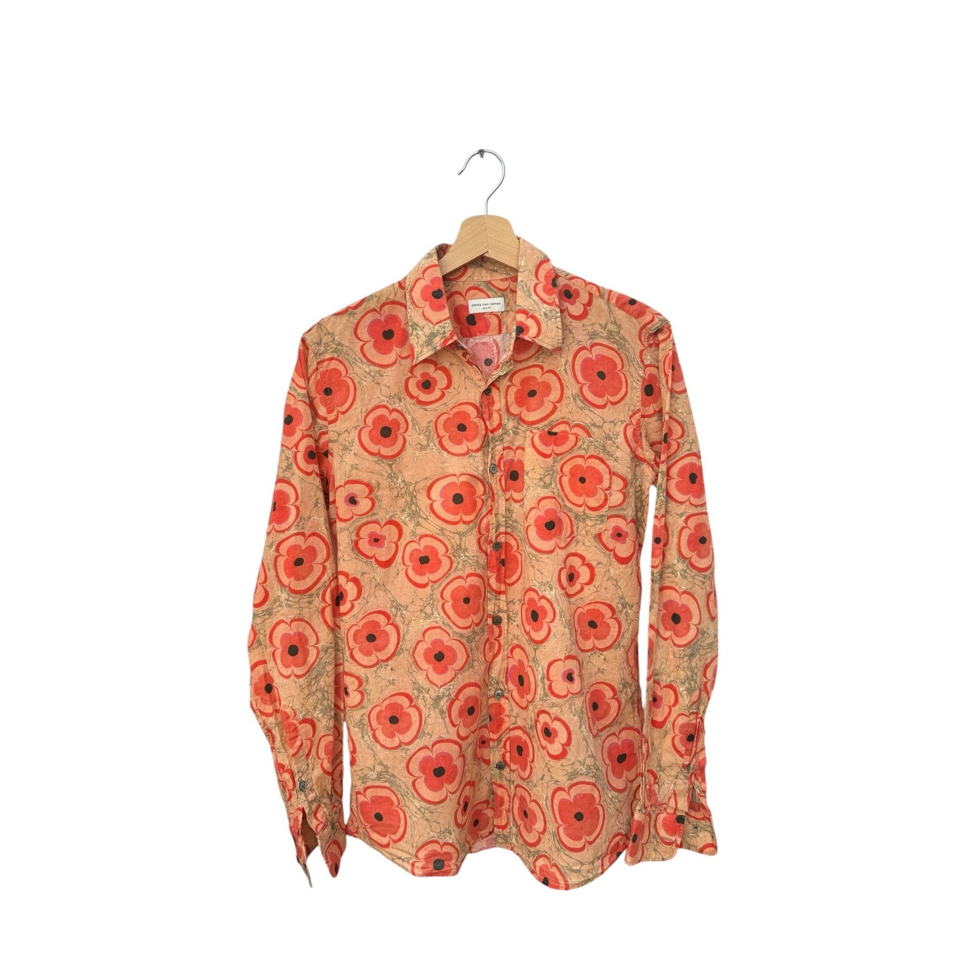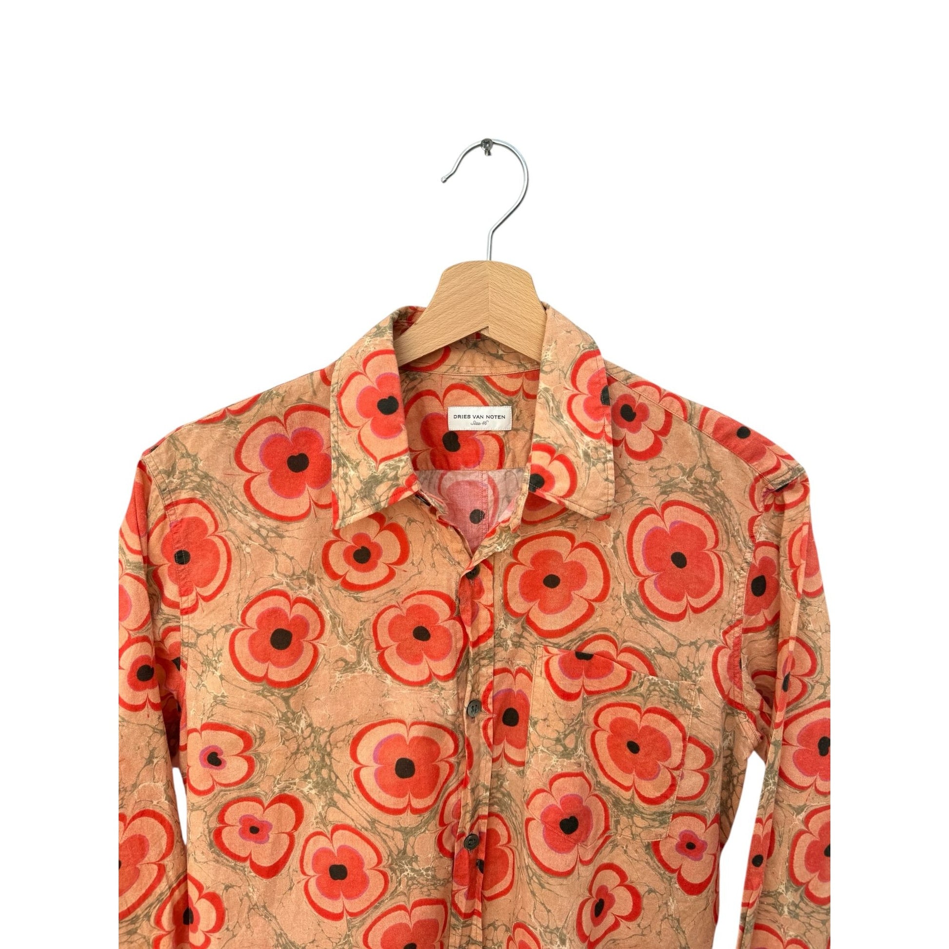 This striking shirt by Dries Van Noten features a bold all-over orange floral print against a marbled beige background. Crafted from sheer lightweight cotton, it has a slightly translucent finish that enhances its airy, effortless appeal.