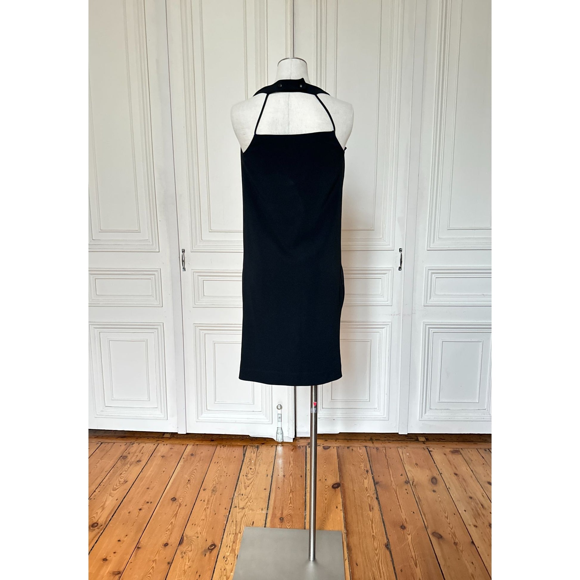 The back reveals a striking open-back construction, secured with slim straps and discreet snap fastenings at the shoulders, offering a subtle yet confident contrast to the dress’s otherwise restrained silhouette. The cut is clean and straight through the body, finishing at a chic knee-length hem, making it equally suited for evening wear or elevated daytime styling.