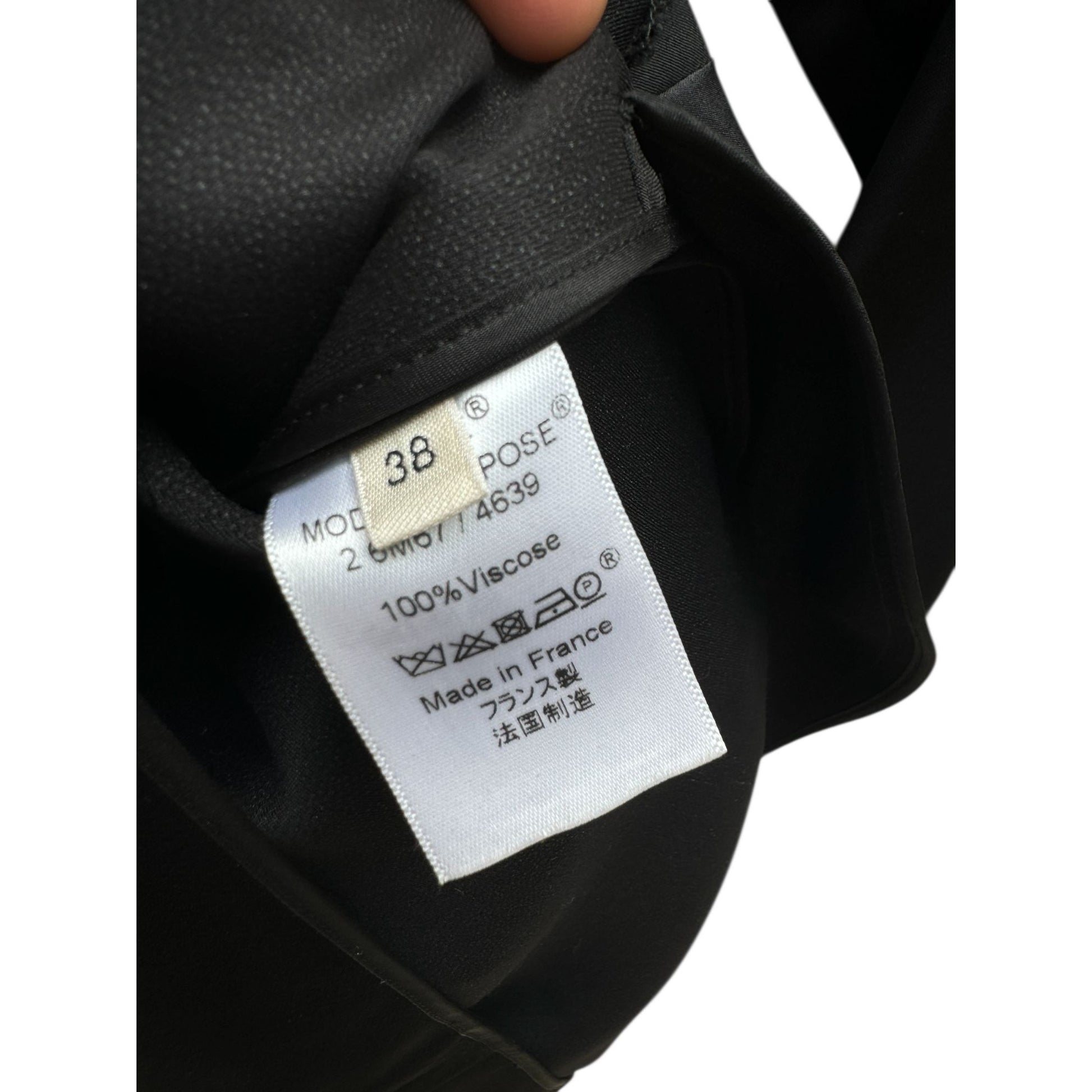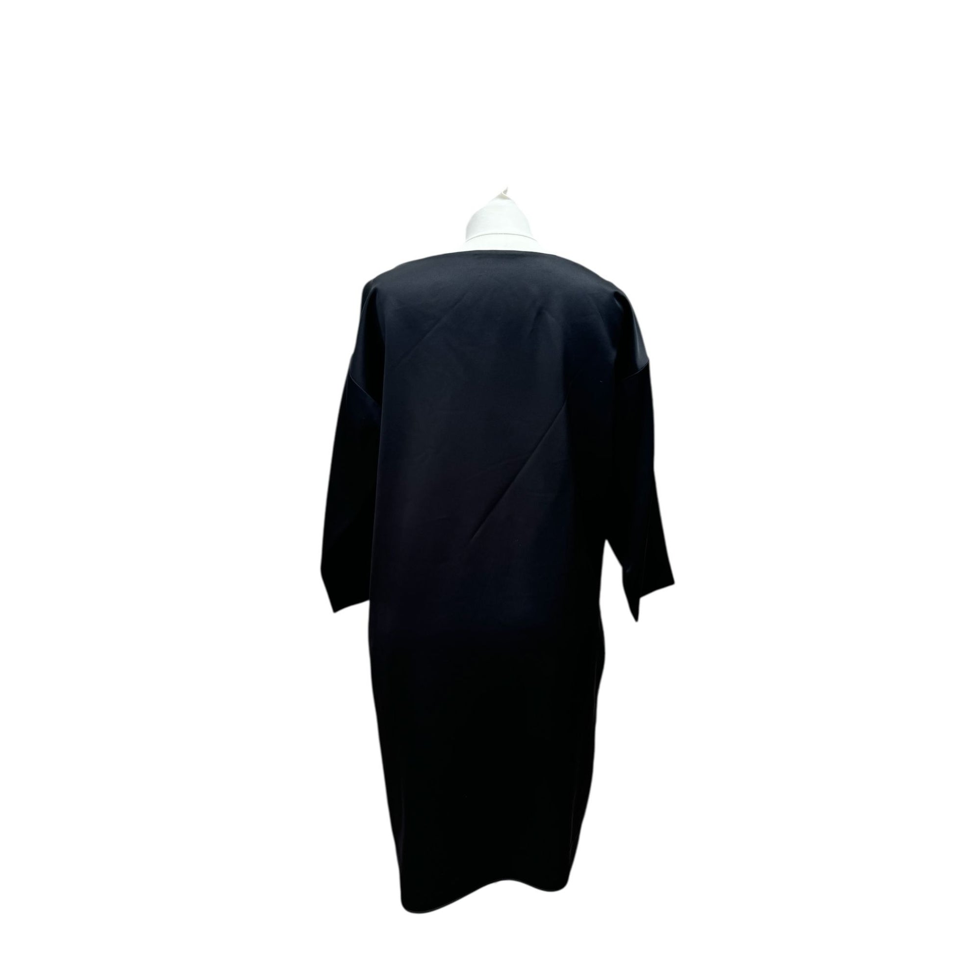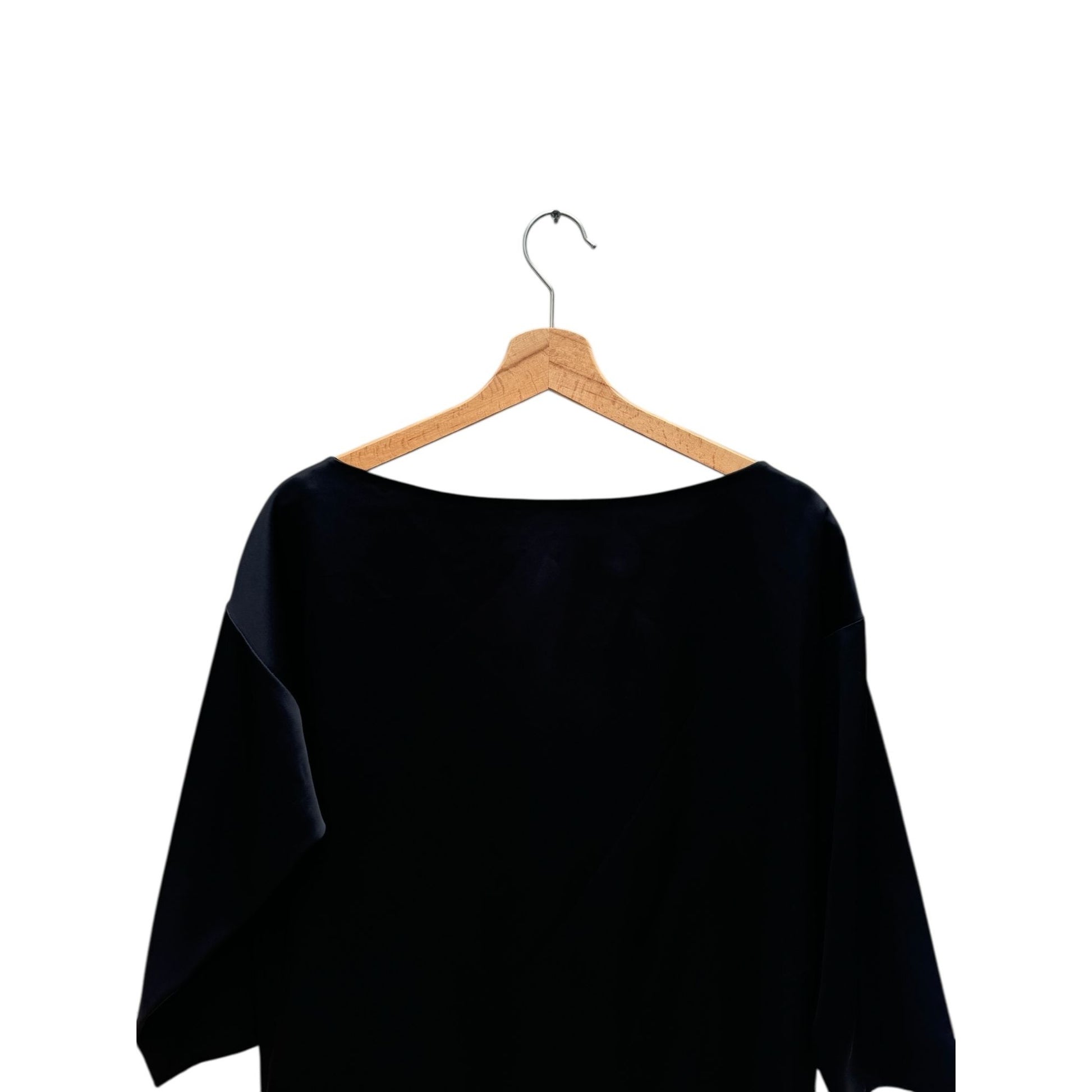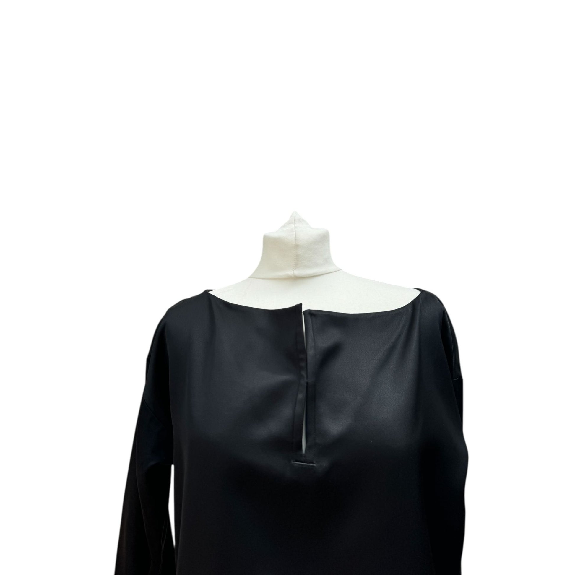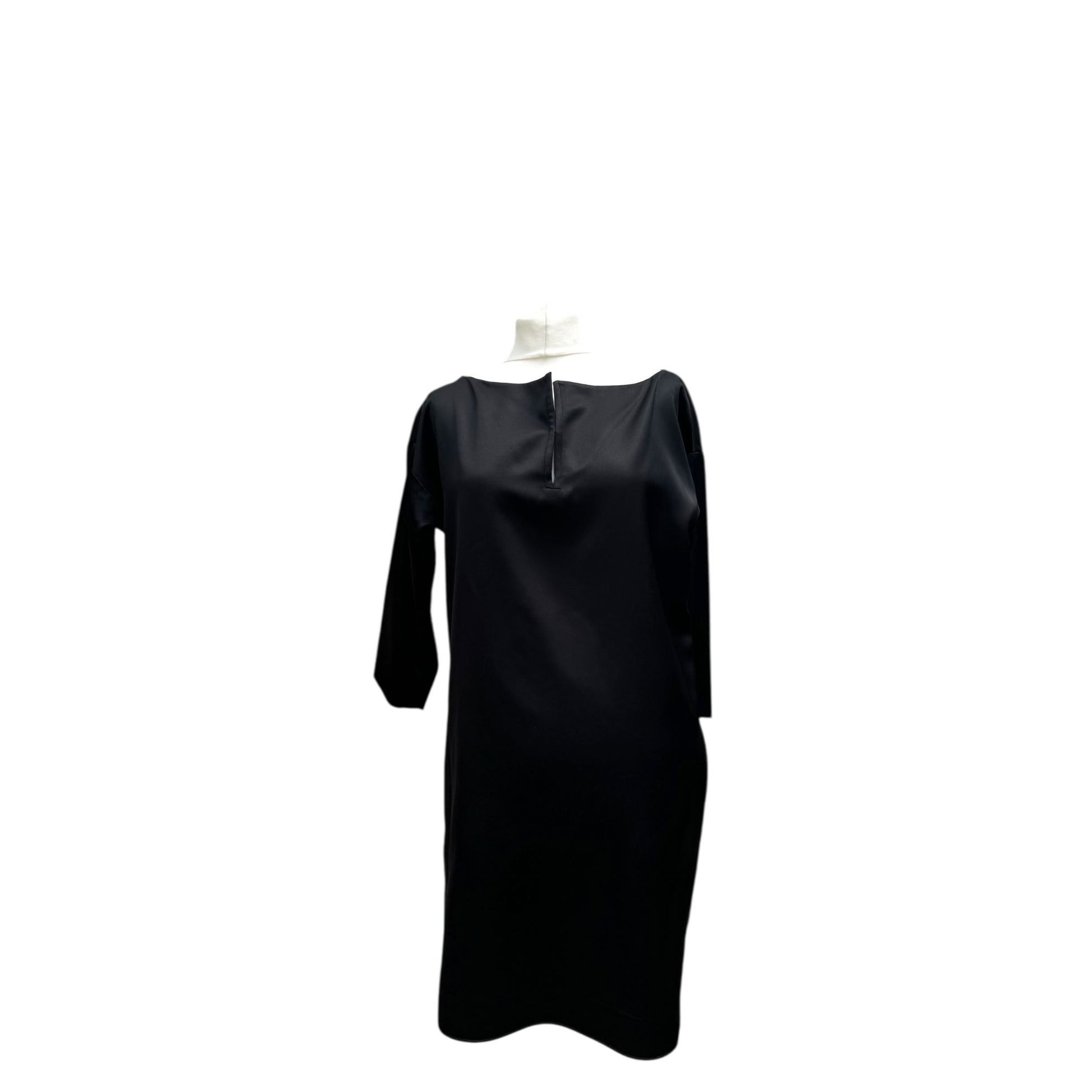 Crafted from 100% viscose, this elegant black dress features a relaxed silhouette with drop shoulders and a subtle front slit neckline.