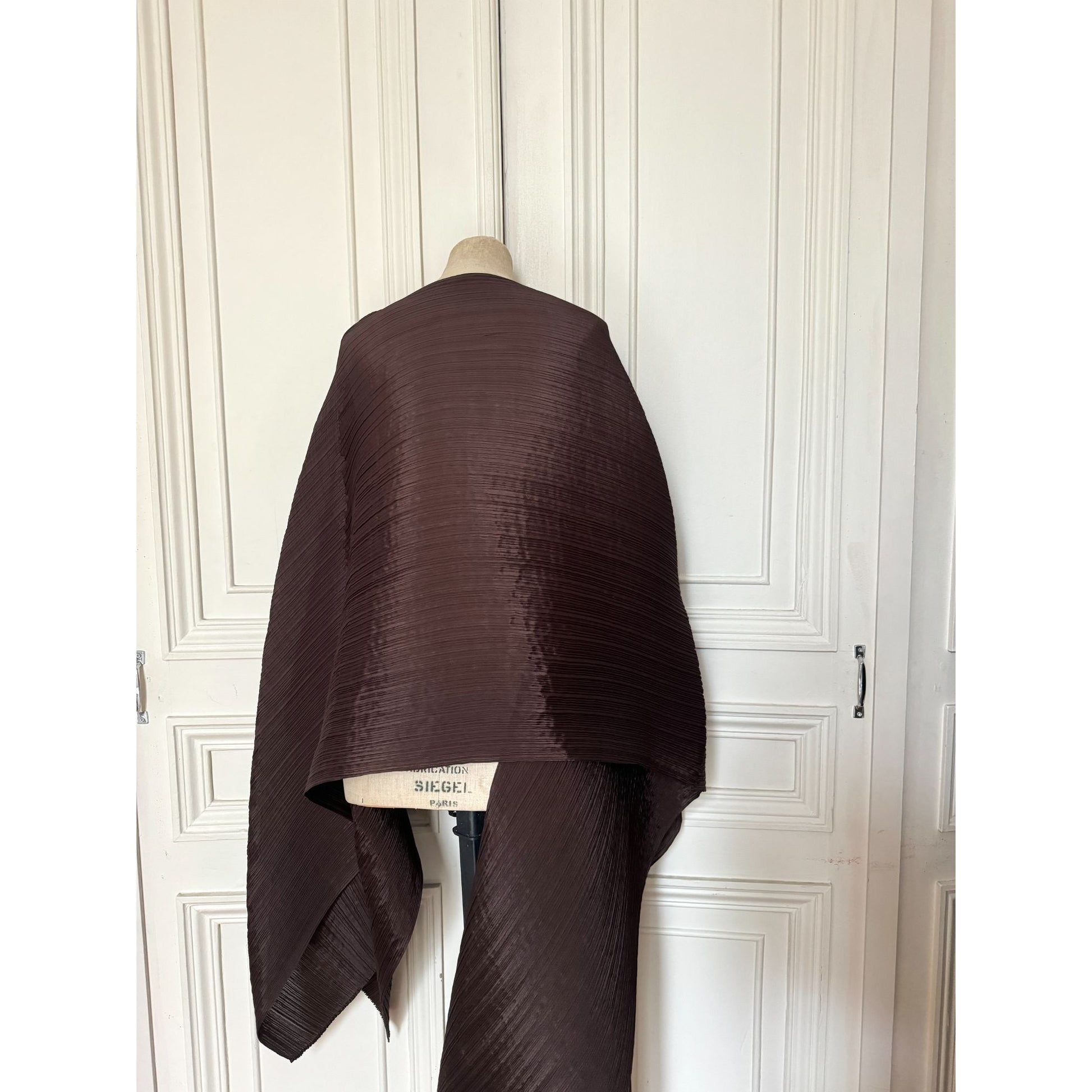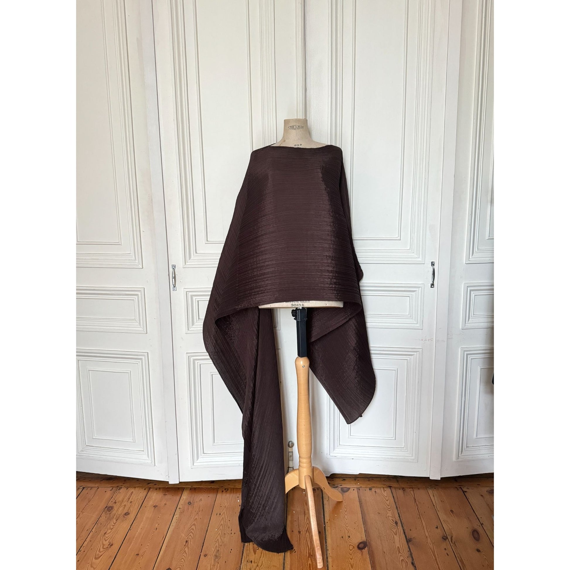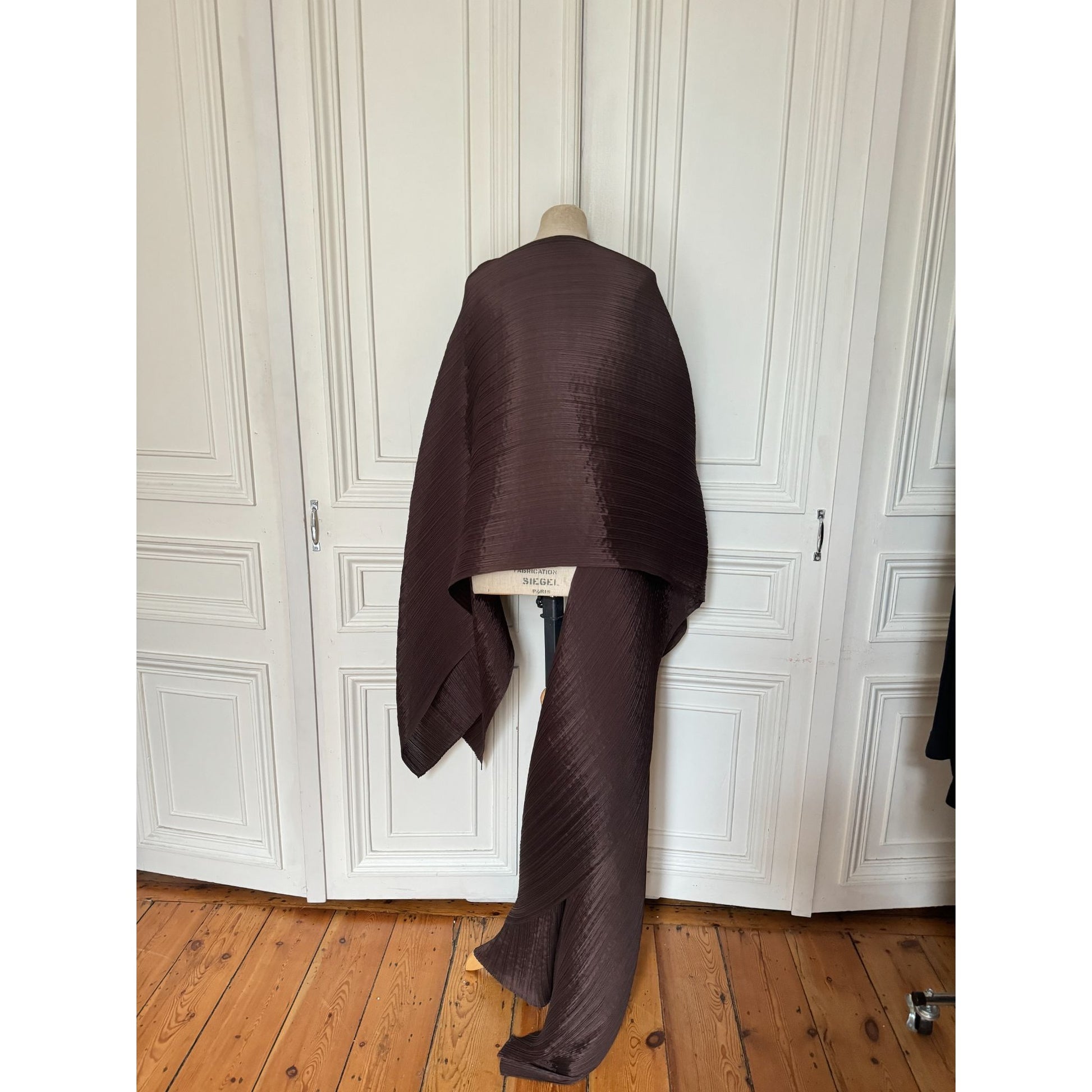 An exquisite example of Issey Miyake’s innovative textile alchemy, this Pleats Please cape envelops the body in flowing architectural precision. Crafted from the iconic heat-pleated polyester, the piece cascades in rhythmic vertical folds that catch and reflect light, creating a gentle luster against the deep chocolate brown hue.