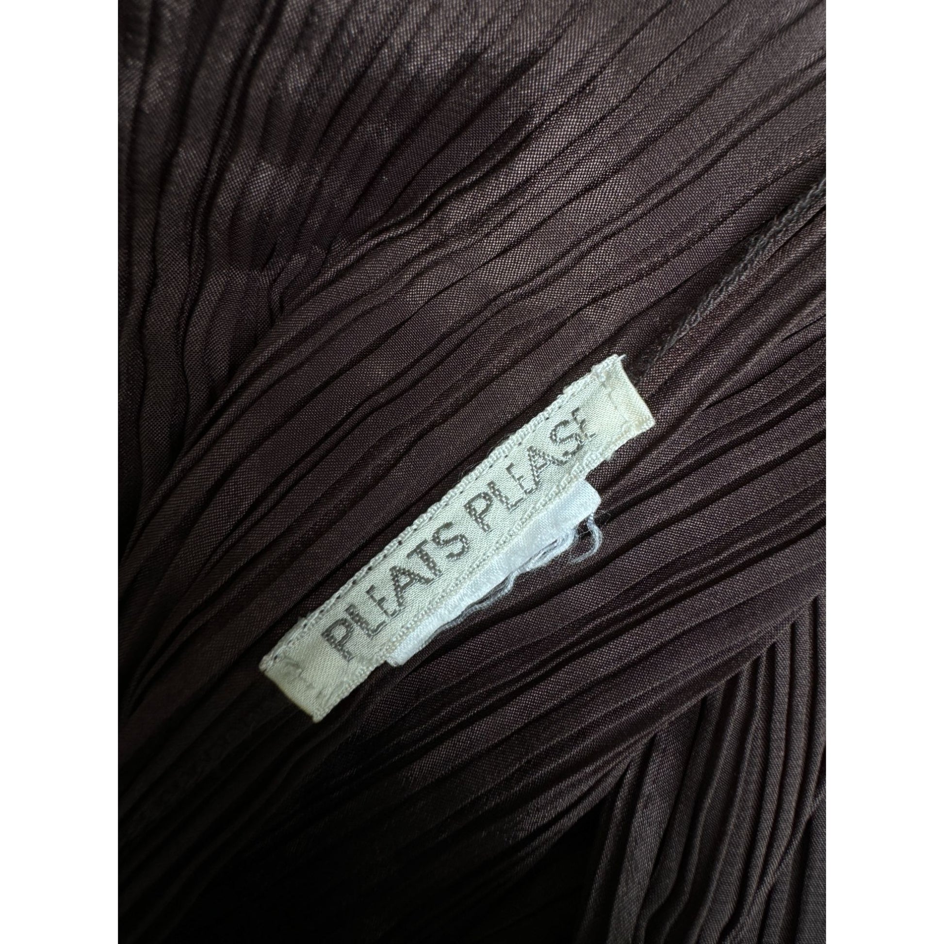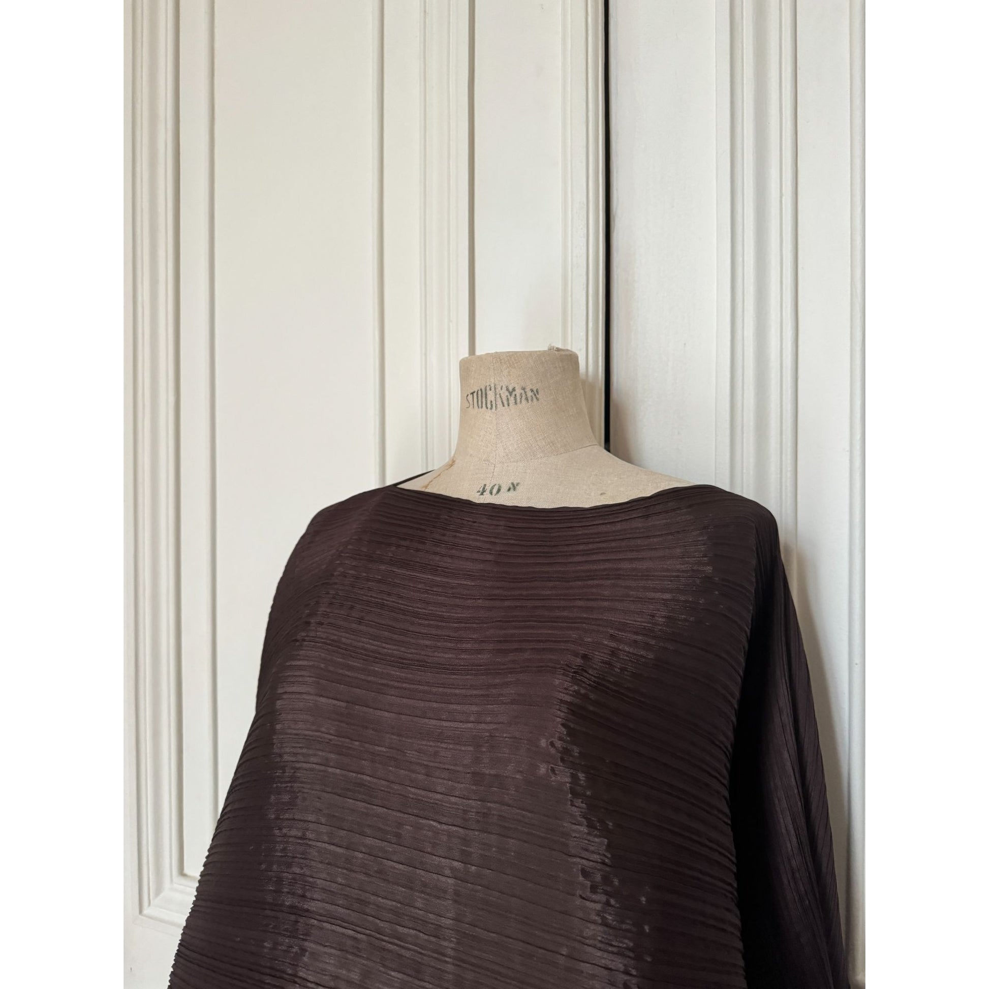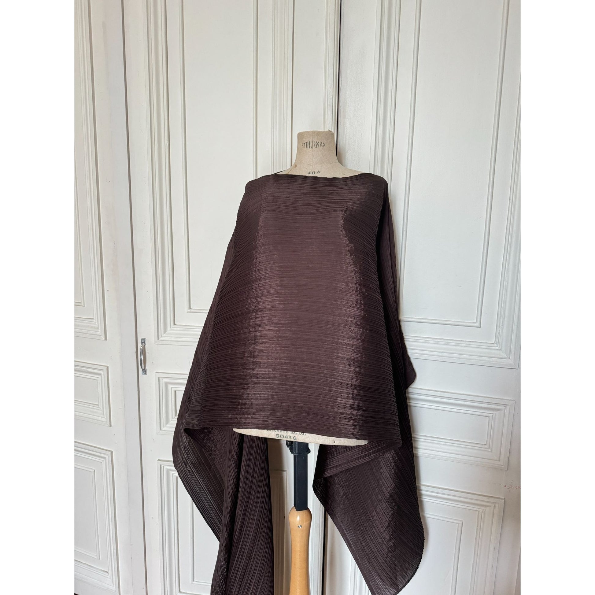 An exquisite example of Issey Miyake’s innovative textile alchemy, this Pleats Please cape envelops the body in flowing architectural precision. Crafted from the iconic heat-pleated polyester, the piece cascades in rhythmic vertical folds that catch and reflect light, creating a gentle luster against the deep chocolate brown hue.