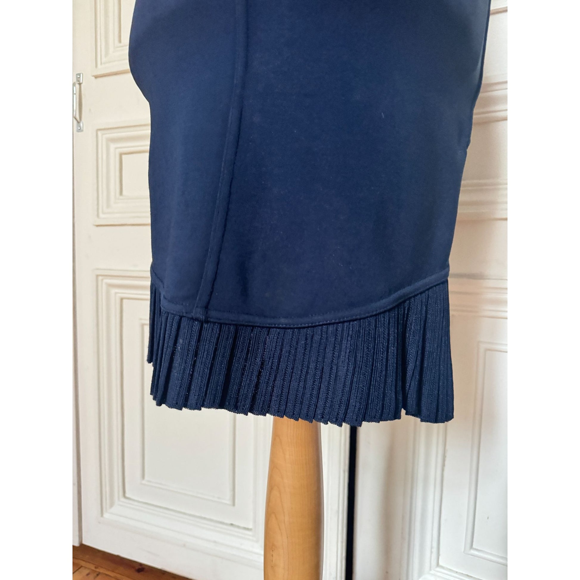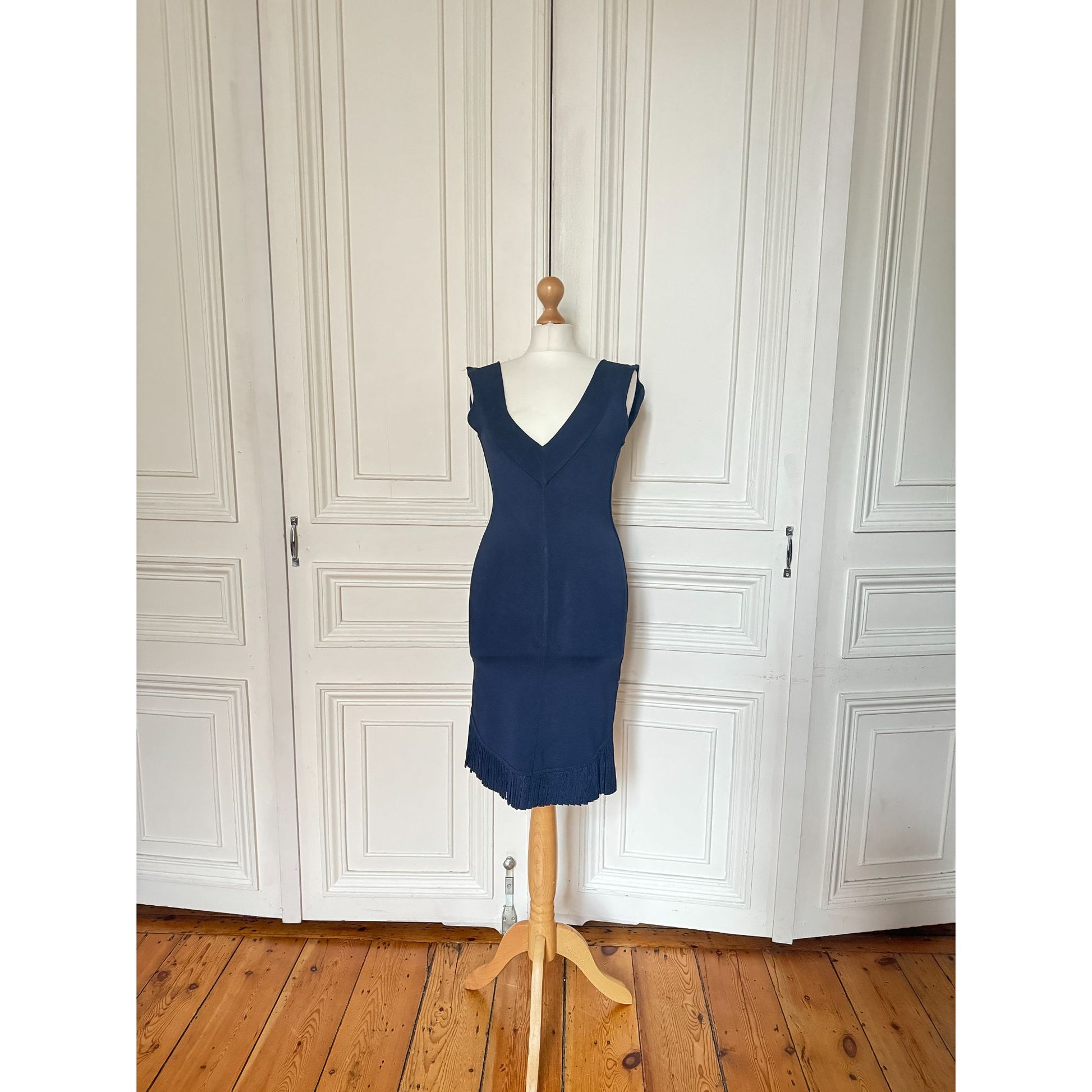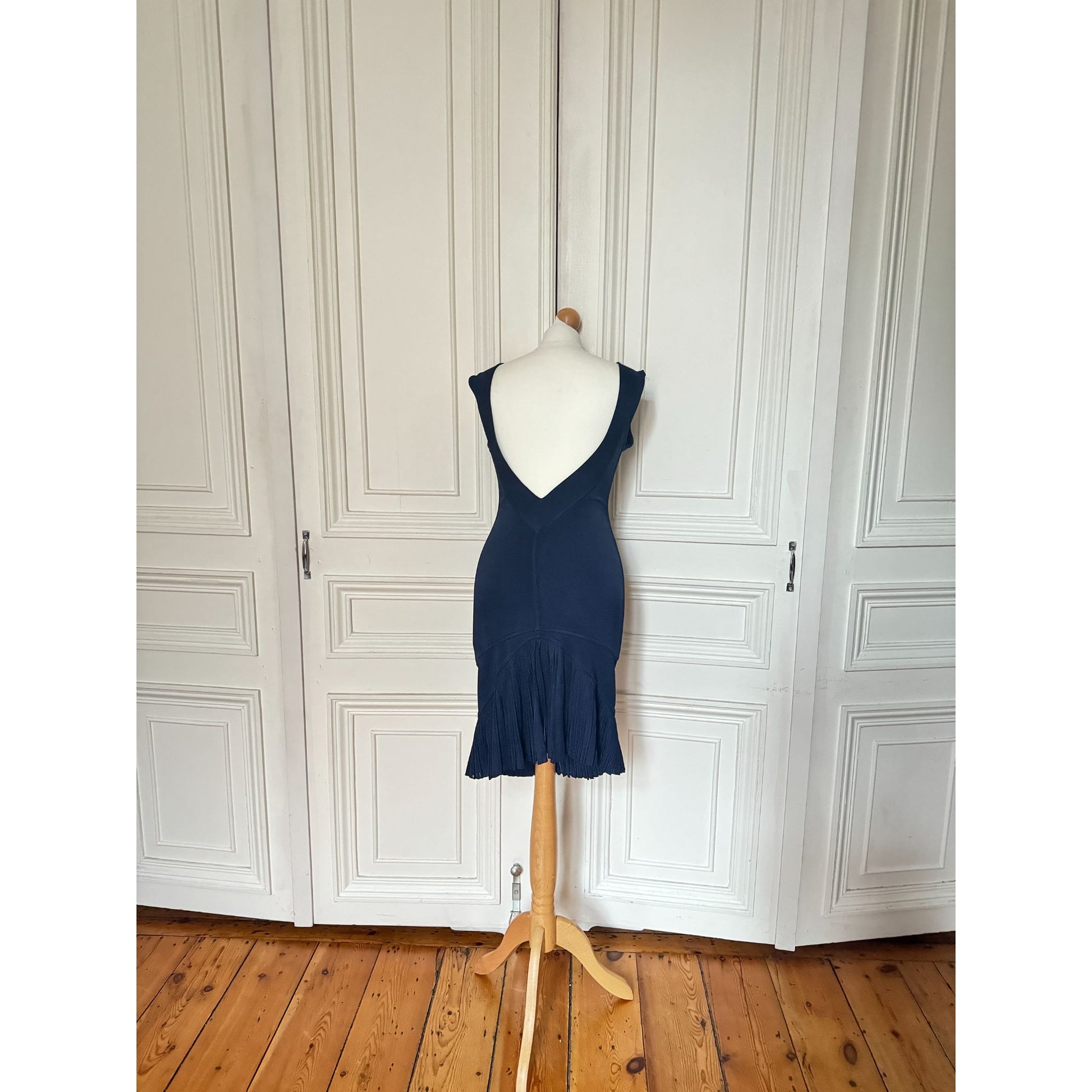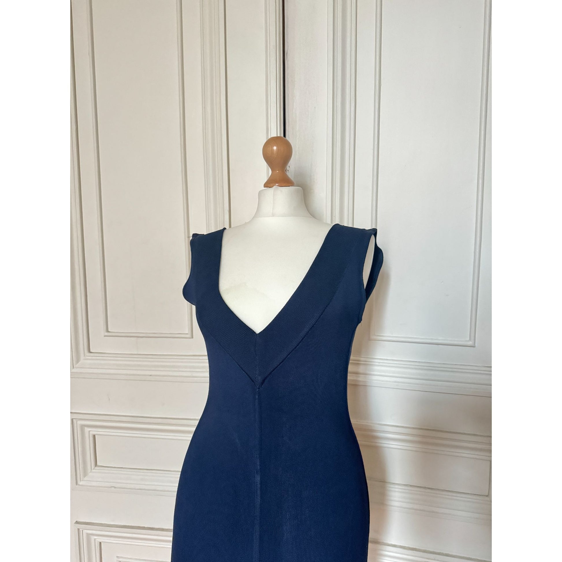 This iconic bodycon dress is crafted from a marine blue stretch rayon knit, featuring Alaïa’s signature sculptural seams and paneling for a flattering fit.
