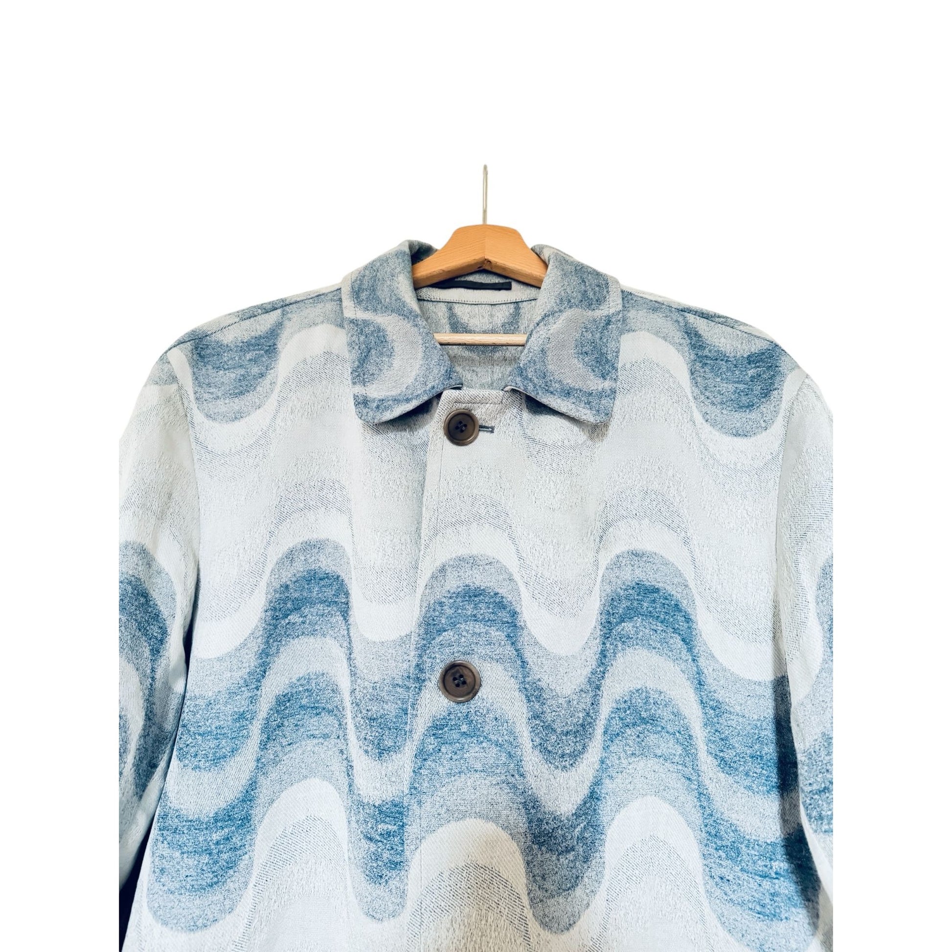 Crafted in a luxurious blend of 49% cotton, 48% linen, and 3% nylon, the coat features a textural knitted wave pattern ! not printed—bringing Panton’s legendary curves to life in fabric. The quality of craftsmanship is unmistakable, from the refined silhouette to the elegant finishing details.