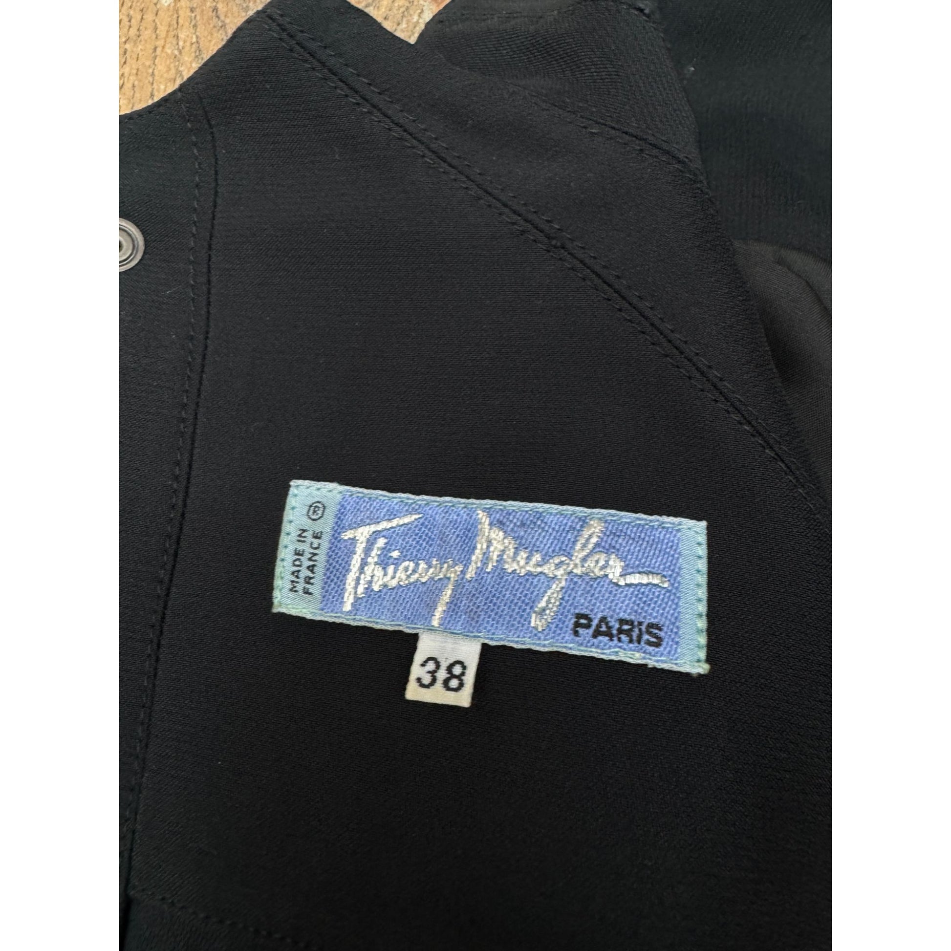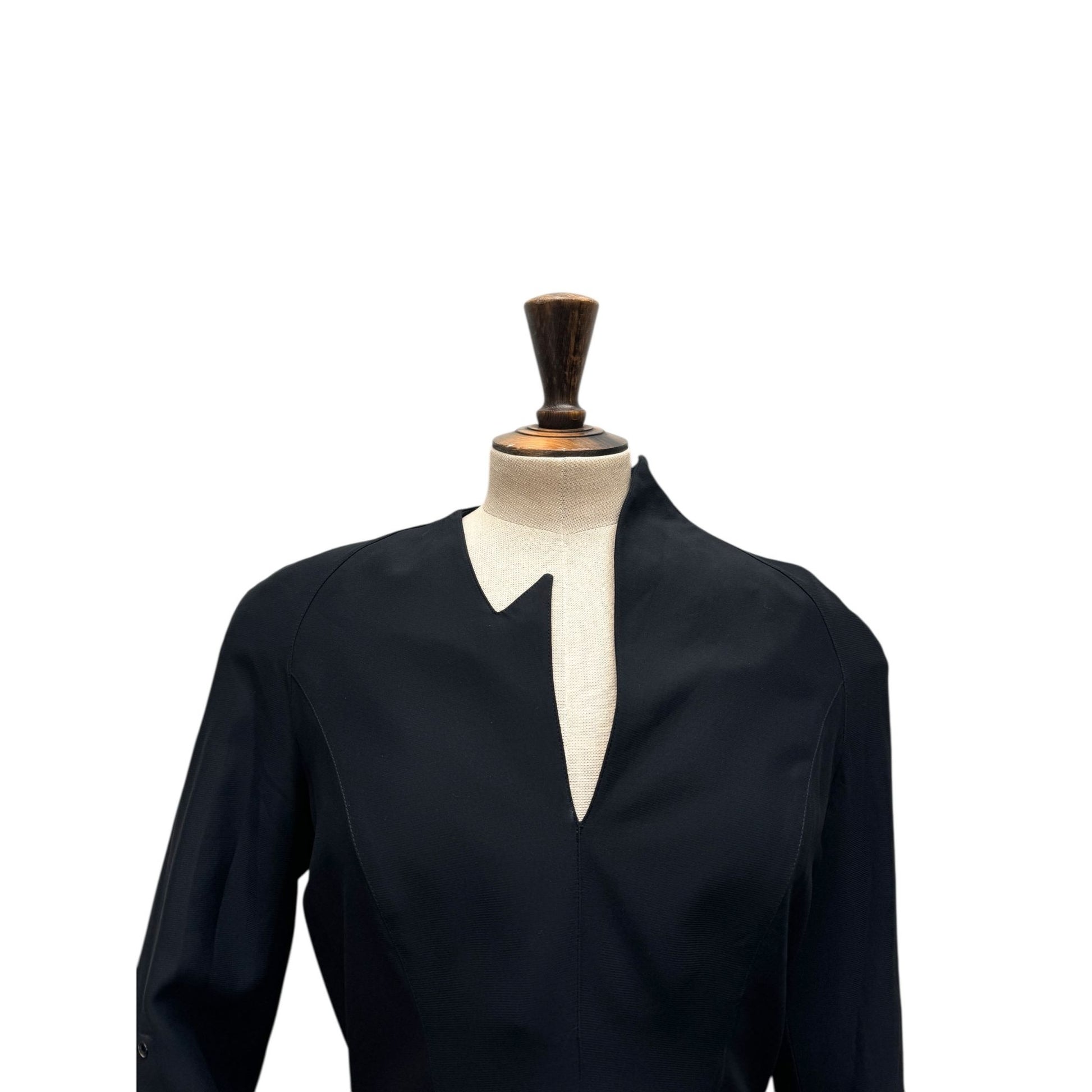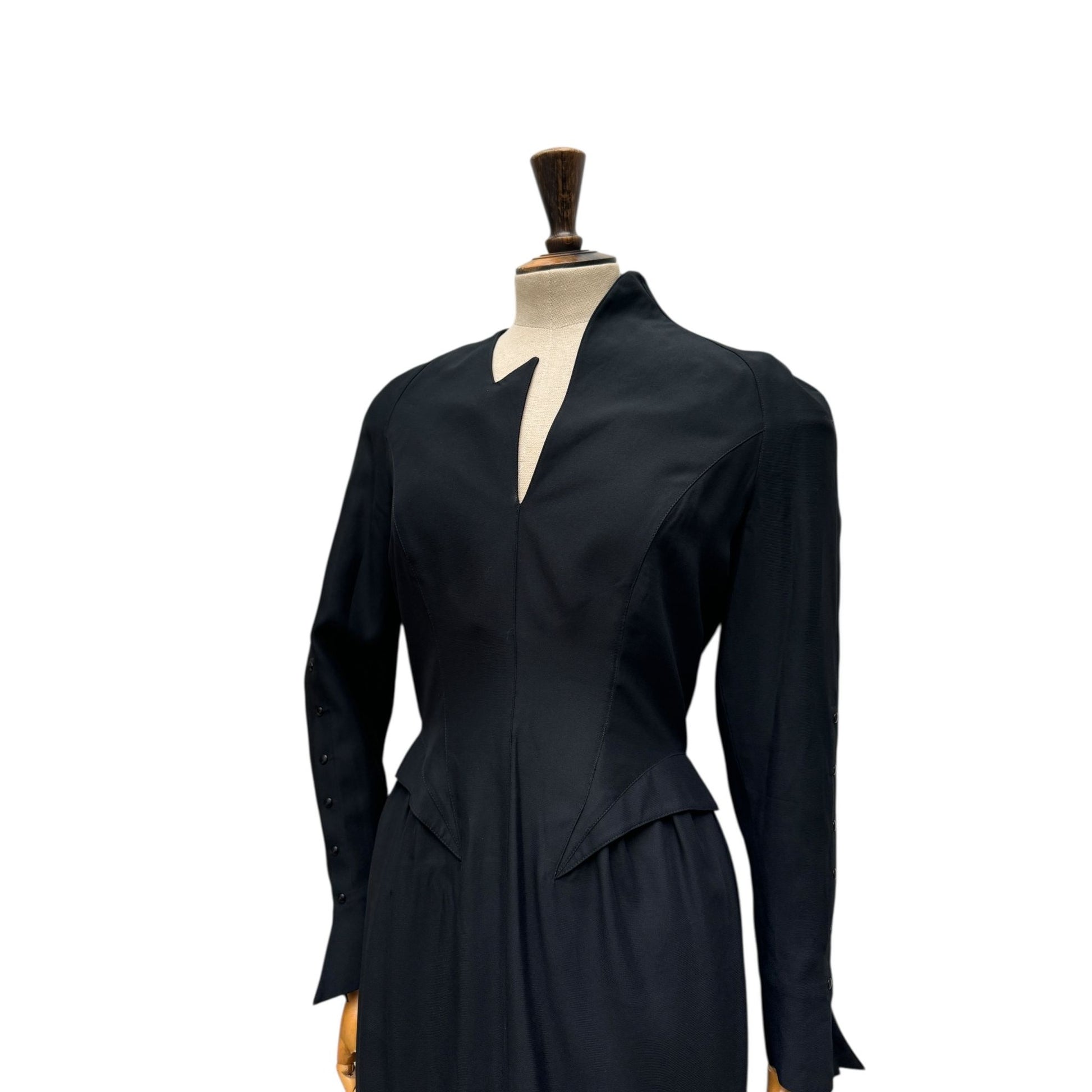 The neckline features Mugler’s distinctive asymmetrical notch, framing the décolletage in a subtle yet striking architectural gesture. Structured shoulder pads enhance the powerful shoulder line, balancing the hourglass silhouette and reinforcing the couture tailoring heritage.