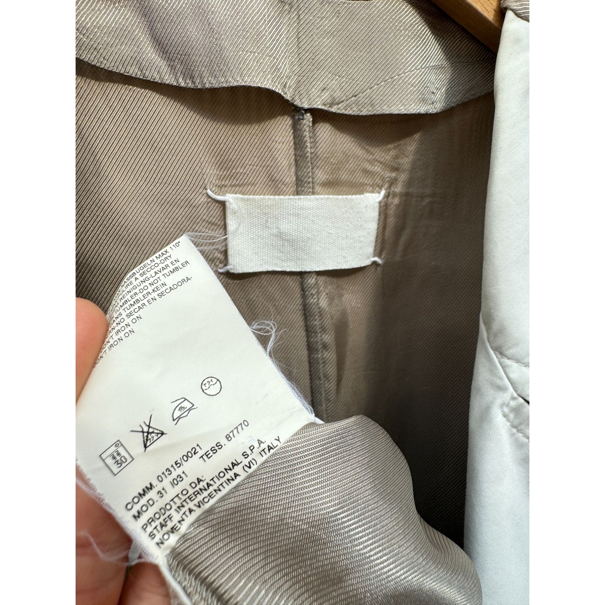 It features a belted waist for adjustable styling, signature exposed seams and raw minimalism typical of Margiela’s early-2000s work. The exaggerated lapels, double-breasted closure, and epaulette details subtly nod to utilitarian trench and safari influences, while the contrast rear panel breaks all conventions.
