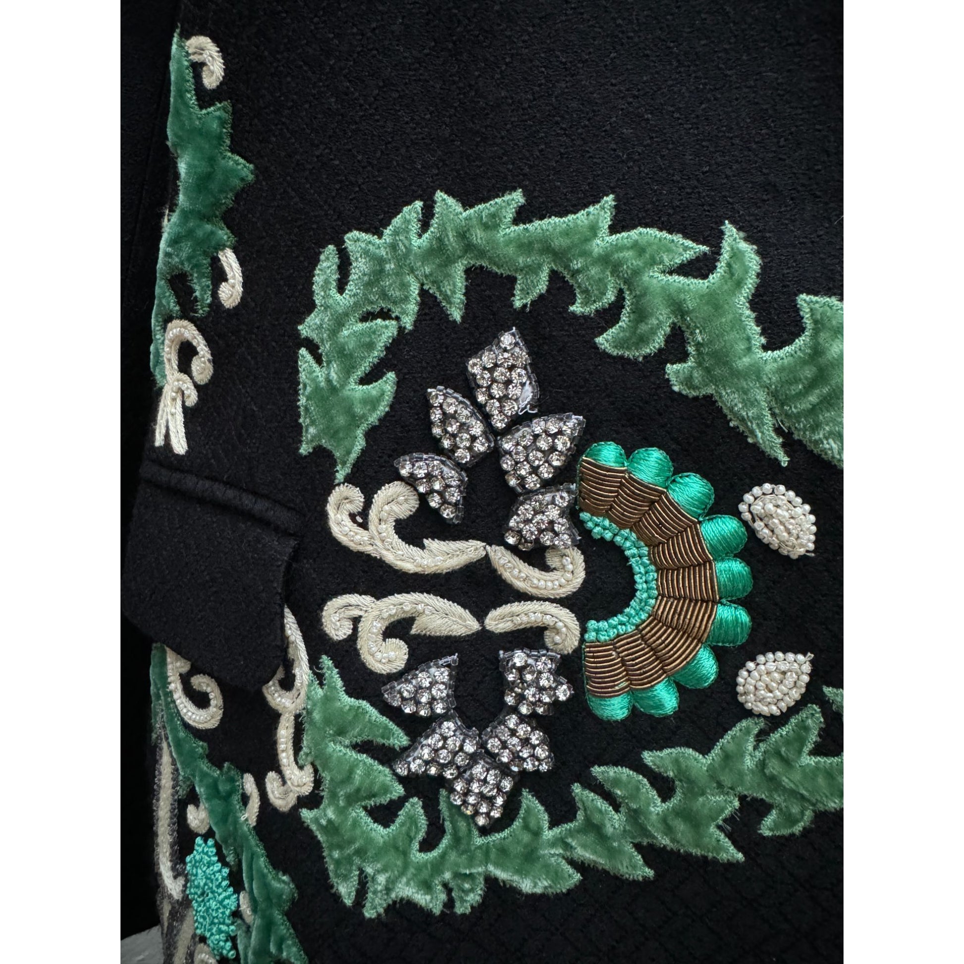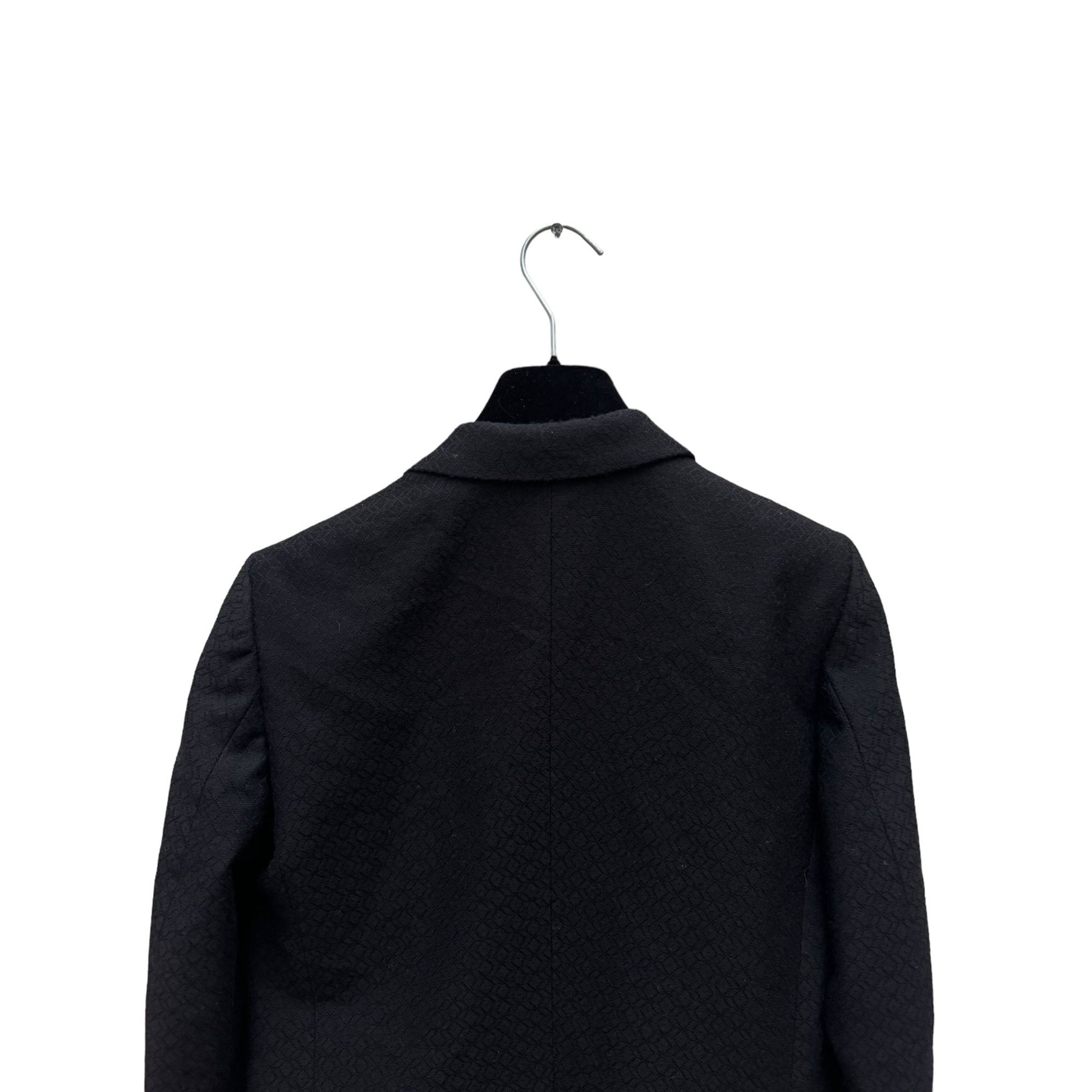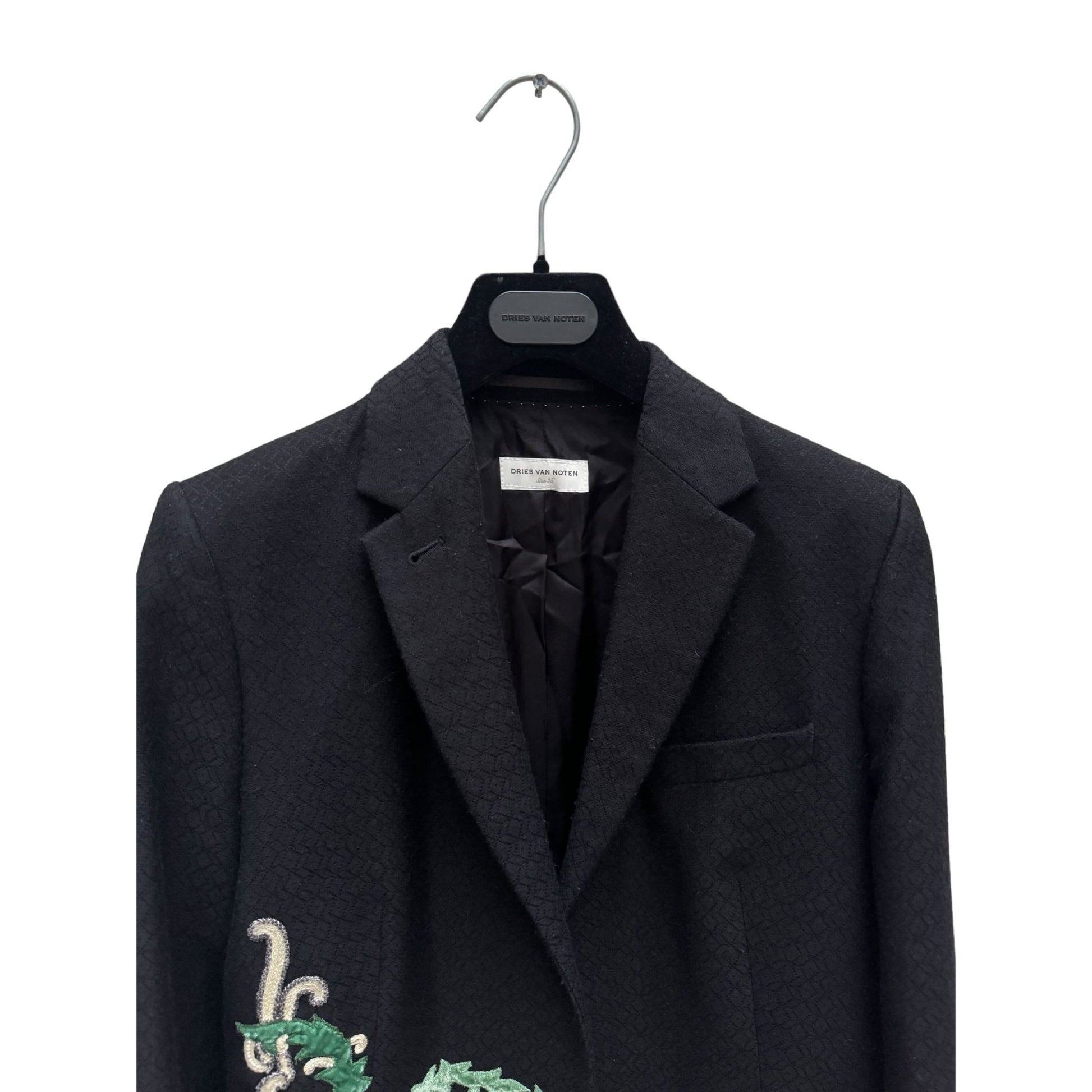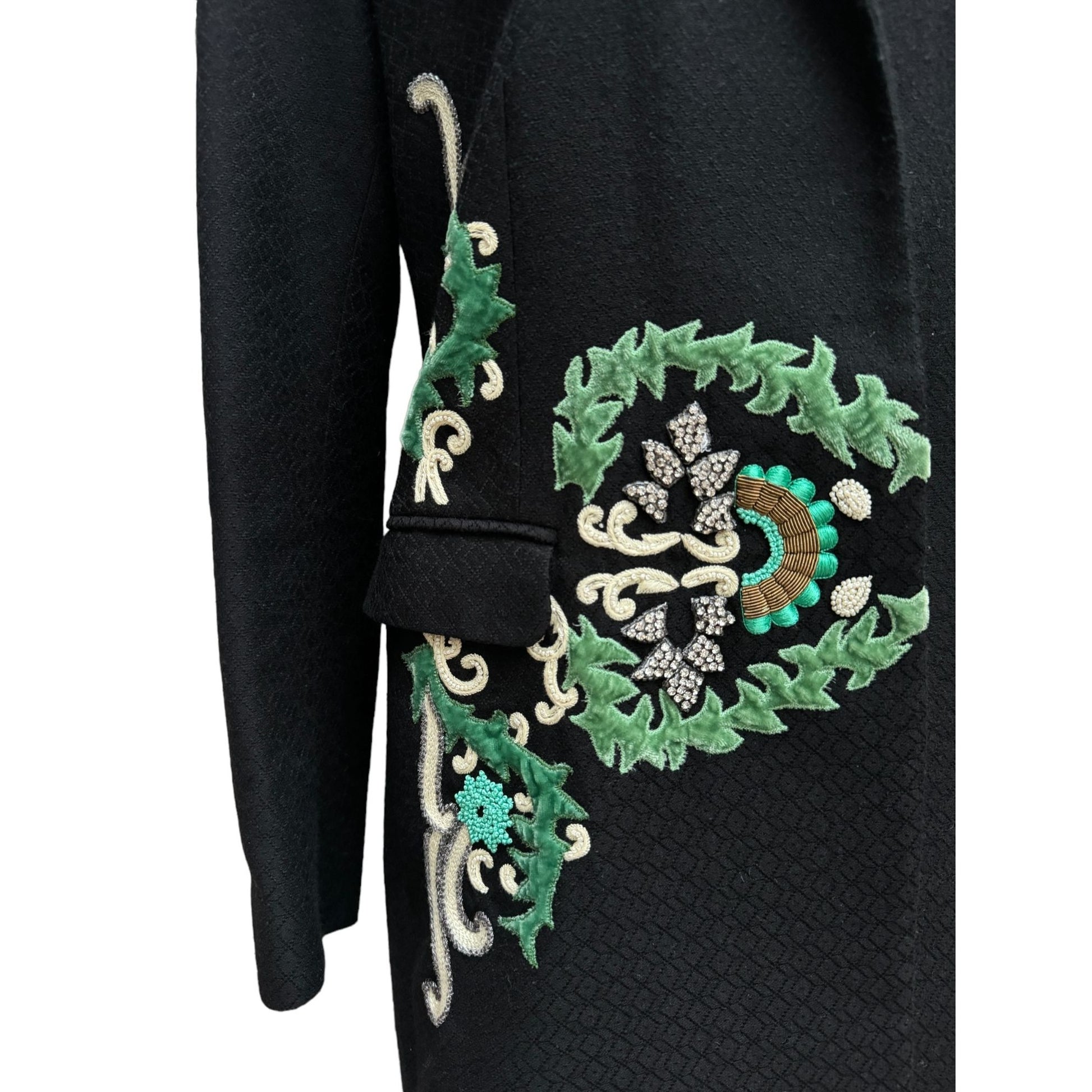 Black, wool-cotton blend, jacquard design, appliqué, notched lapels, long sleeves, buttoned cuffs, straight hem.