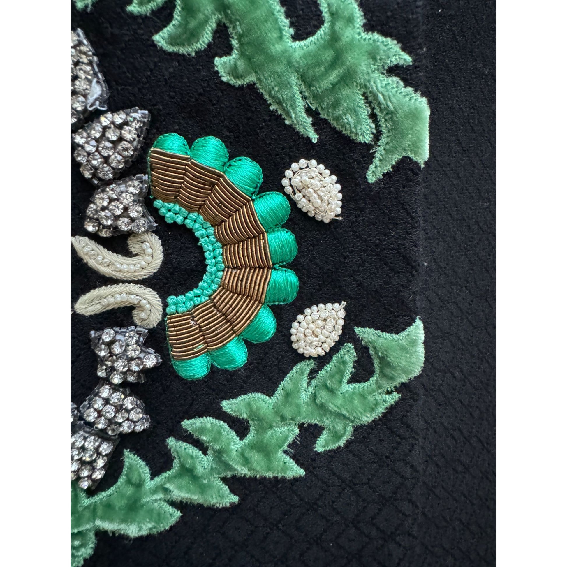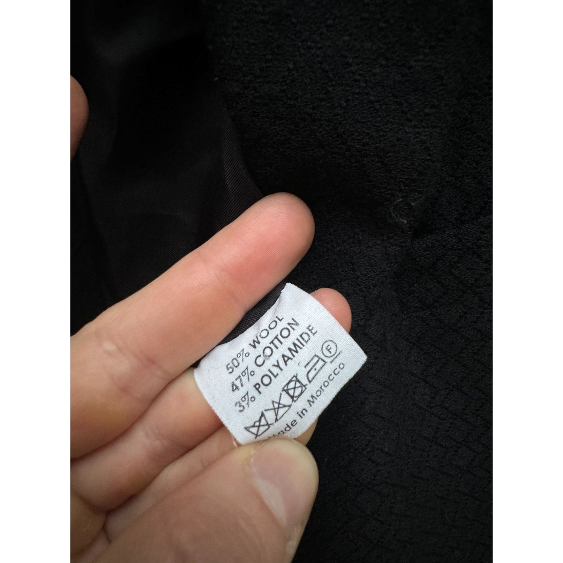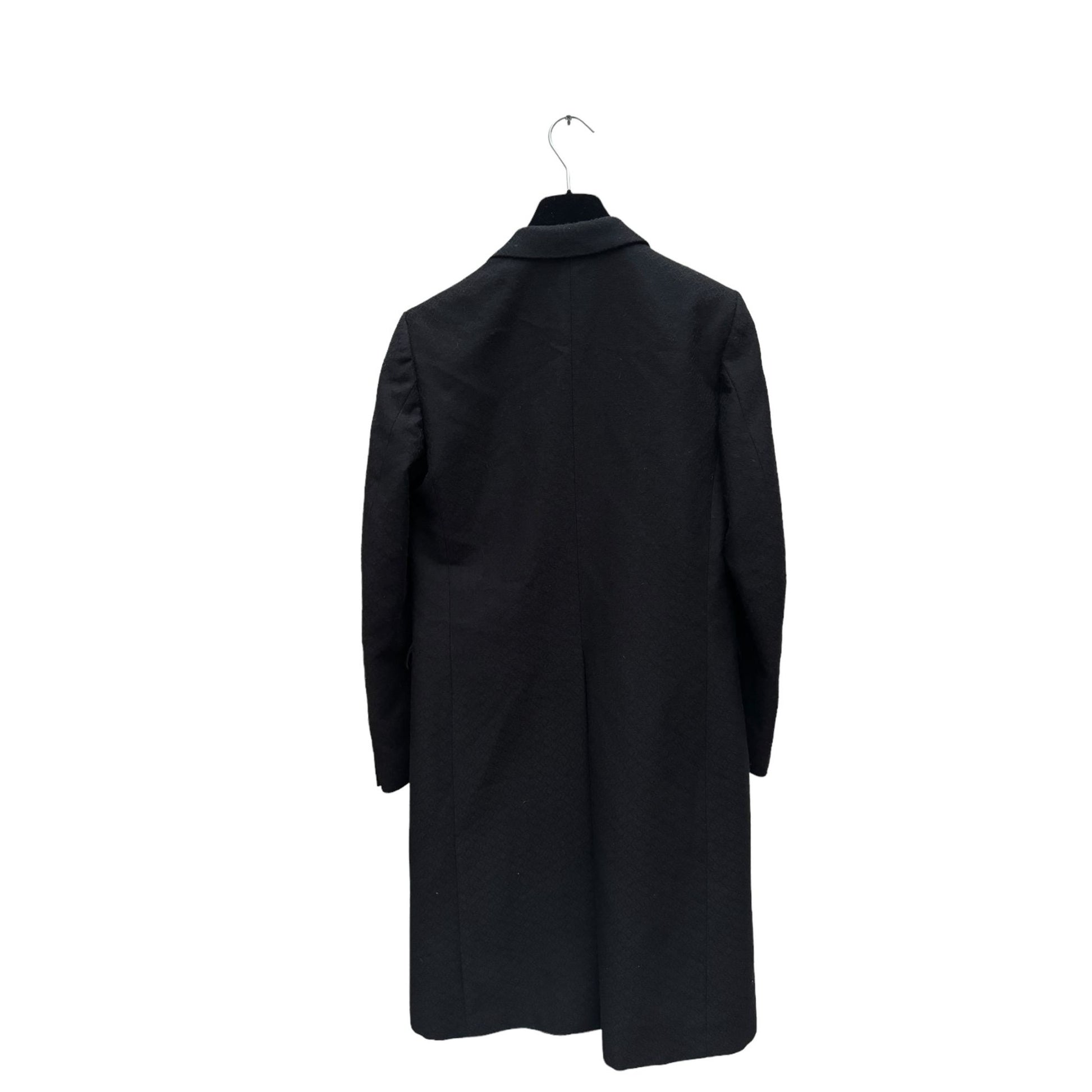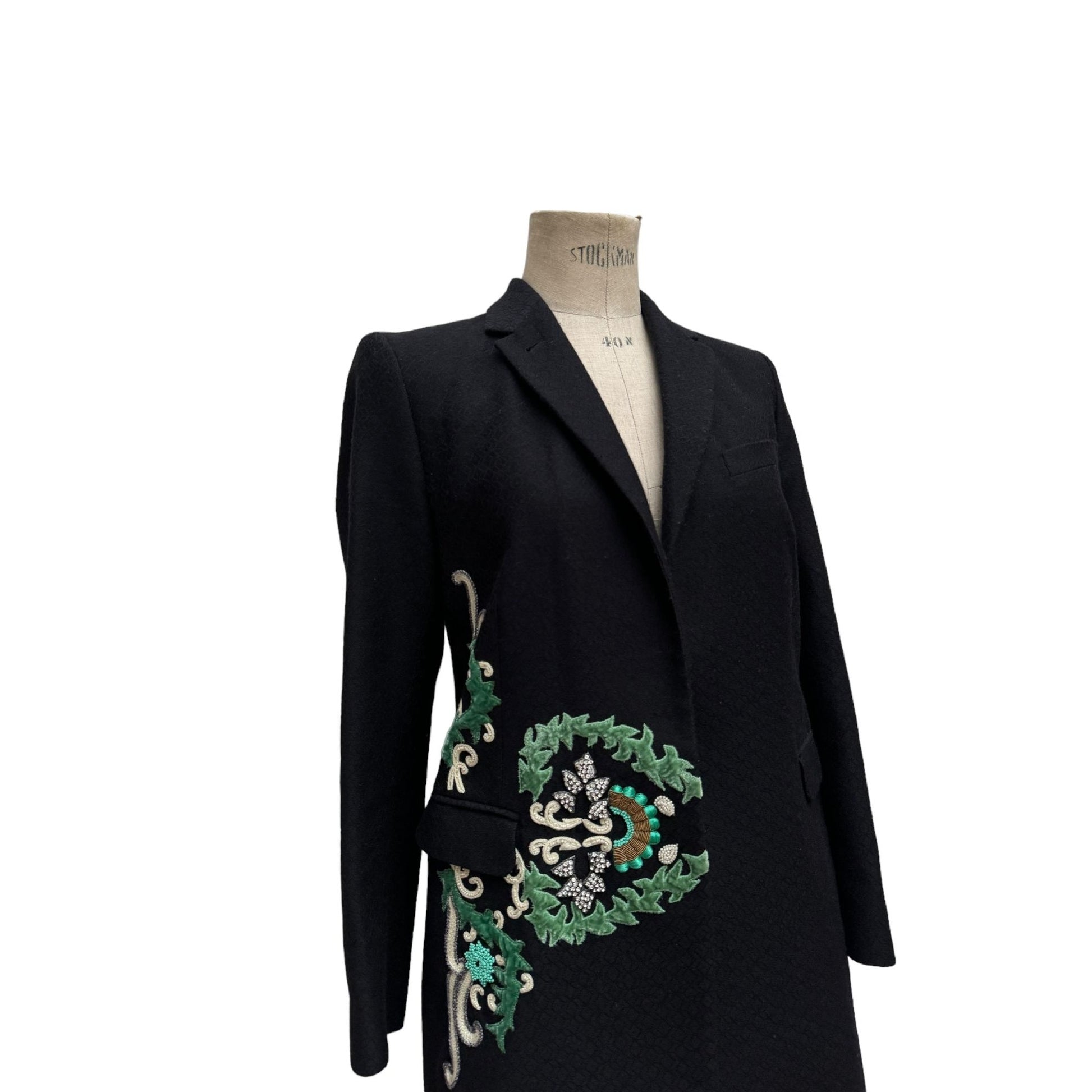 Black, wool-cotton blend, jacquard design, appliqué, notched lapels, long sleeves, buttoned cuffs, straight hem.