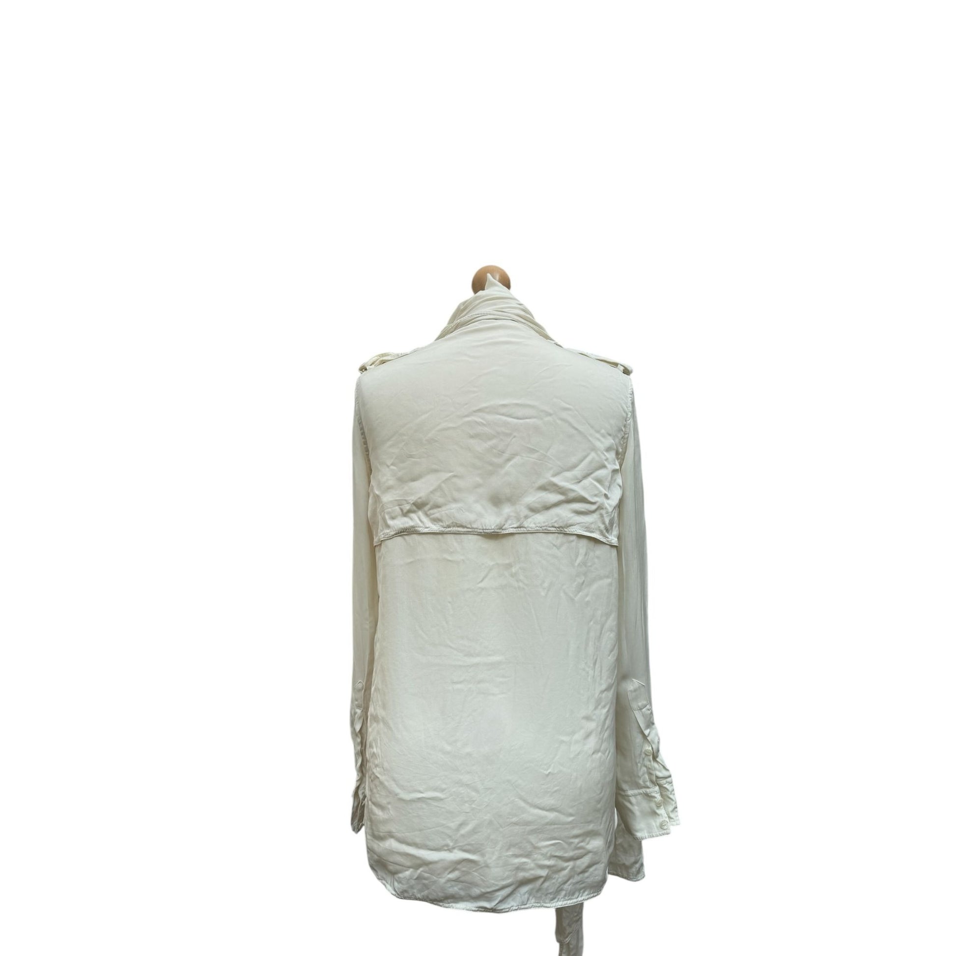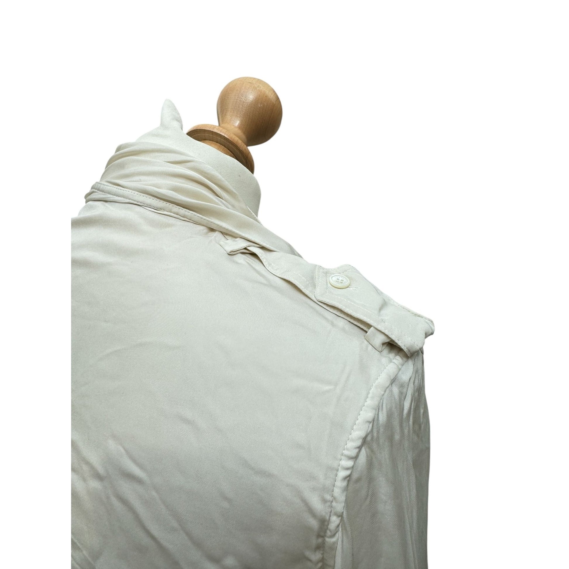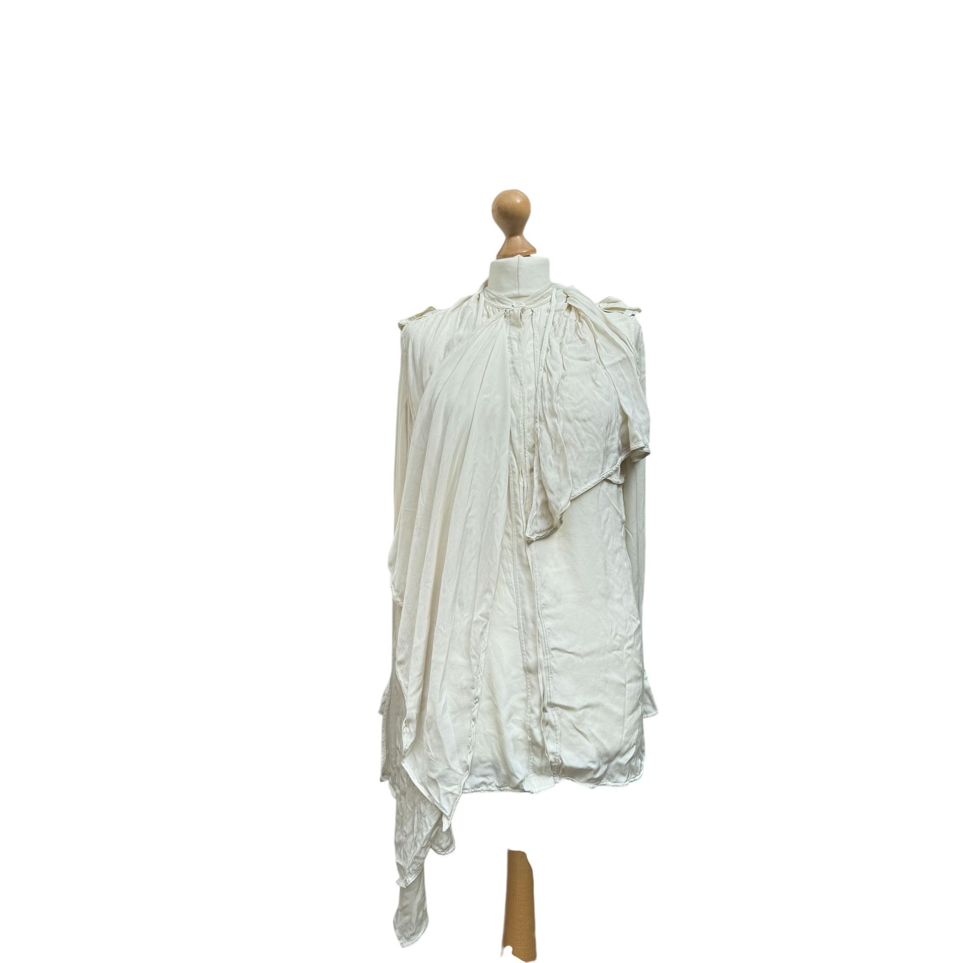 Crafted from a luxurious blend of 51% viscose and 49% silk, the shirt features two long, flowing asymmetric front panels that drape with effortless elegance. These panels can be styled multiple ways—worn loose for movement, or tied to create a structured bow or wrap effect. The soft off-white hue enhances its ethereal quality while staying true to Philo’s clean, modern aesthetic.