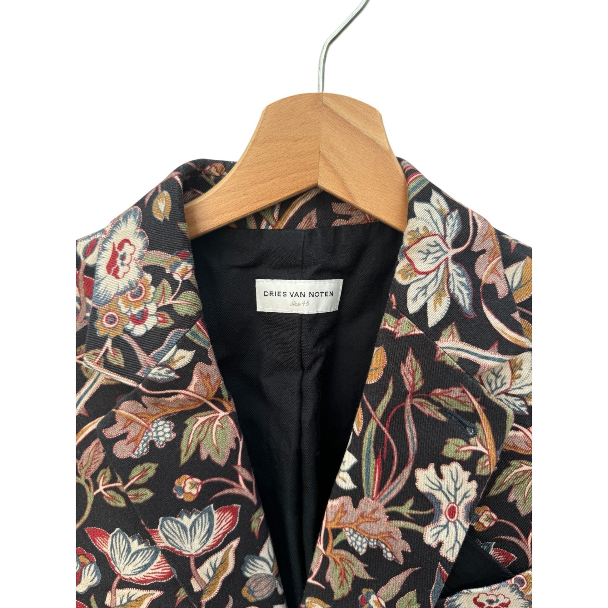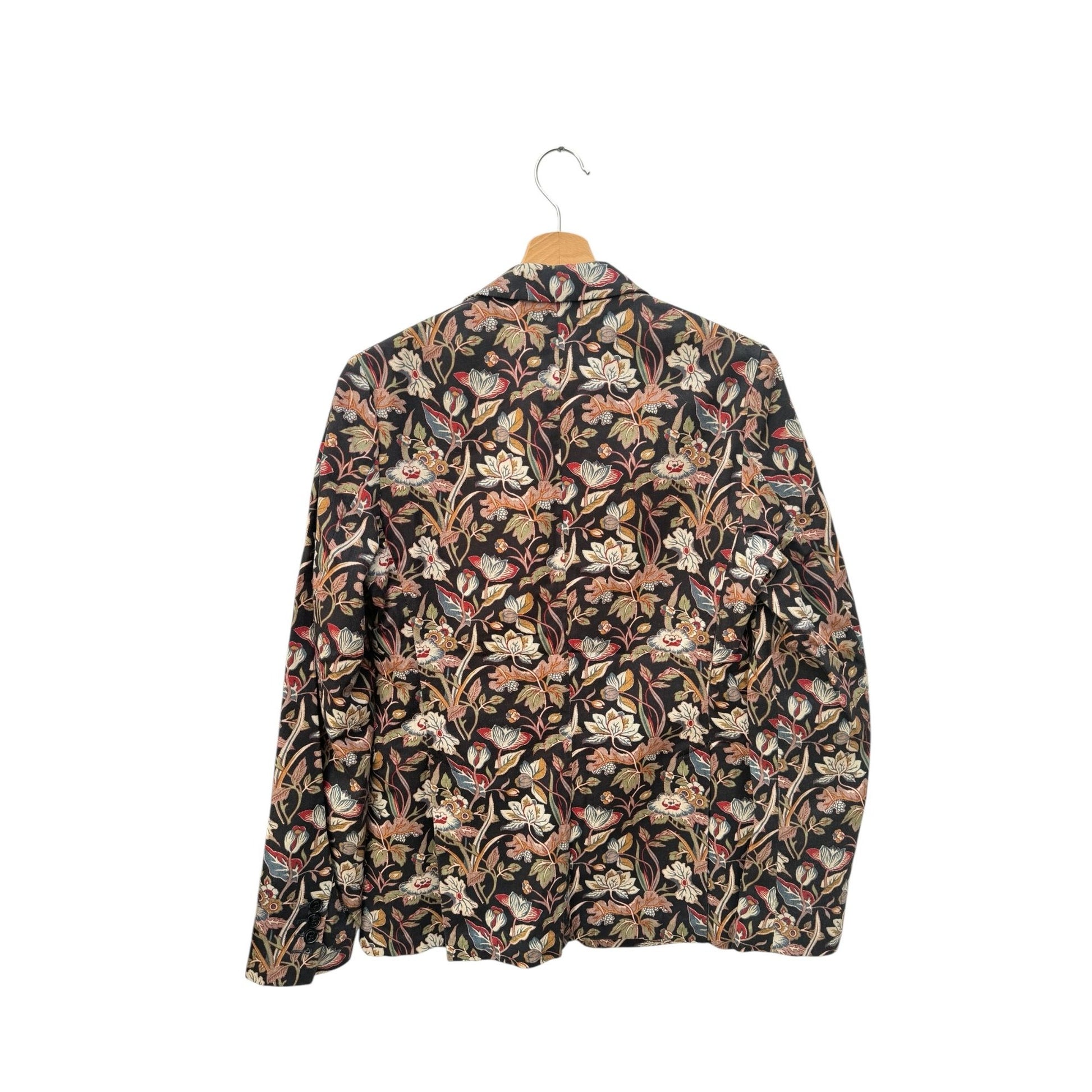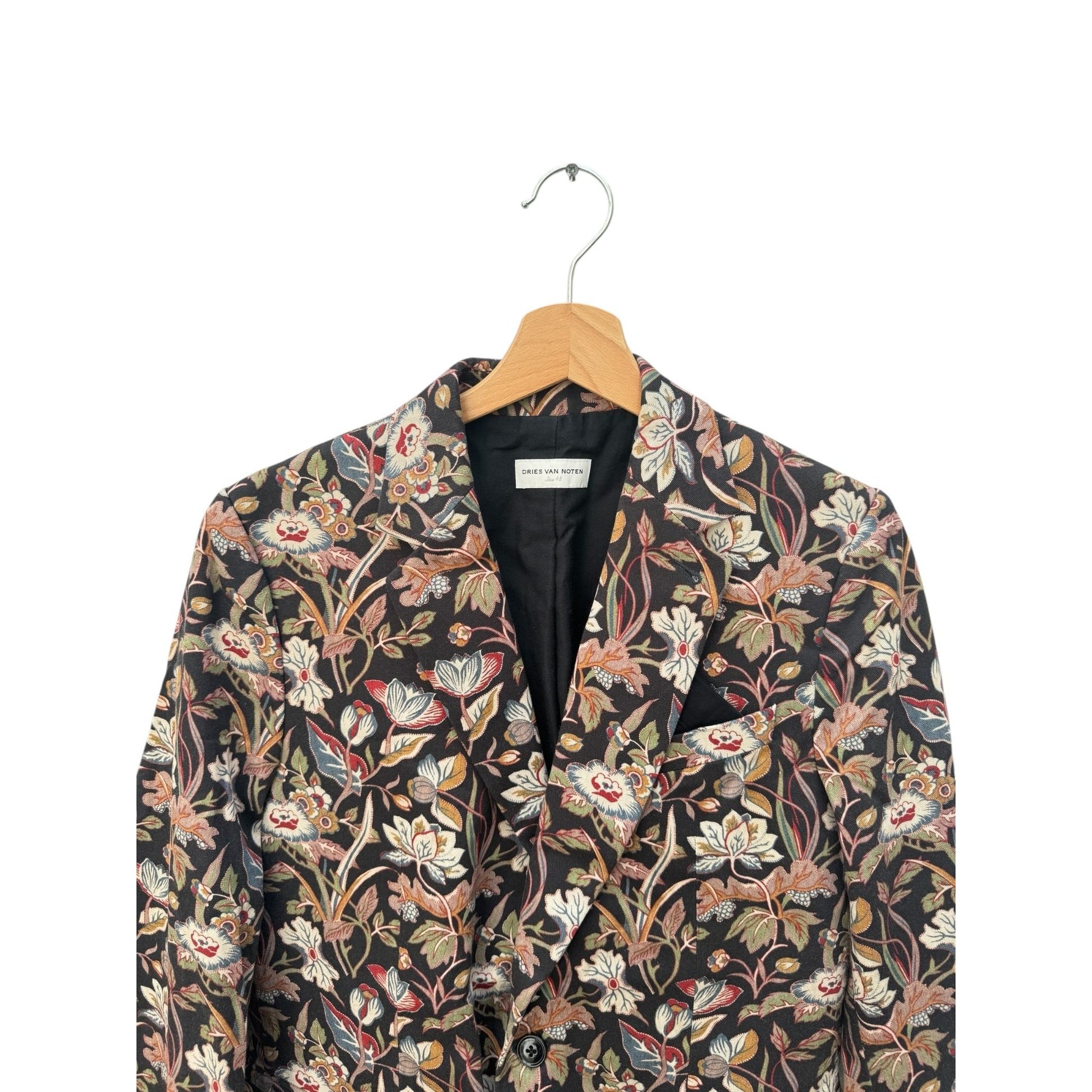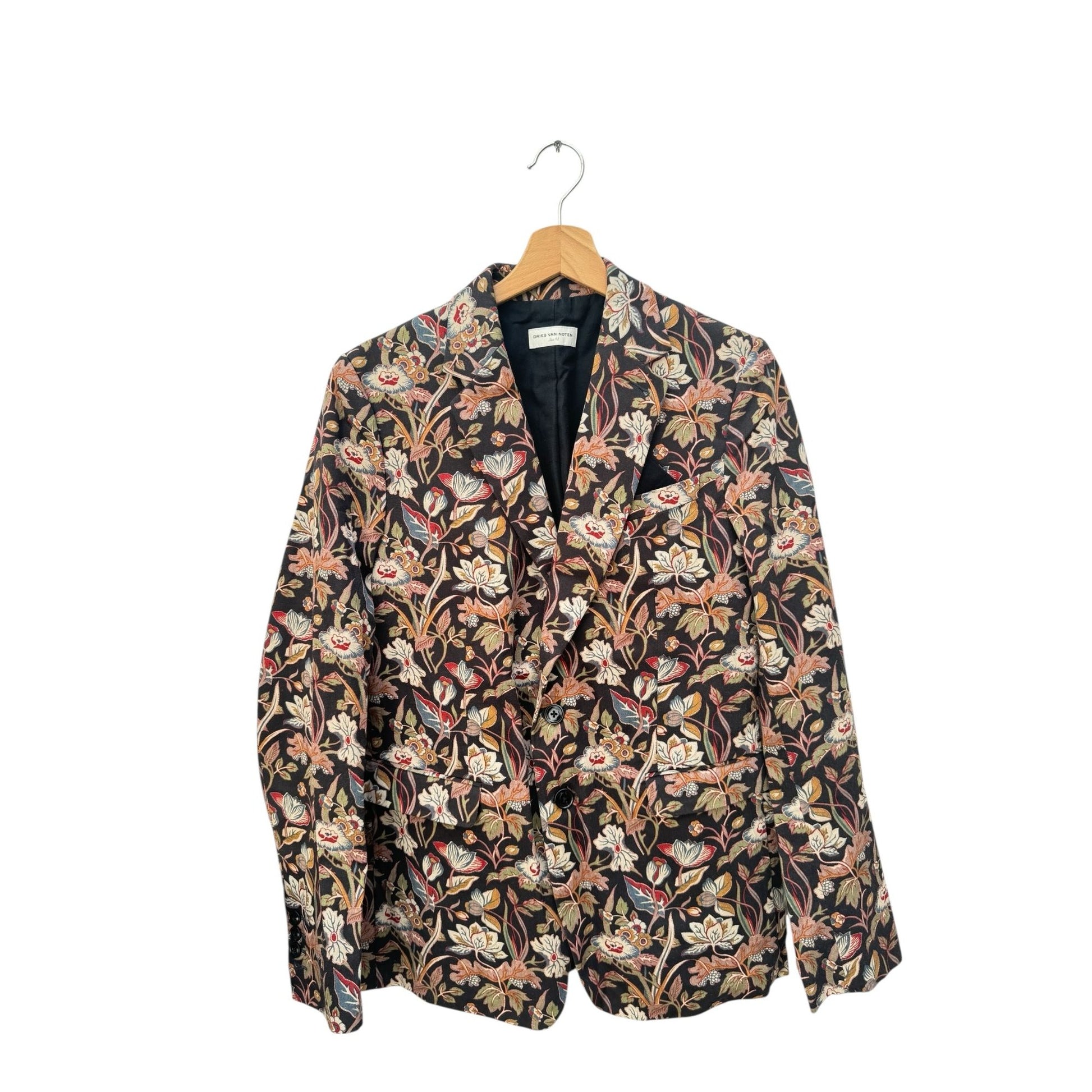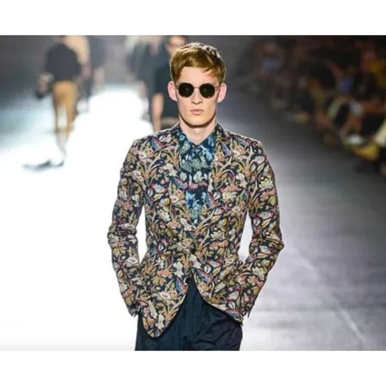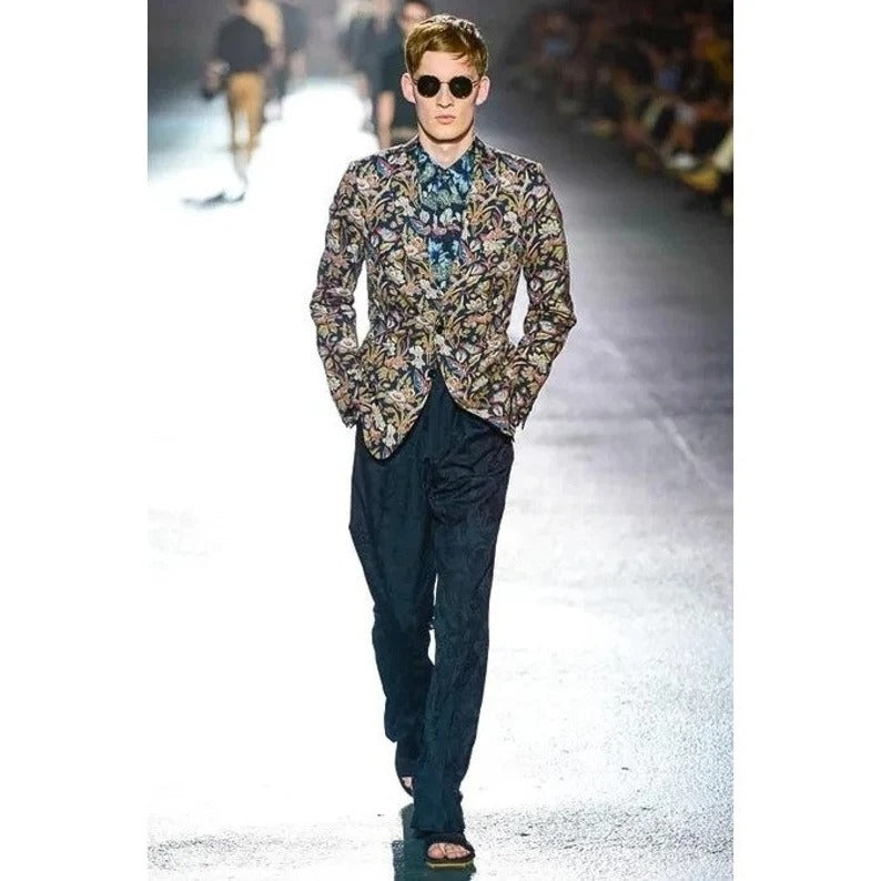 From the iconic Spring/Summer 2014 runway collection, this Dries Van Noten blazer is a statement piece that captures the designer’s masterful play between tailoring and artistic print. The jacket is crafted in 100% cotton with an intricate all-over floral jacquard pattern in earthy tones, highlighted with touches of red, blue, and ivory against a dark background.