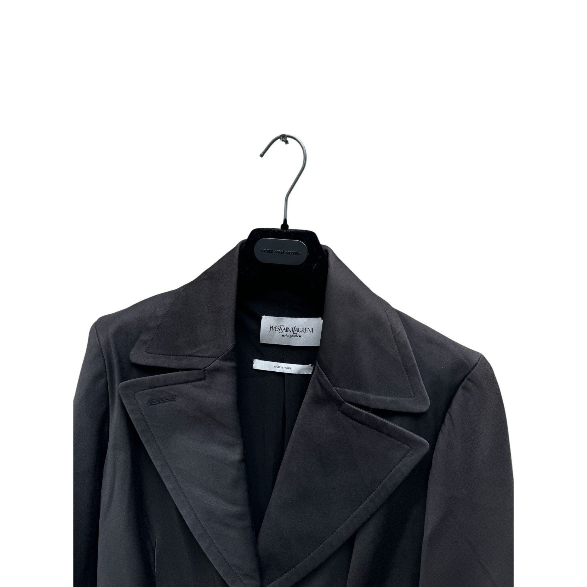 This striking blazer from Yves Saint Laurent under the creative direction of Stefano Pilati embodies the house’s dedication to refined tailoring and timeless allure. Pilati, known for his mastery of fluid silhouettes and architectural precision, reinvents the classic blazer with bold, structured lines and dramatic peak lapels that evoke a strong, feminine power.
