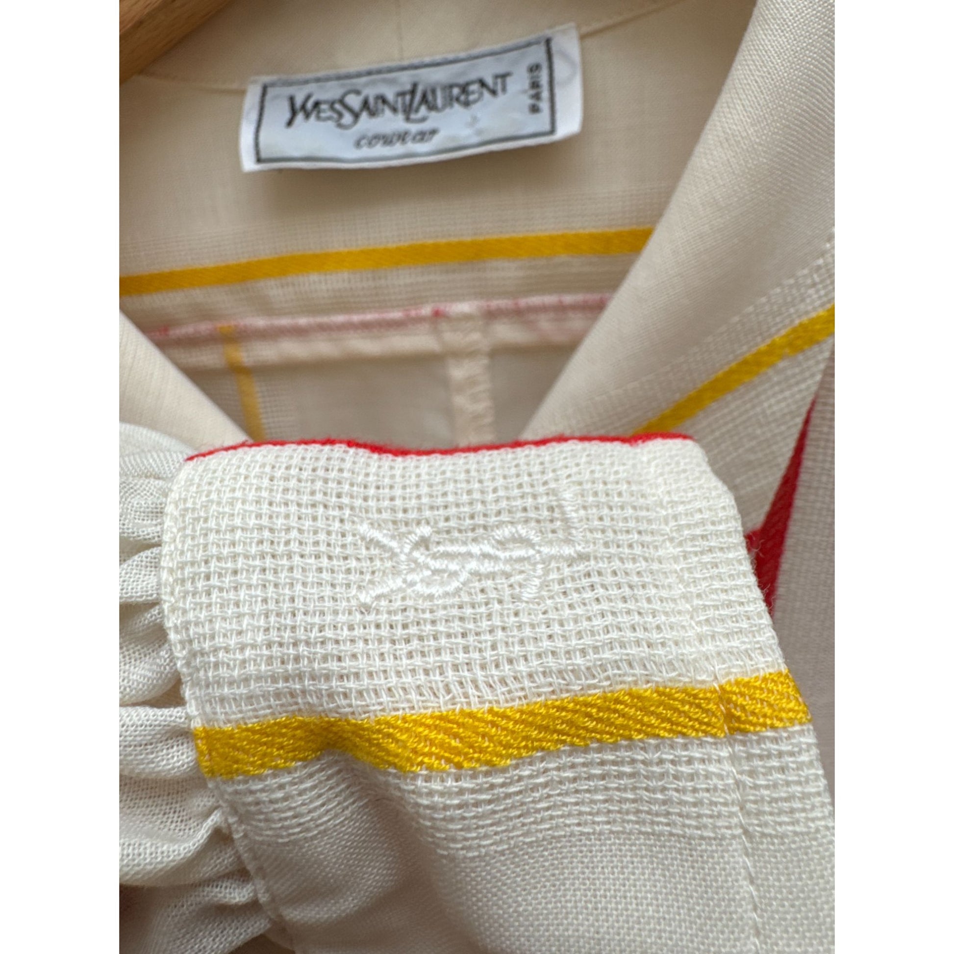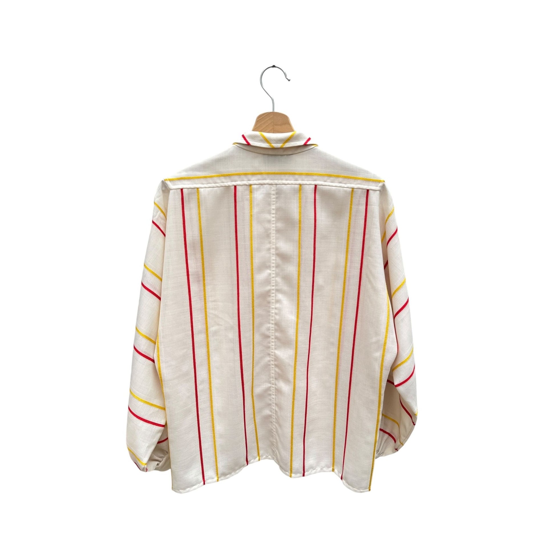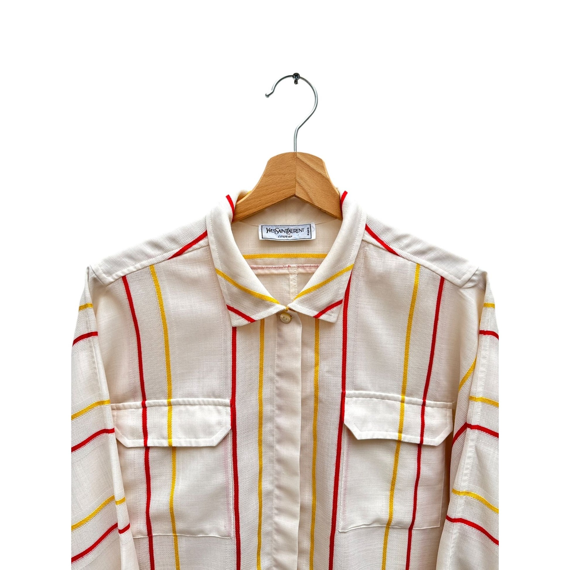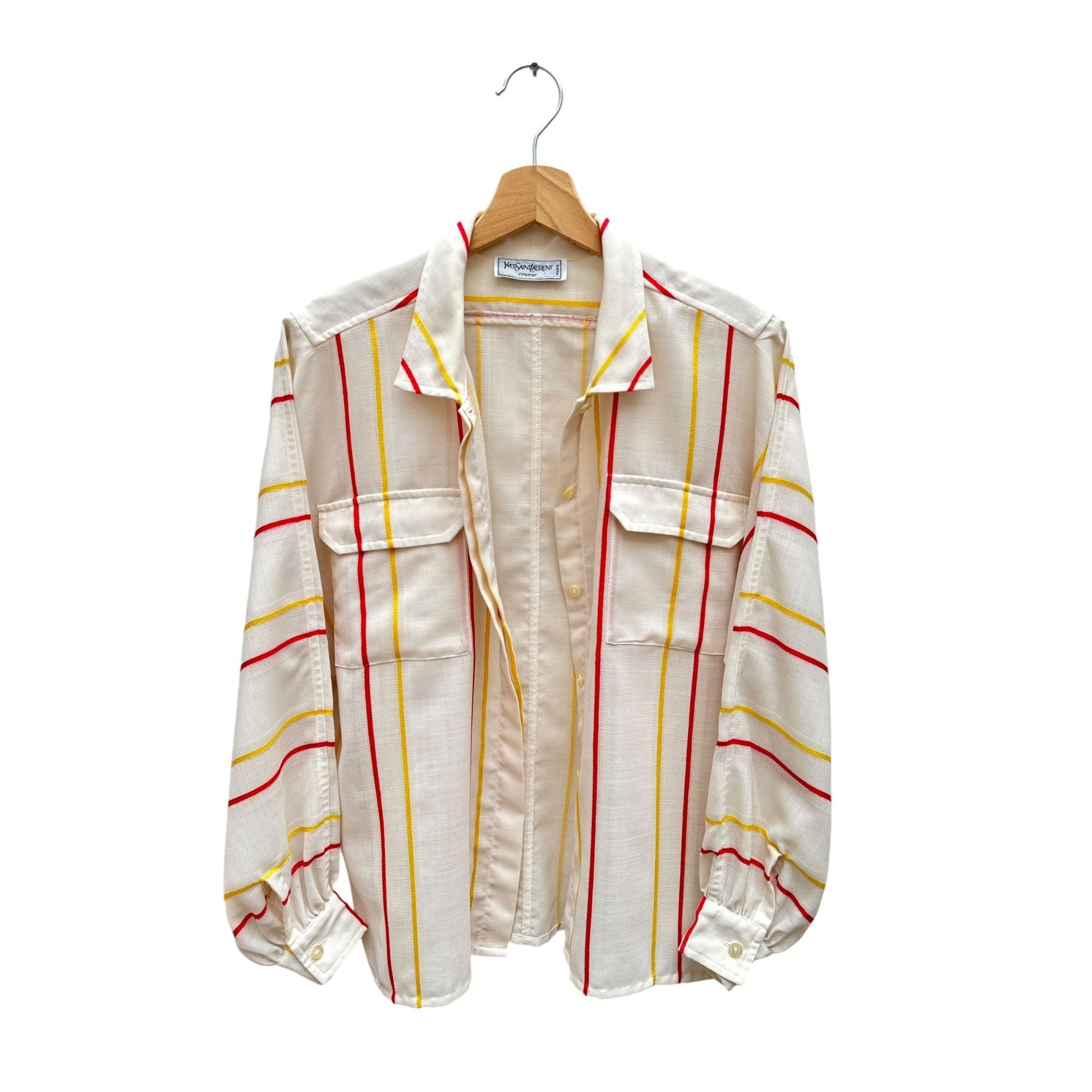 A striking vintage Yves Saint Laurent shirt, crafted from lightweight cotton with bold vertical stripes in red and yellow against a cream background. The structured yet relaxed silhouette reflects the brand’s refined tailoring, making it versatile for both casual and elevated styling.