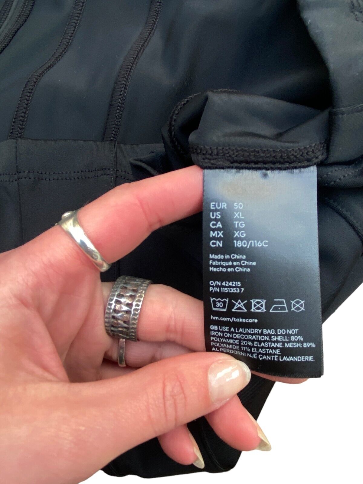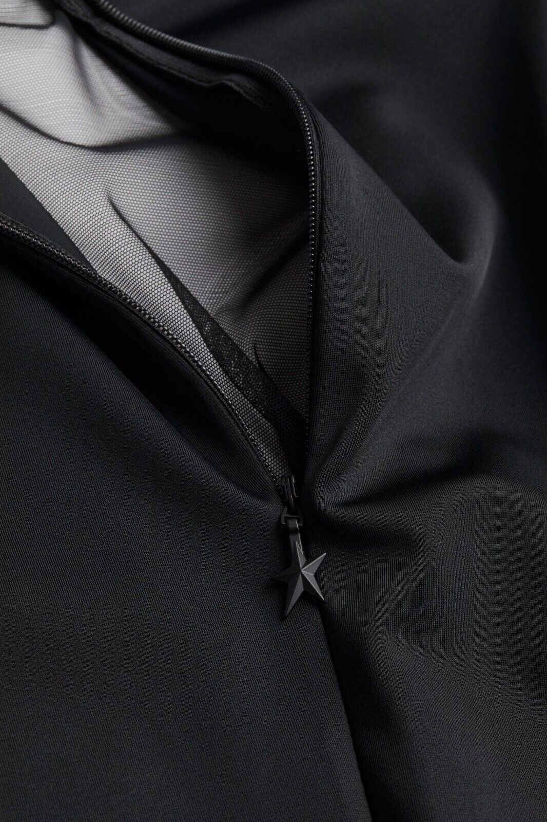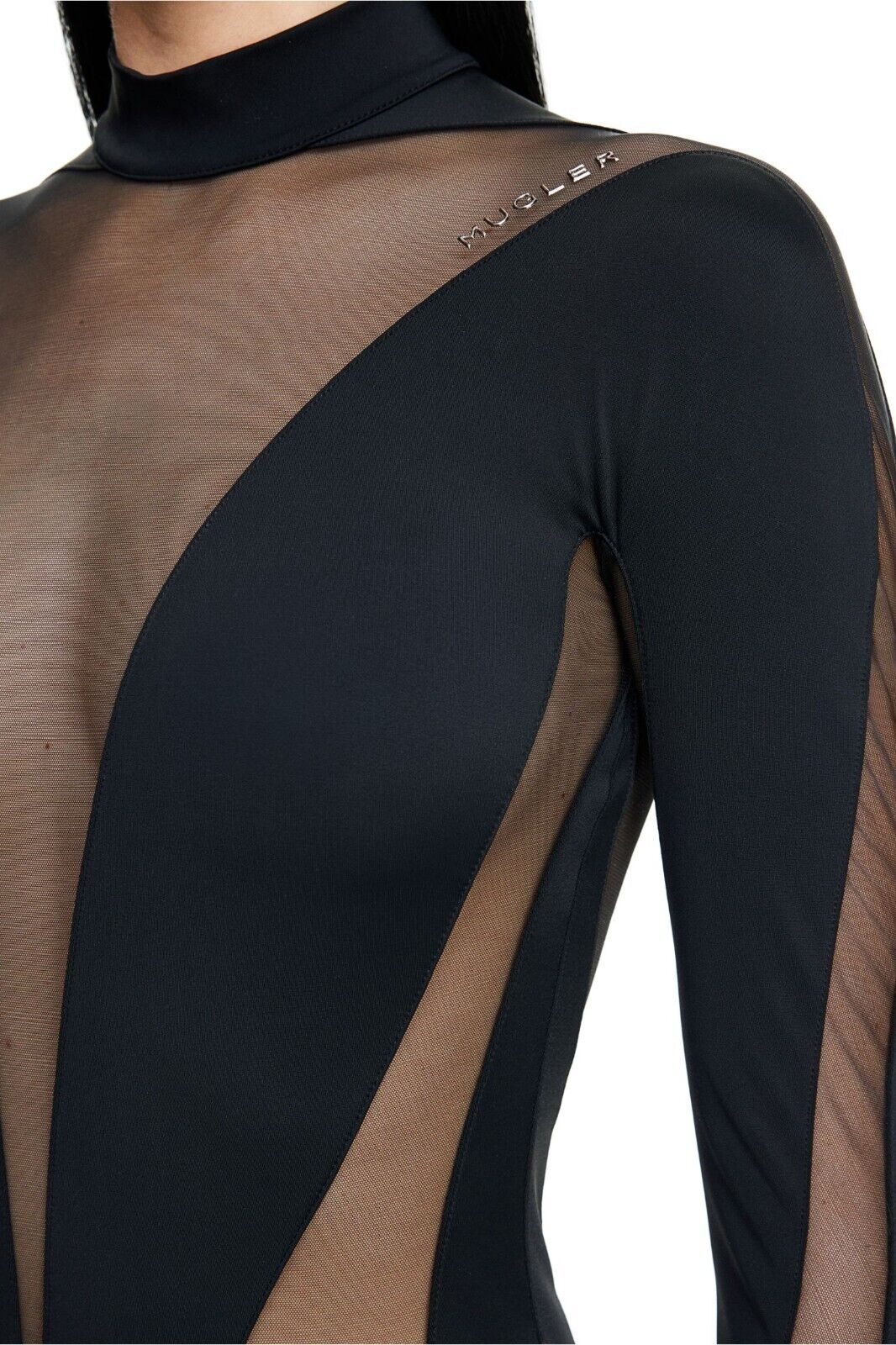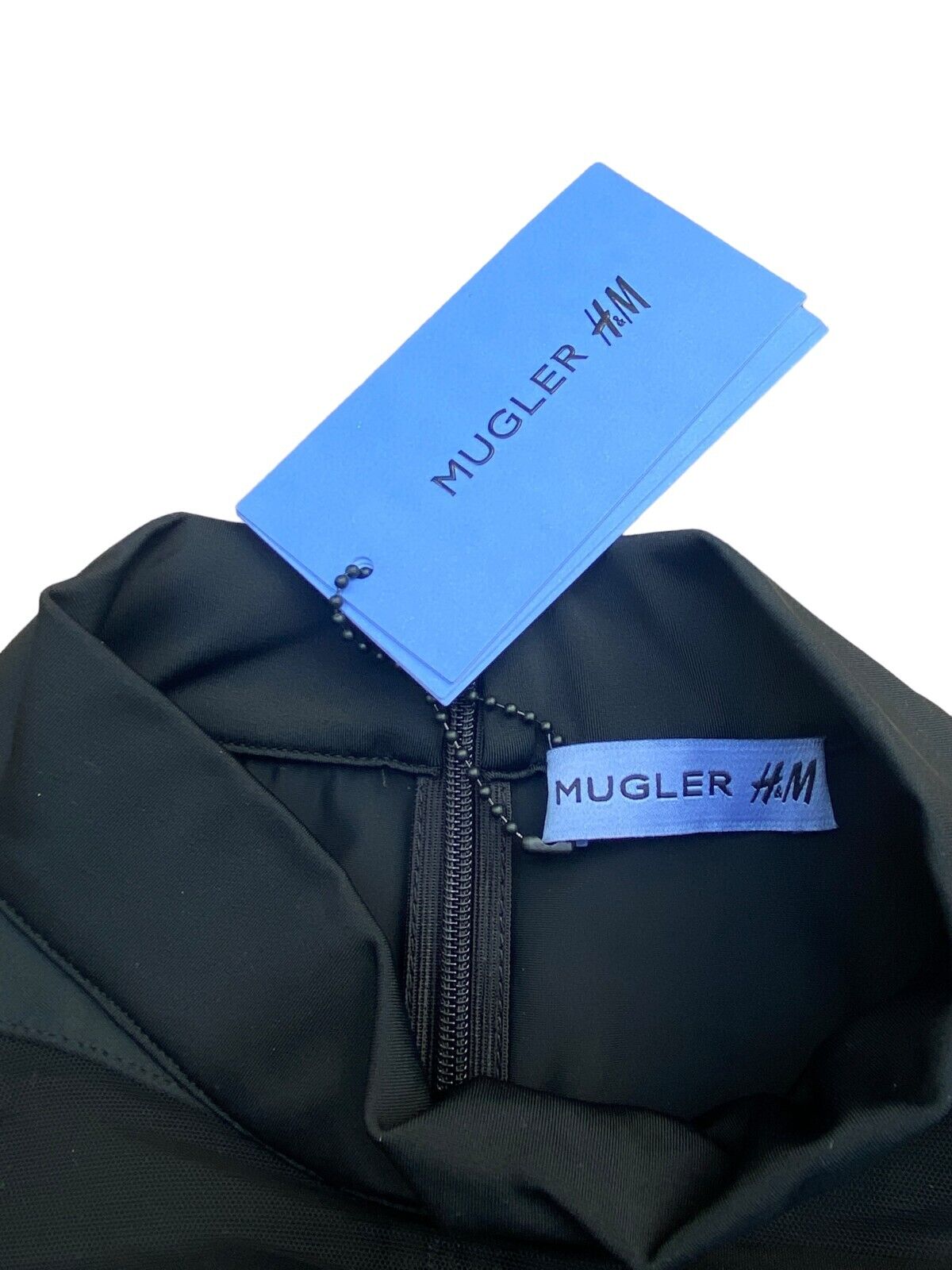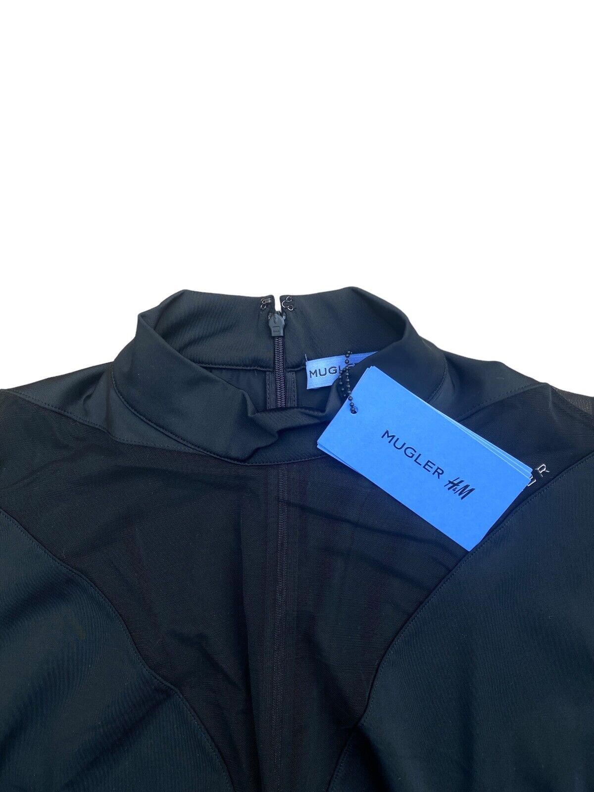 Mugler H&M. Fitted mini dress in stretch jersey with sculptural-effect transparent mesh panels and designer logo on front. High neckline with extra-long sleeves. Concealed hook and eye closure with star-shaped zipper pull.