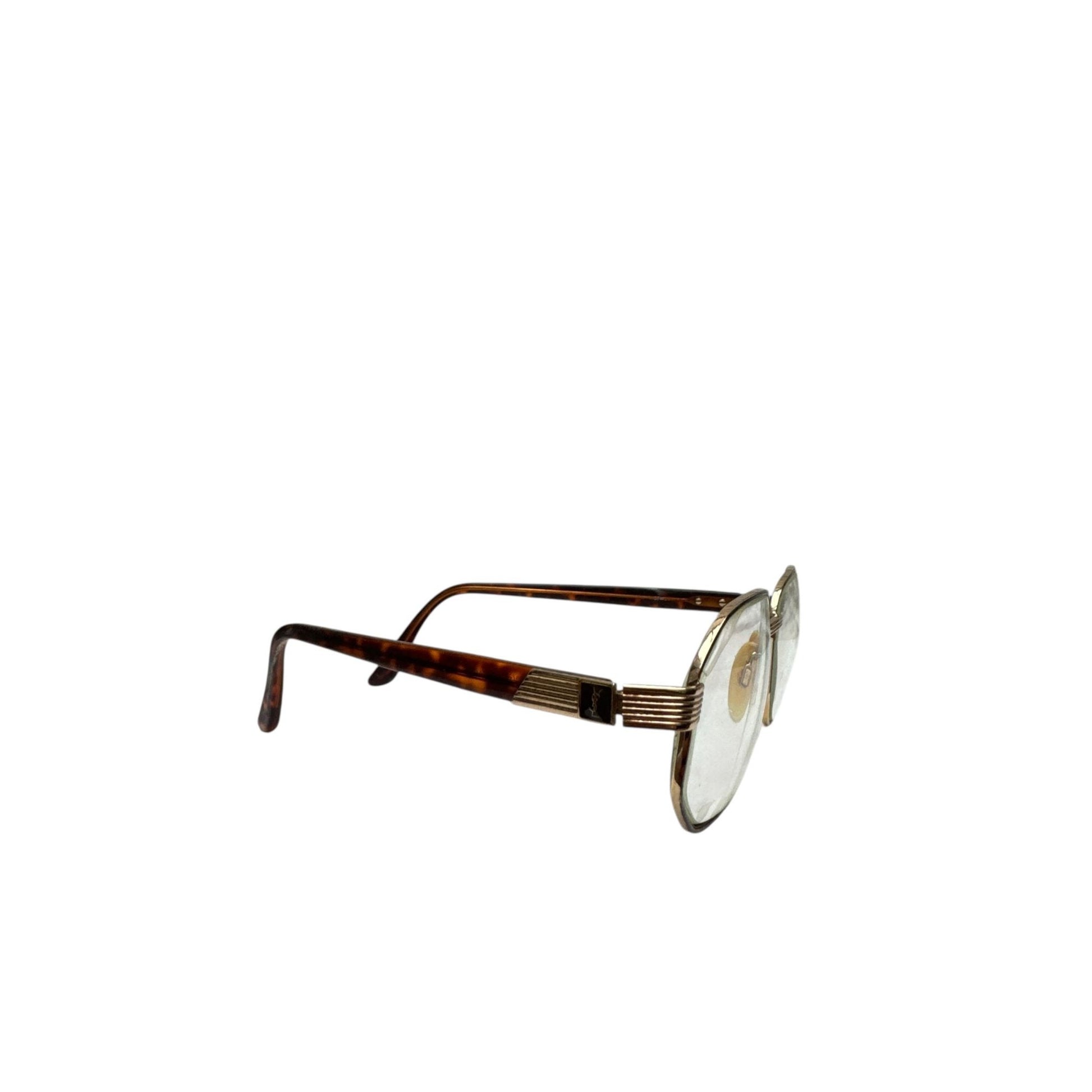 Authentic Yves Saint Laurent aviator glasses from the 1980s, featuring a classic gold-tone metal frame paired with tortoiseshell acetate temples. An iconic silhouette that perfectly captures the timeless elegance and bold design language of YSL eyewear from this era.