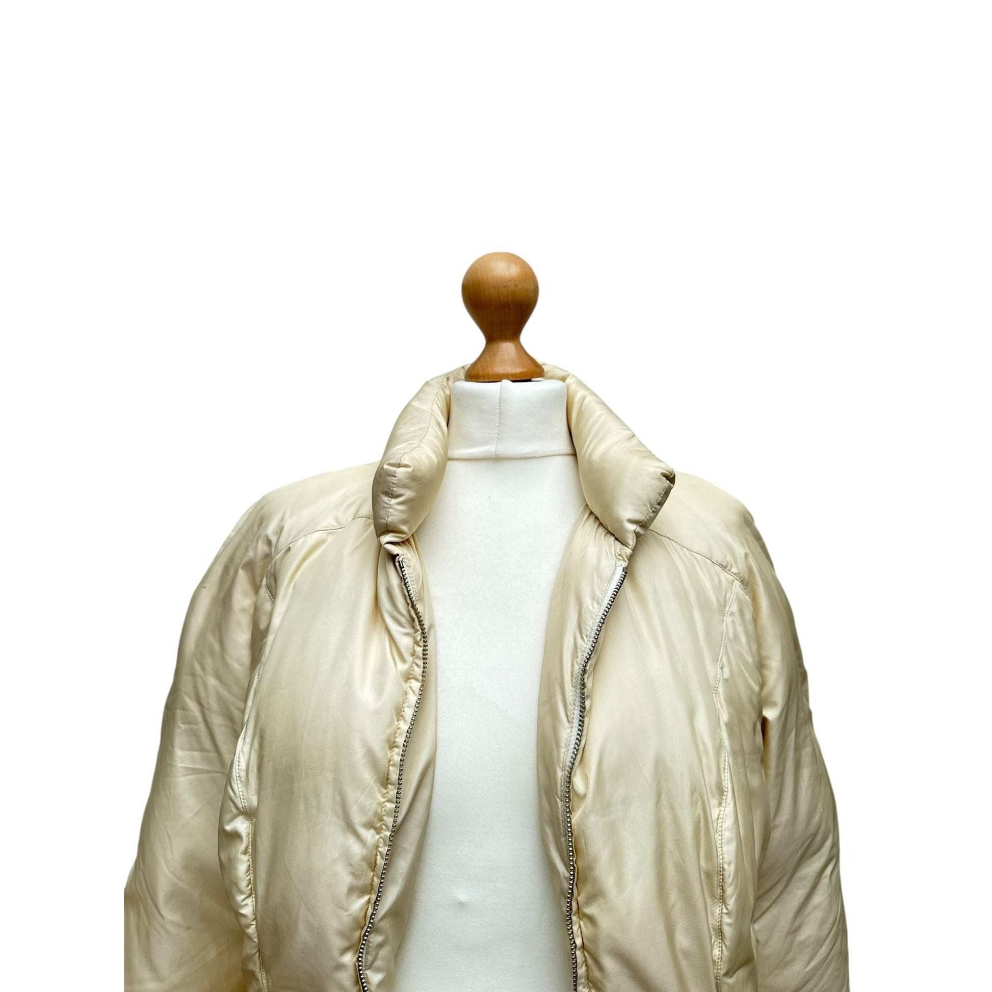 This rare Thierry Mugler puffer jacket is crafted in a beautiful beige-gold tone with a subtle satin sheen that elevates the classic outerwear silhouette into something truly refined. Designed with Mugler’s signature sculptural touch, the jacket cinches slightly at the waist, creating a flattering, structured shape while maintaining comfort and warmth.