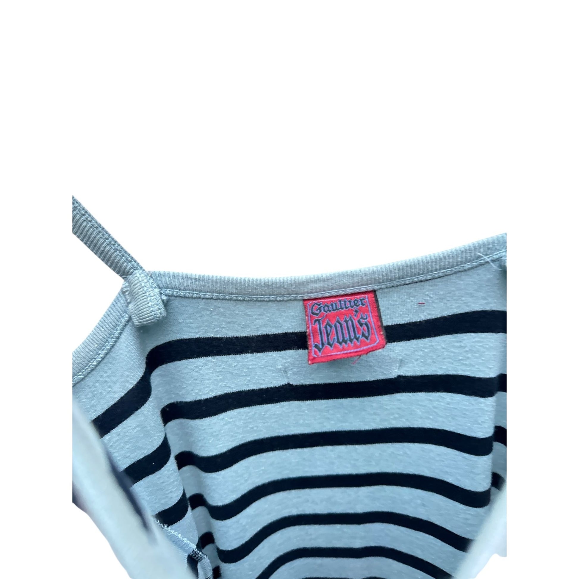 A striking vintage maxi dress from the Gaultier Jeans line, featuring horizontal blue and navy stripes with the iconic Eiffel Tower graphic print on the chest. Designed with thin straps, a V-neckline, and a body-hugging cut that falls to a long length with side slits for ease of movement. A playful yet refined piece that carries Jean Paul Gaultier’s signature Parisian edge.