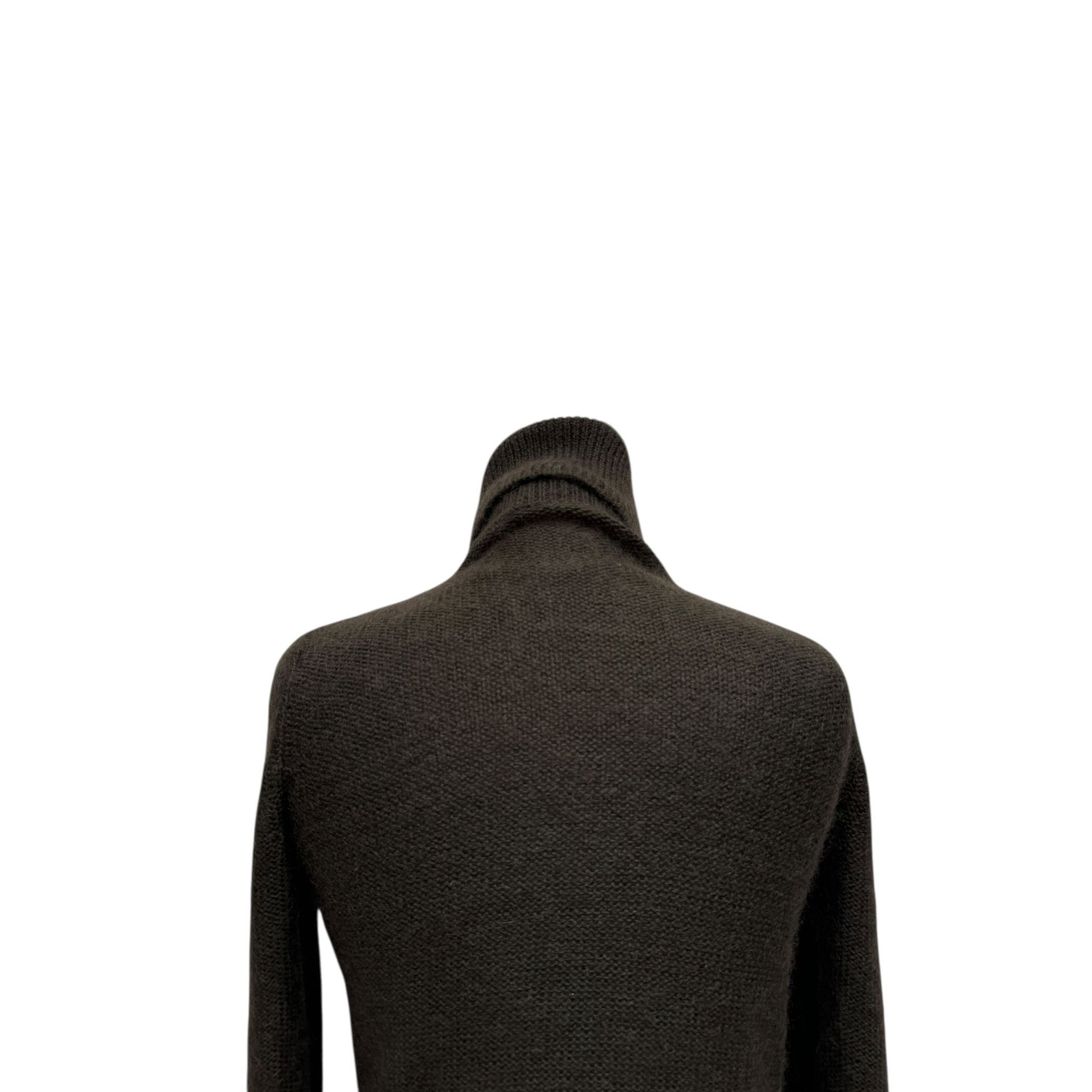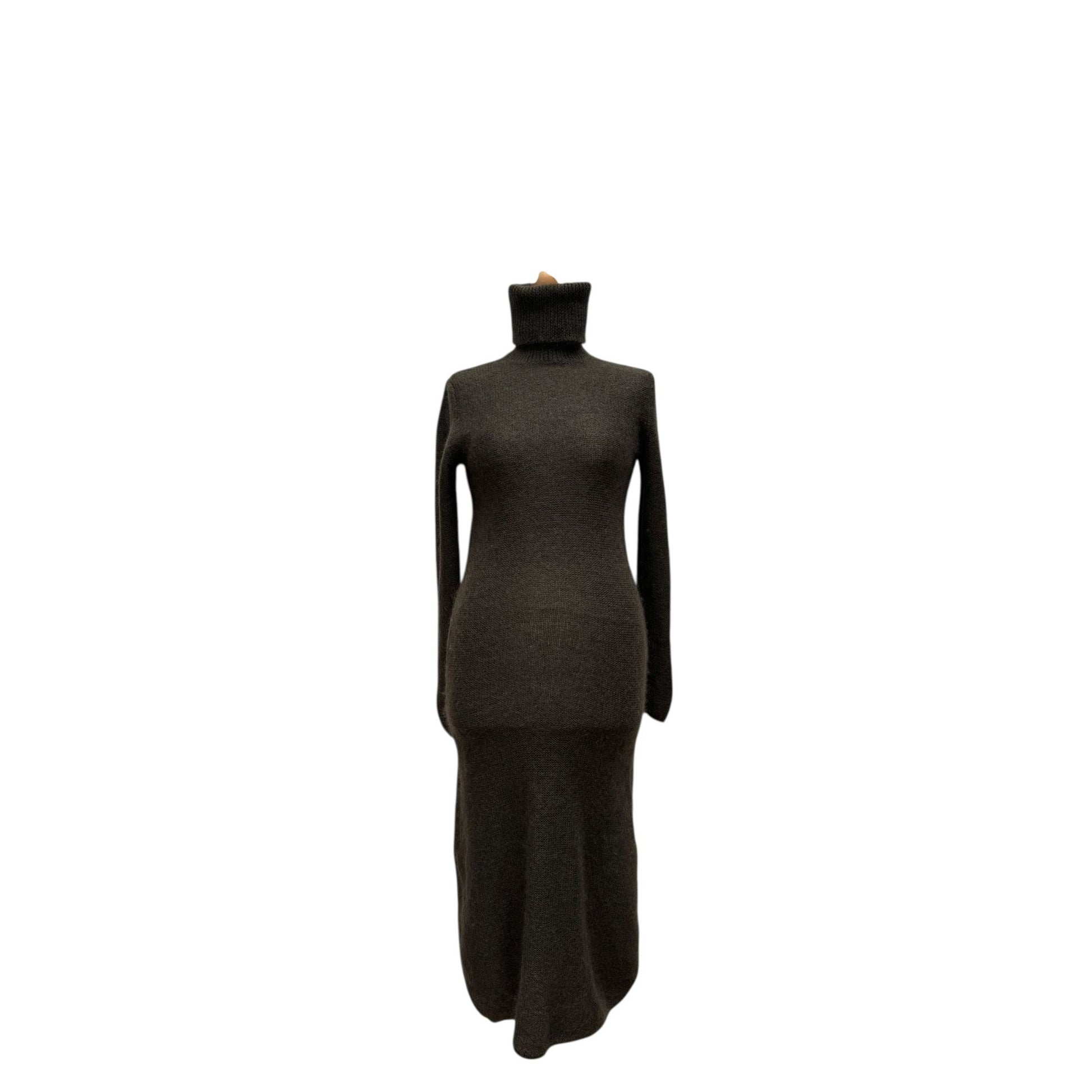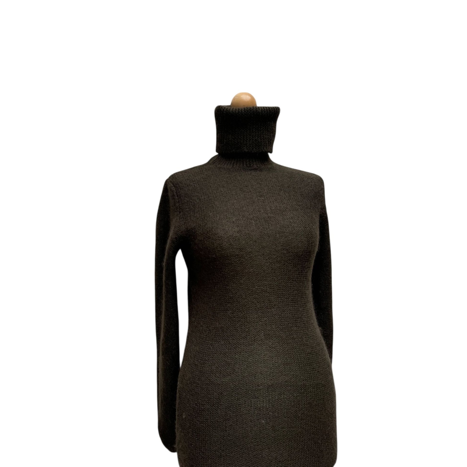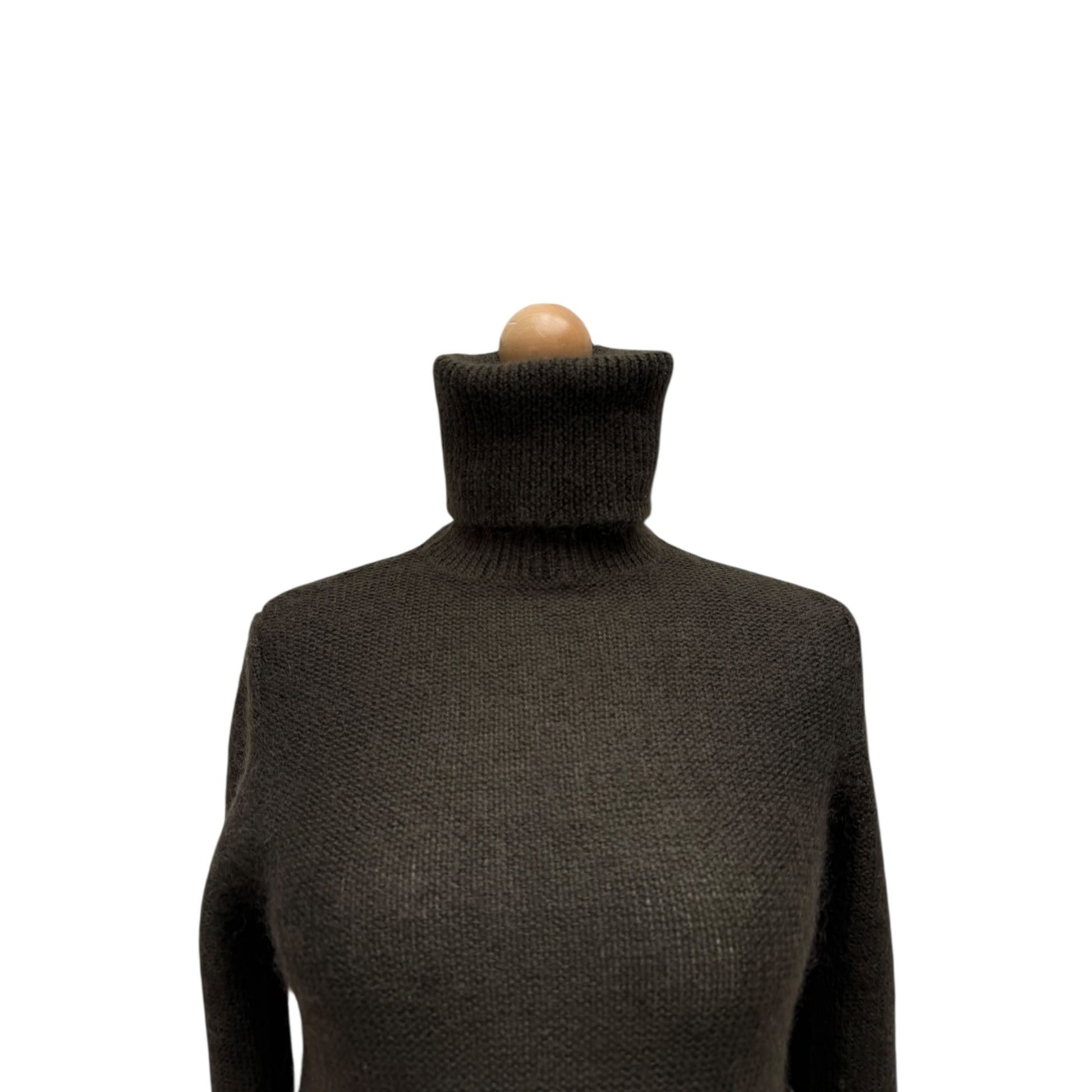 A striking example of Yves Saint Laurent’s mastery of timeless femininity, this vintage ribbed knit dress captures the effortless sophistication of the house’s early ready-to-wear collections. Crafted in France from 100% pure wool, the dress features a high turtleneck, long sleeves, and a body-skimming silhouette that elegantly drapes into a soft, fluid hemline.