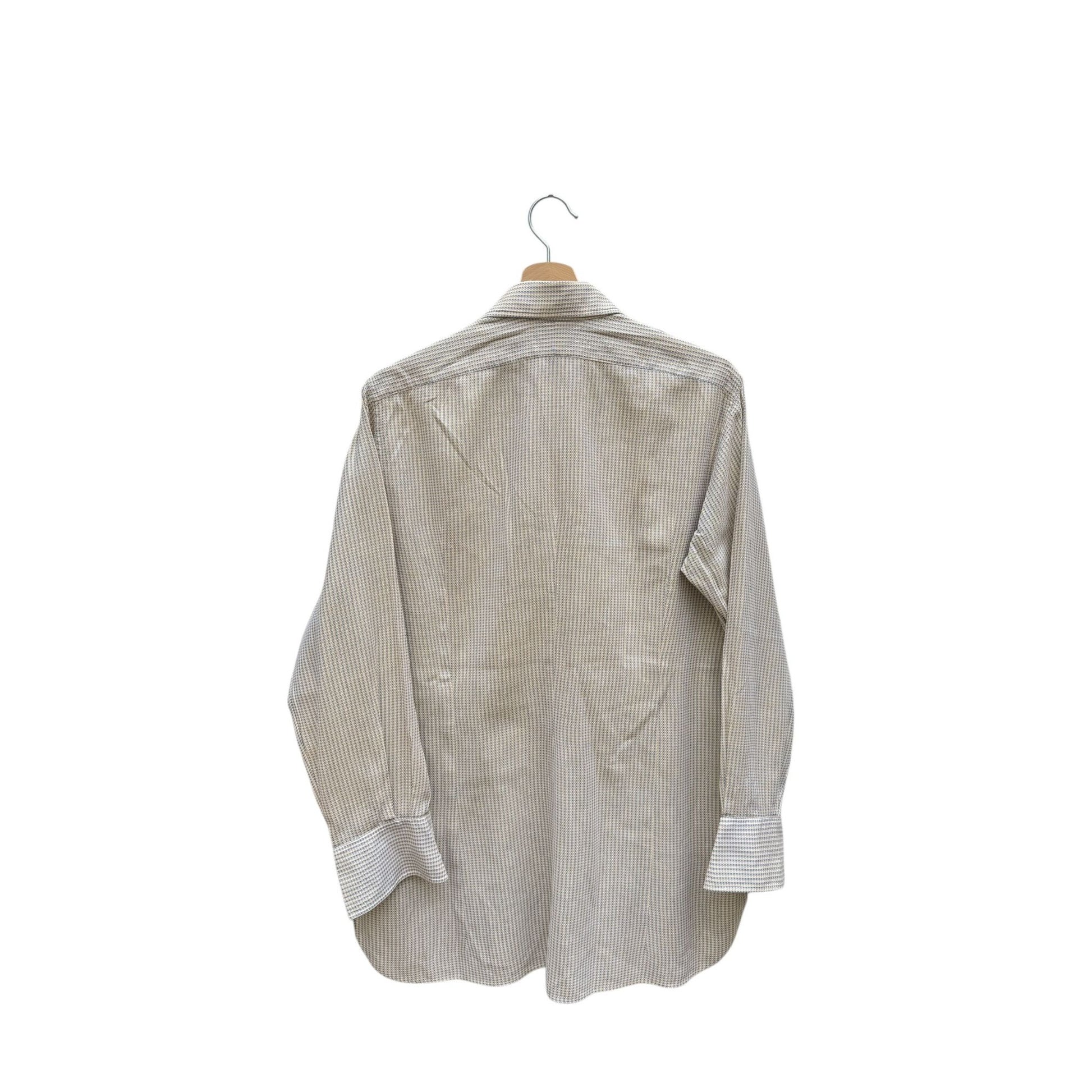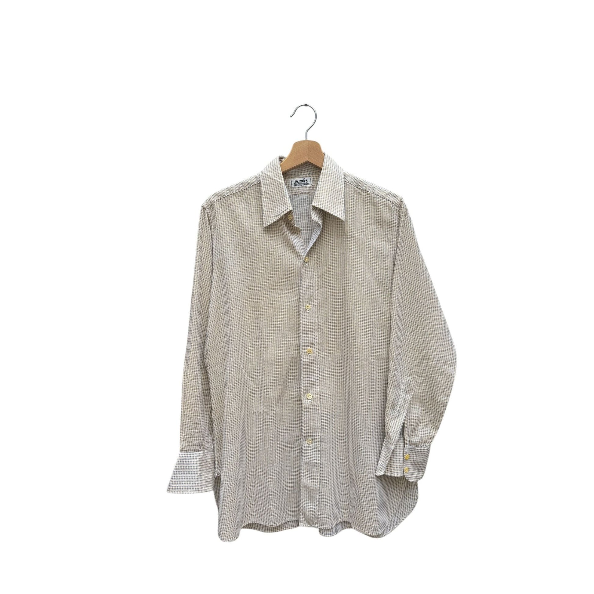 A refined vintage piece from Hermes Paris, showcasing the house’s timeless approach to tailoring and textile excellence. Made in France, this shirt features an intricate micro-check pattern woven in tones of soft blue, yellow, and off-white, creating a subtle yet sophisticated texture with a dimensional feel.