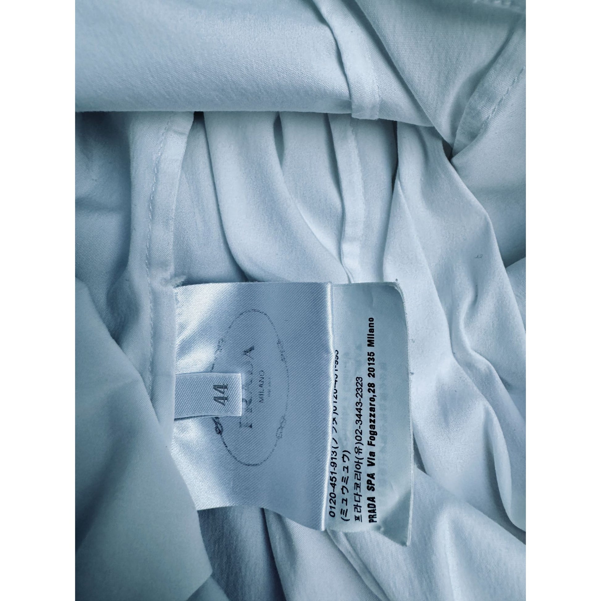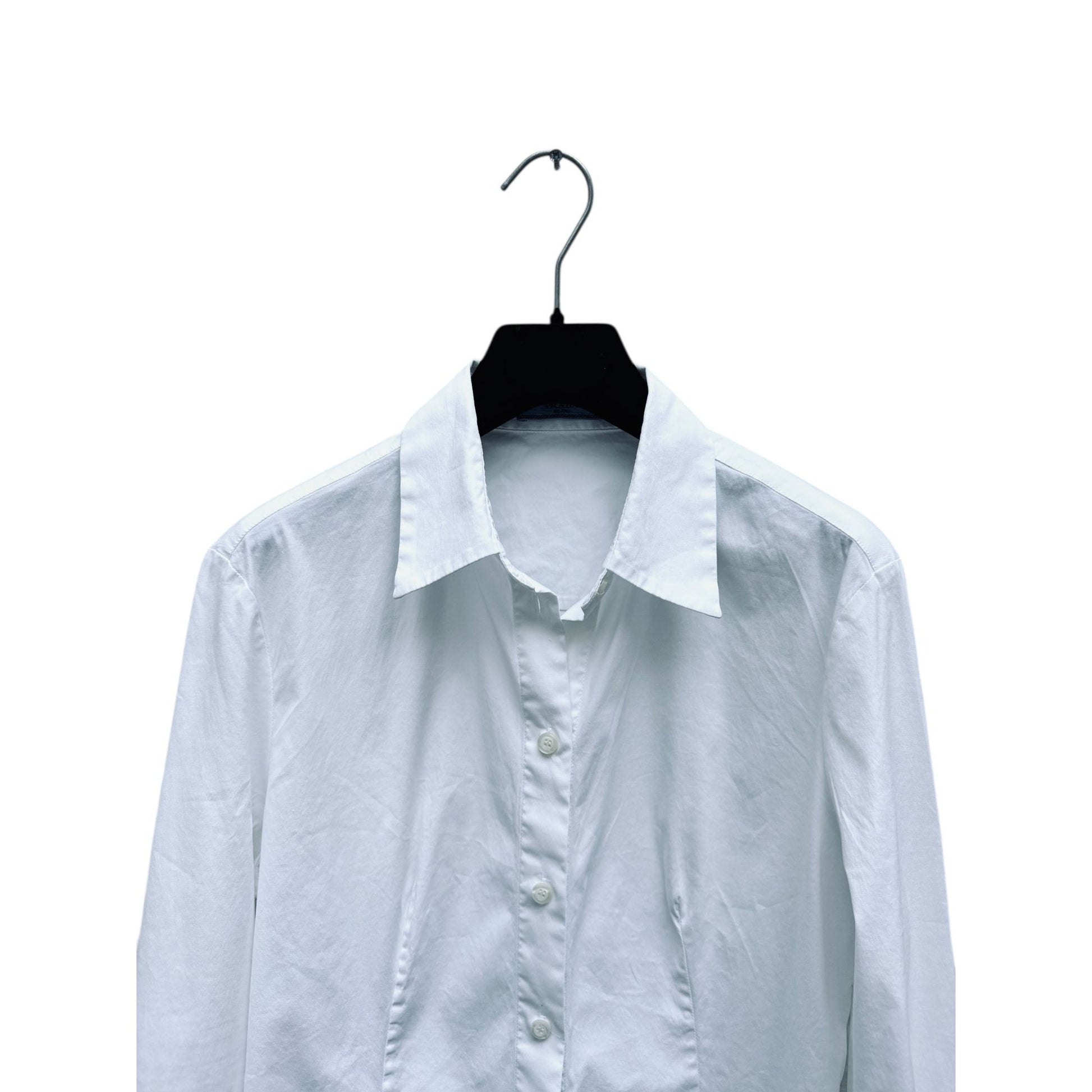 Beautiful minimalist white shirt from Prada, crafted in a crisp cotton-nylon-elastane blend that gives it a clean structure with subtle stretch. The silhouette is sharp and tailored, with a slightly elongated collar and refined stitched paneling along the front and back. A timeless wardrobe essential, elevated by Prada’s signature precision and fabrication.