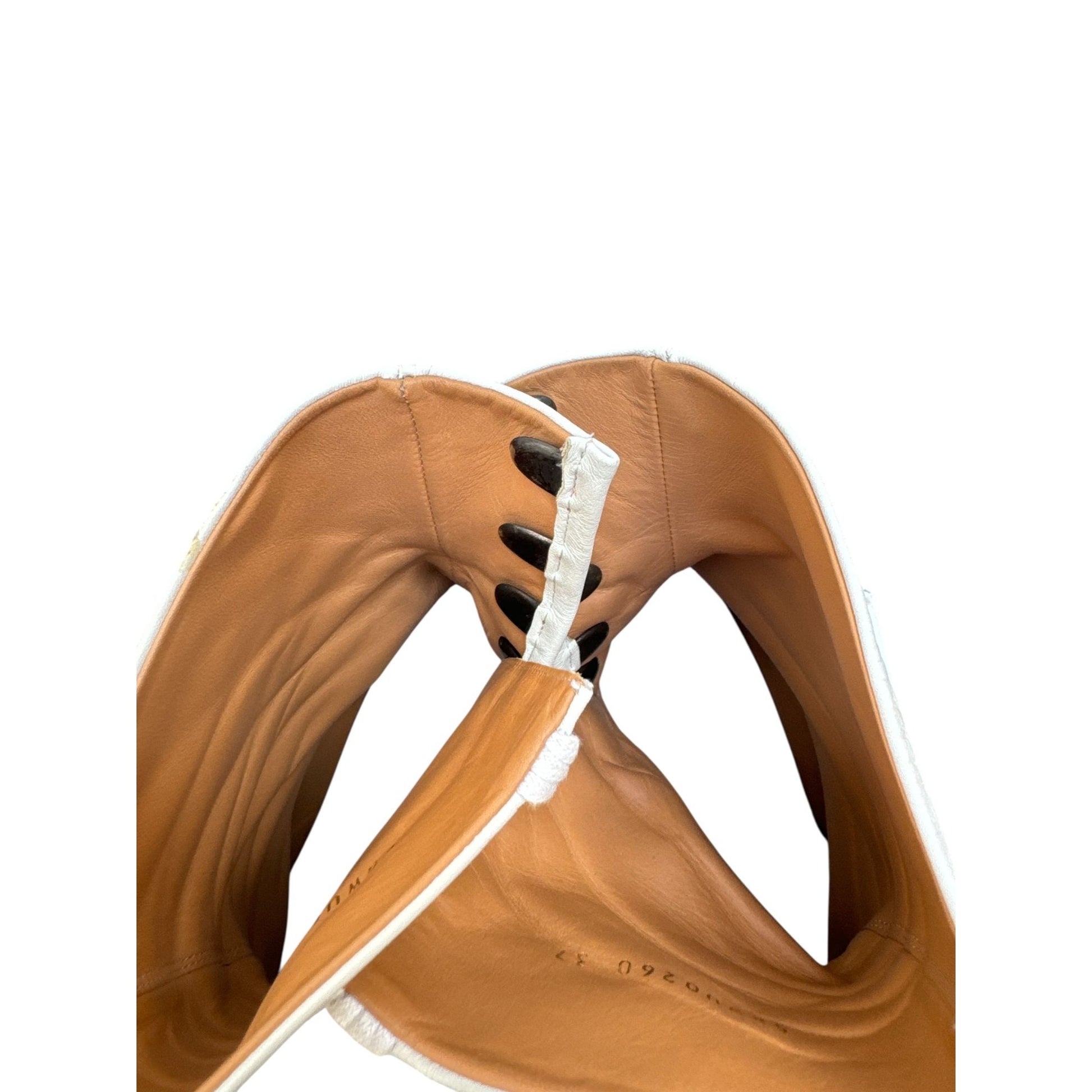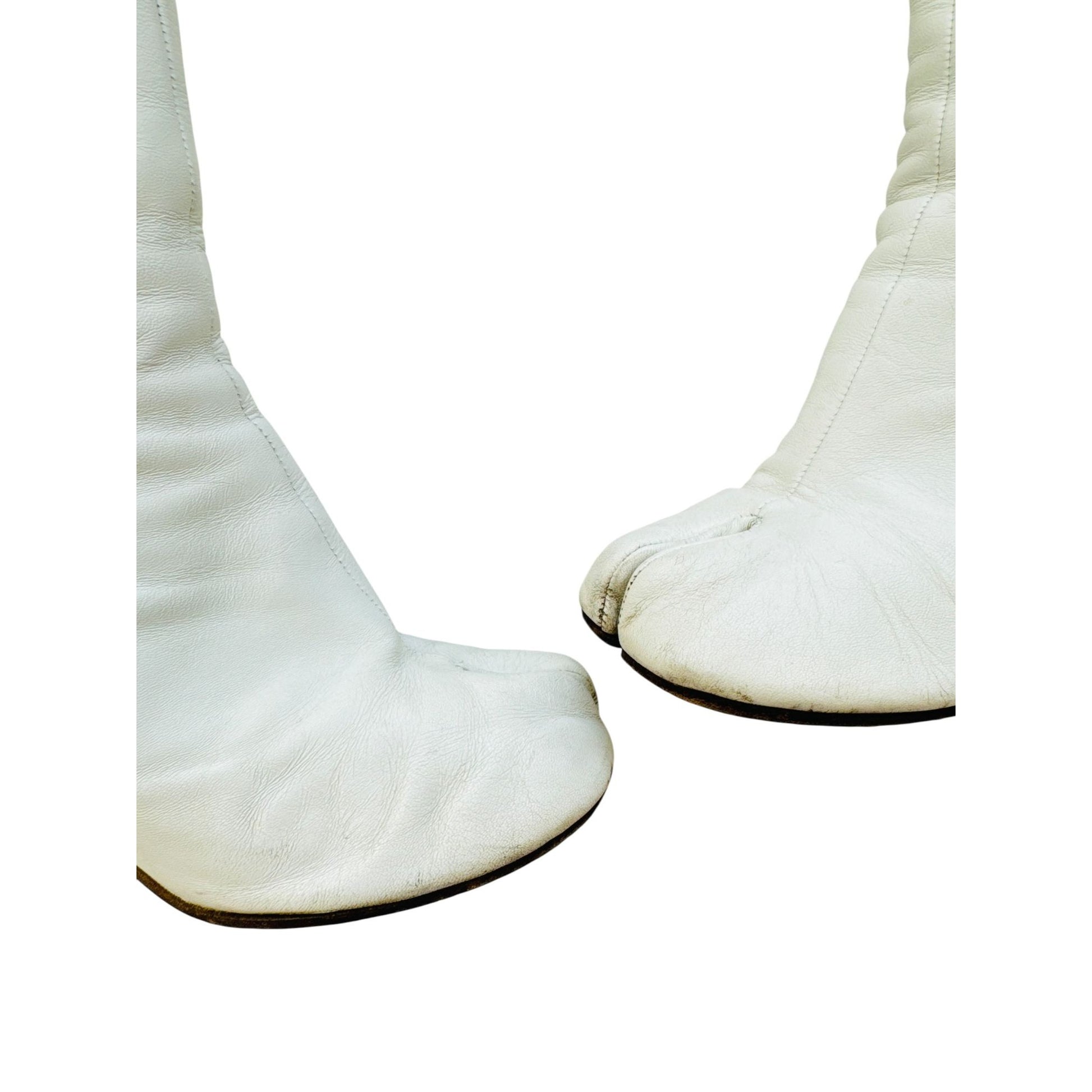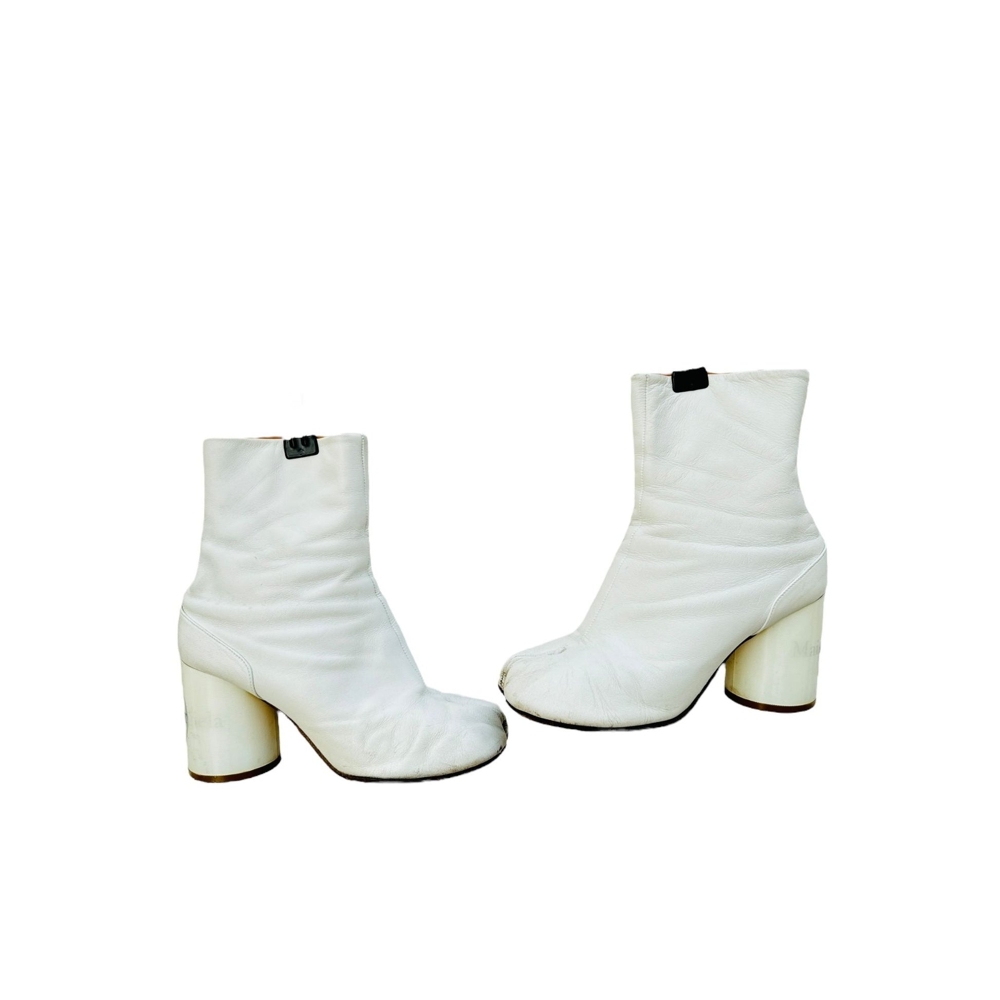 Maison Martin Margiela’s cult-favorite Tabi boots in soft white leather, featuring the house’s iconic split-toe silhouette. This pair is elevated with cylindrical heels that reveal shifting printed imagery on the back — the Maison’s Line 22 numeric logo appearing and disappearing depending on the angle of view.