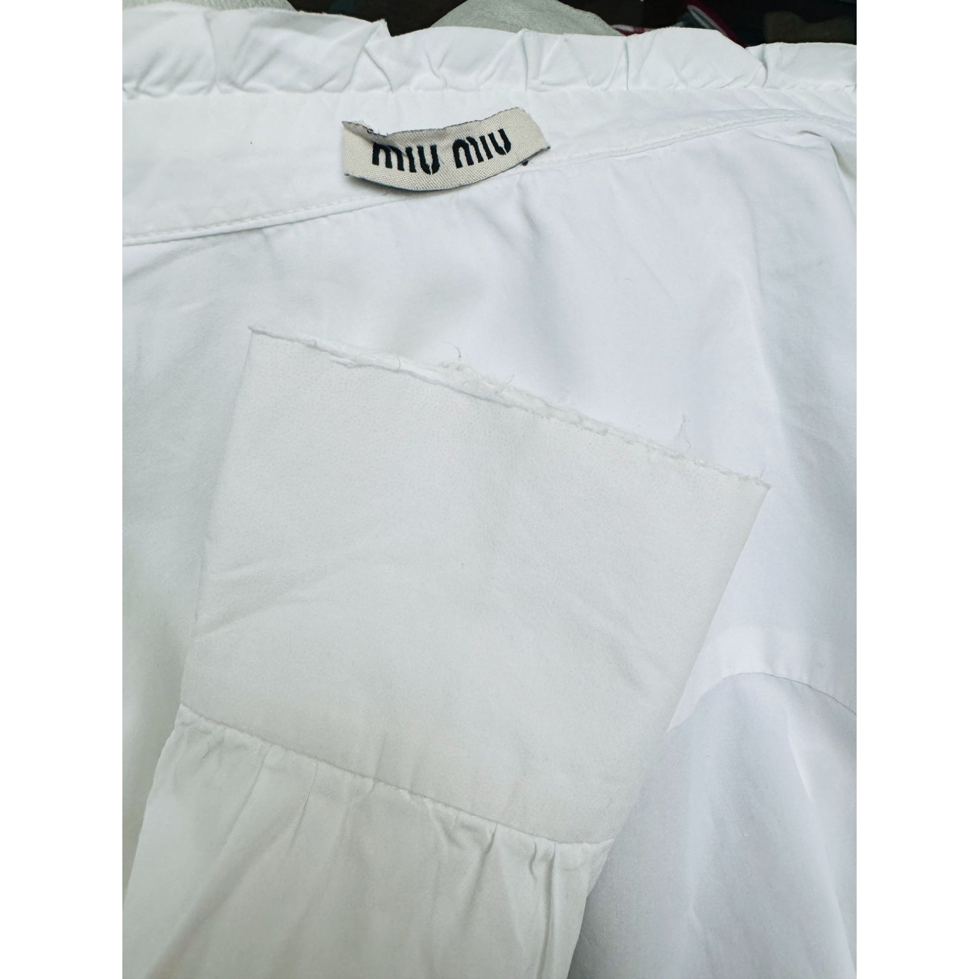 A timeless and sophisticated piece from Miu Miu, this crisp white cotton shirt features the brand’s signature exaggerated pointy collar for a sharp, modern twist on a wardrobe essential.