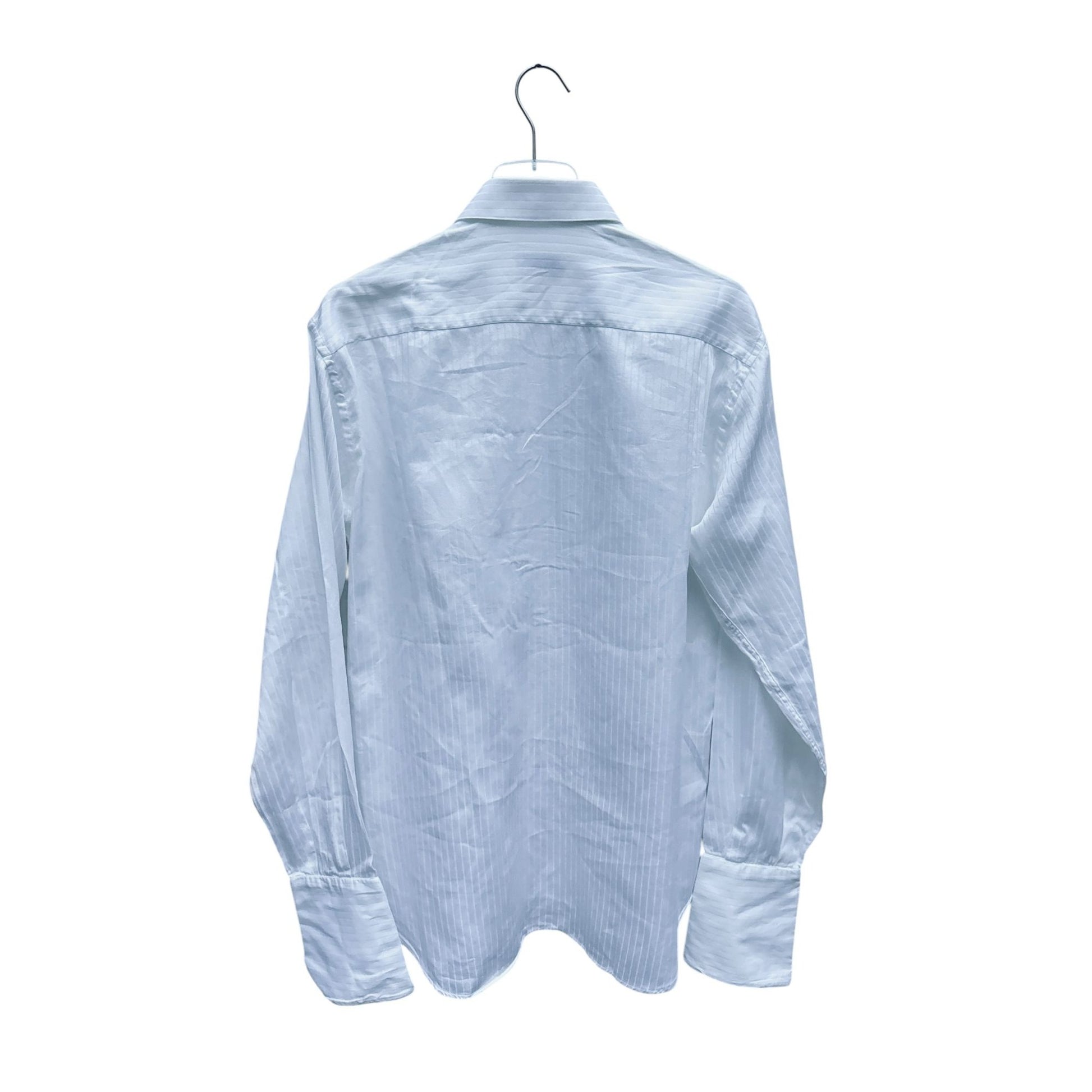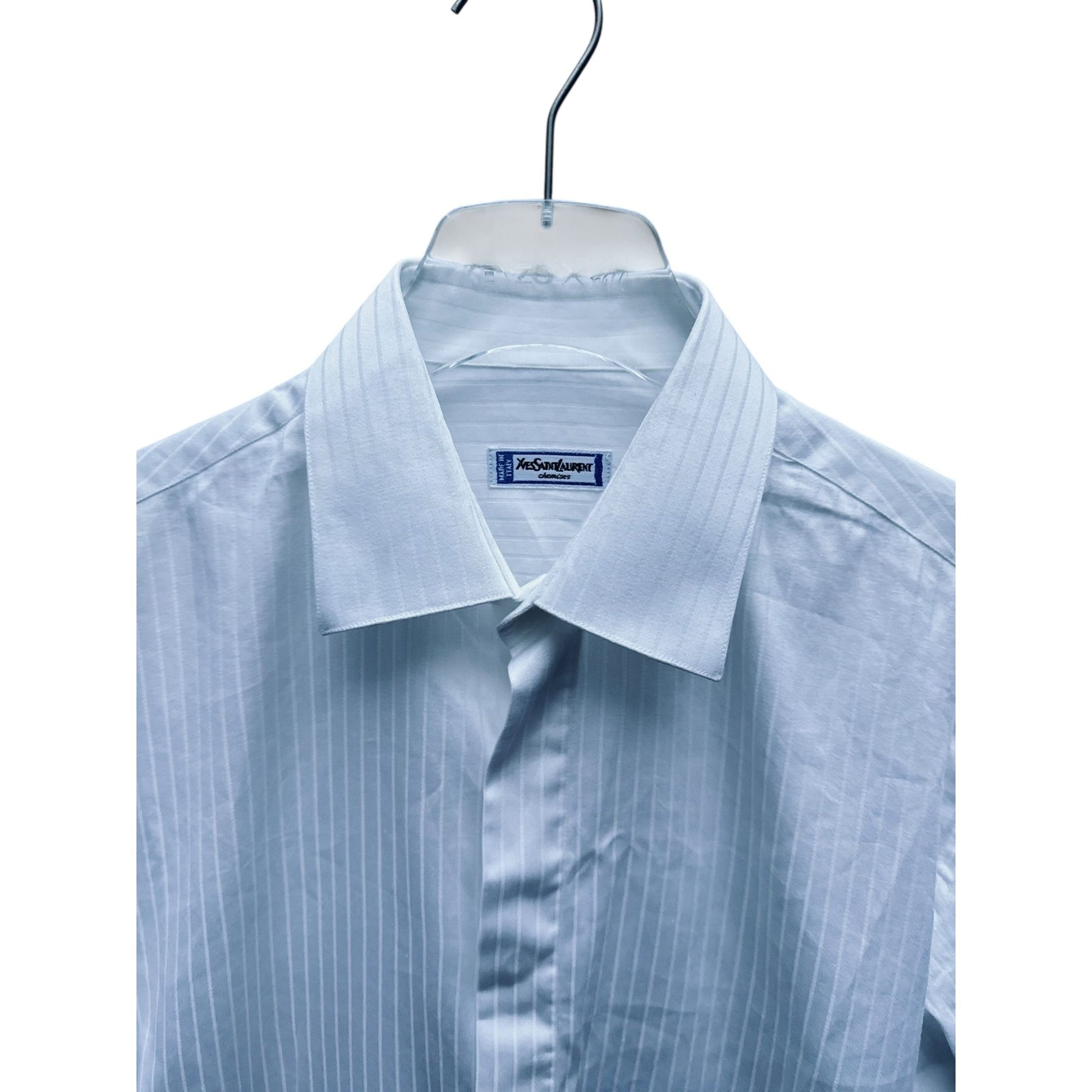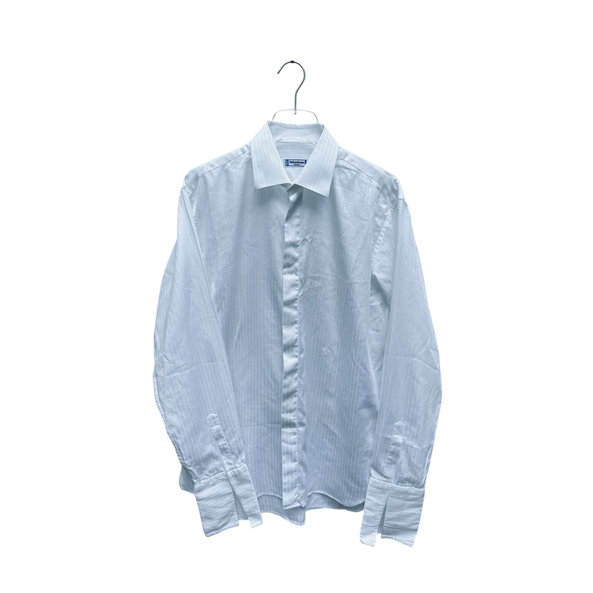 Classic Yves Saint Laurent men’s shirt in crisp white with subtle vertical stripes woven into the fabric. Features the iconic YSL embroidered monogram on the front for an understated luxury touch. Made in France, crafted from cotton.