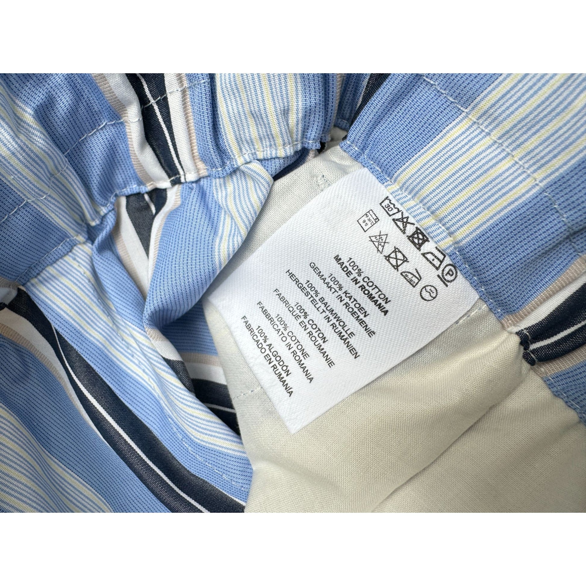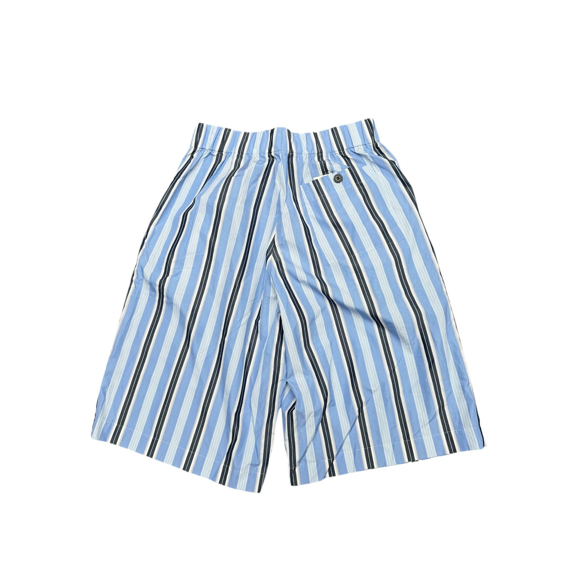 A striking pair of Dries Van Noten shorts showcasing the Belgian designer’s refined play with pattern and proportion. Crafted from 100% crisp cotton, the piece features a vertical stripe motif in shades of sky blue, navy, white, and beige, offering a fresh yet sophisticated palette reminiscent of classic summer tailoring.