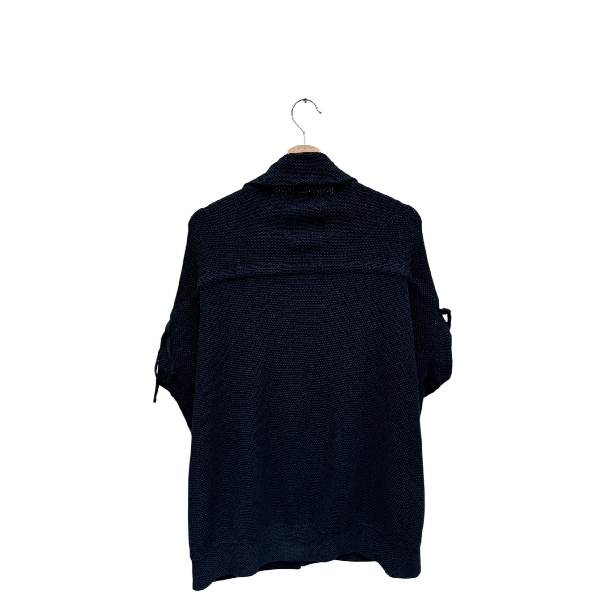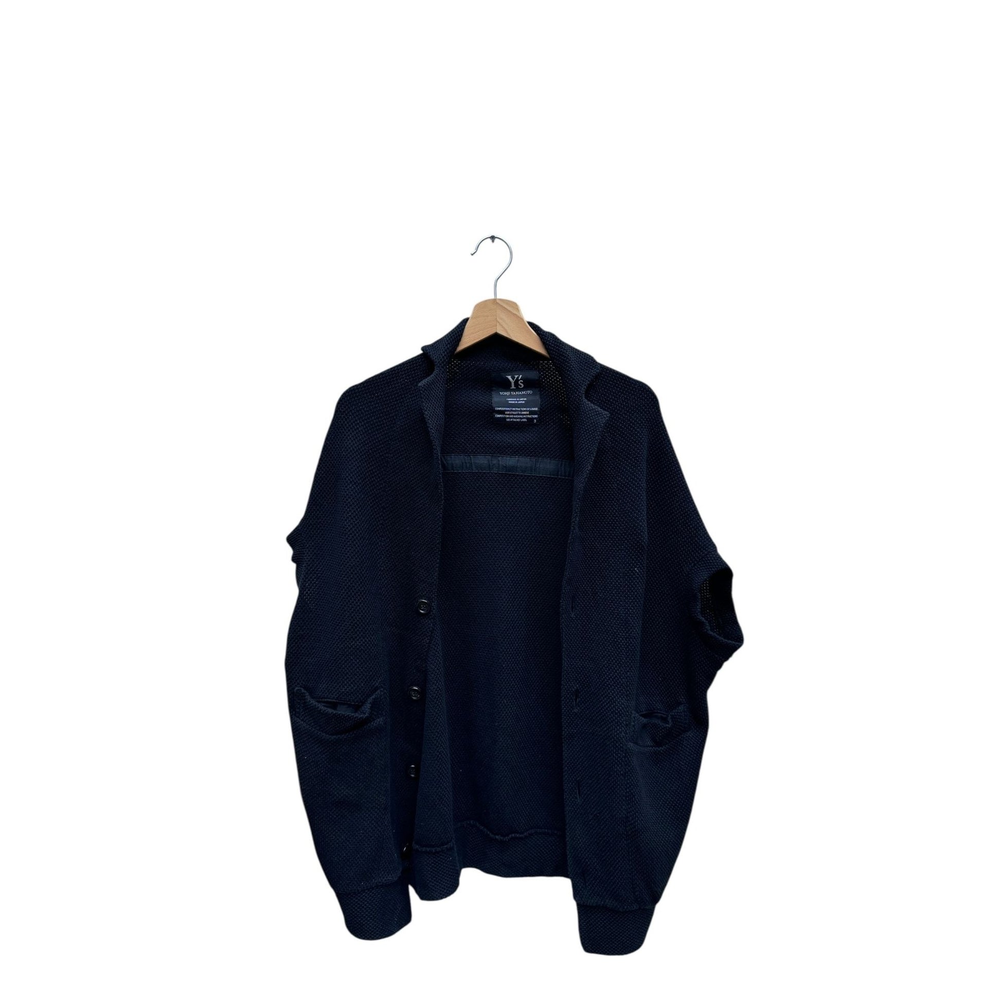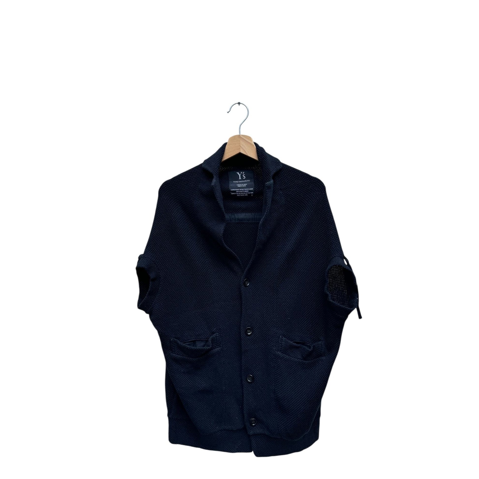 The jacket features a button-up front, notched lapel-inspired collar, and short sleeves with open underarm seams, creating an airy, layered silhouette that bridges the line between jacket and cardigan. Functional front patch pockets add a utilitarian touch, staying true to Yamamoto’s balance of practicality and artistic form.