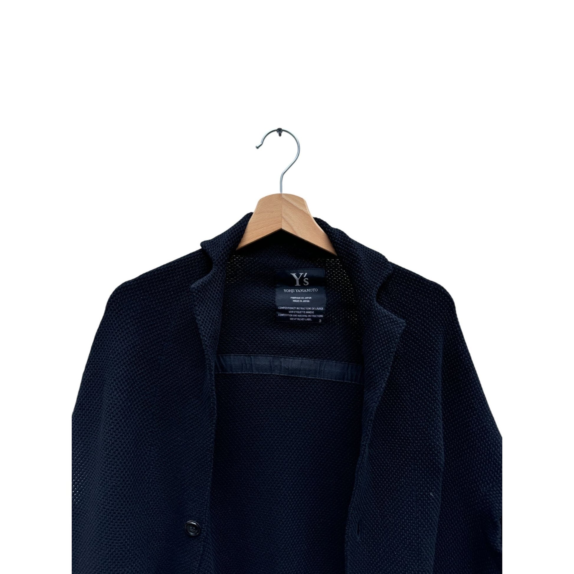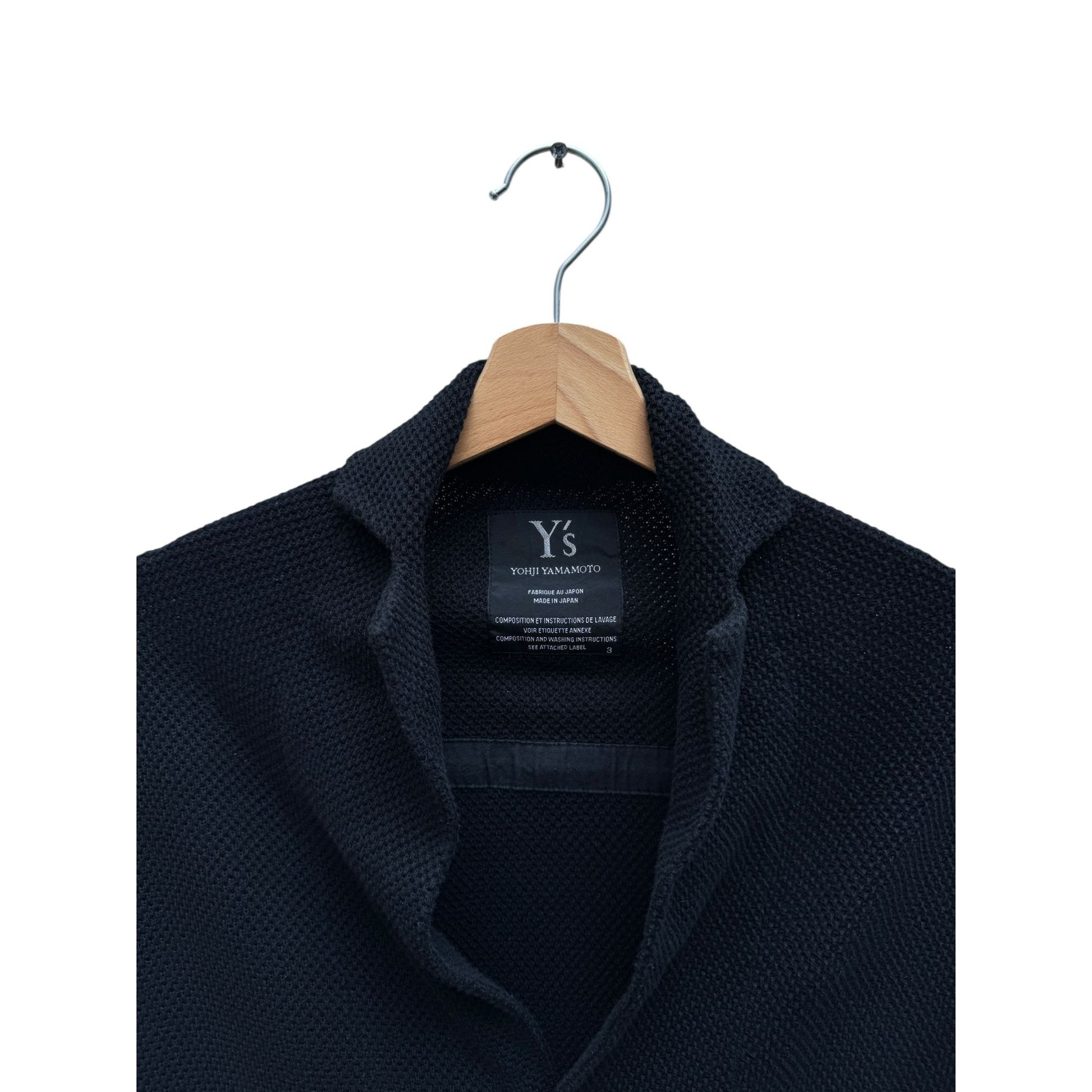 Minimal yet textural, this Yohji Yamamoto Y’s black jacket embodies the designer’s mastery of avant-garde tailoring with a relaxed, deconstructed sensibility. Crafted in 100% cotton knit, the piece offers both structure and fluidity, with a woven waffle-like texture that enhances depth while maintaining breathability.
