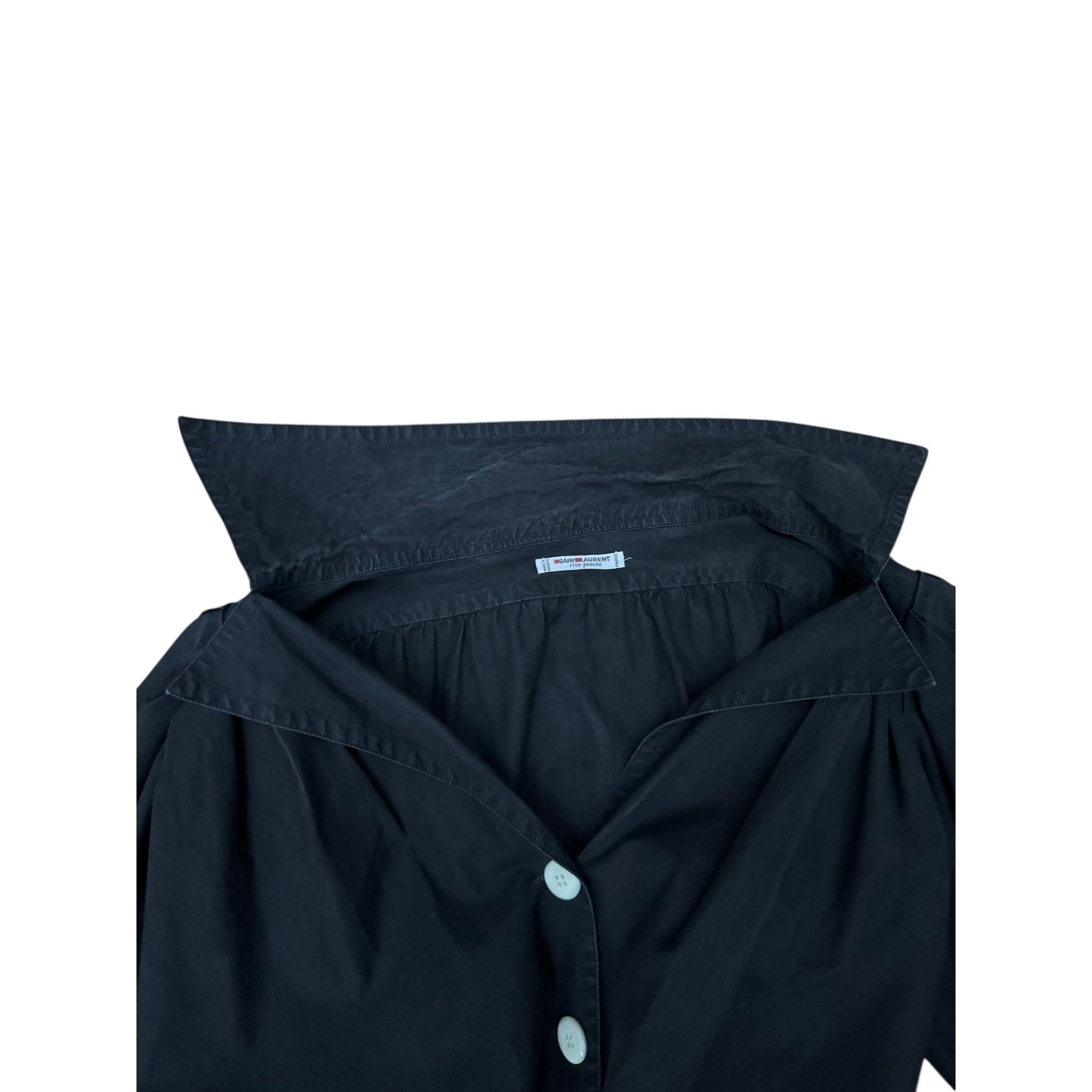 Elegant and timeless Yves Saint Laurent Paris black cotton shirt, showcasing the house’s signature sophisticated tailoring with subtle statement details. Crafted from crisp, breathable cotton, this piece features softly puffed shoulders that add gentle volume and structure, creating a refined silhouette with a discreetly dramatic touch.